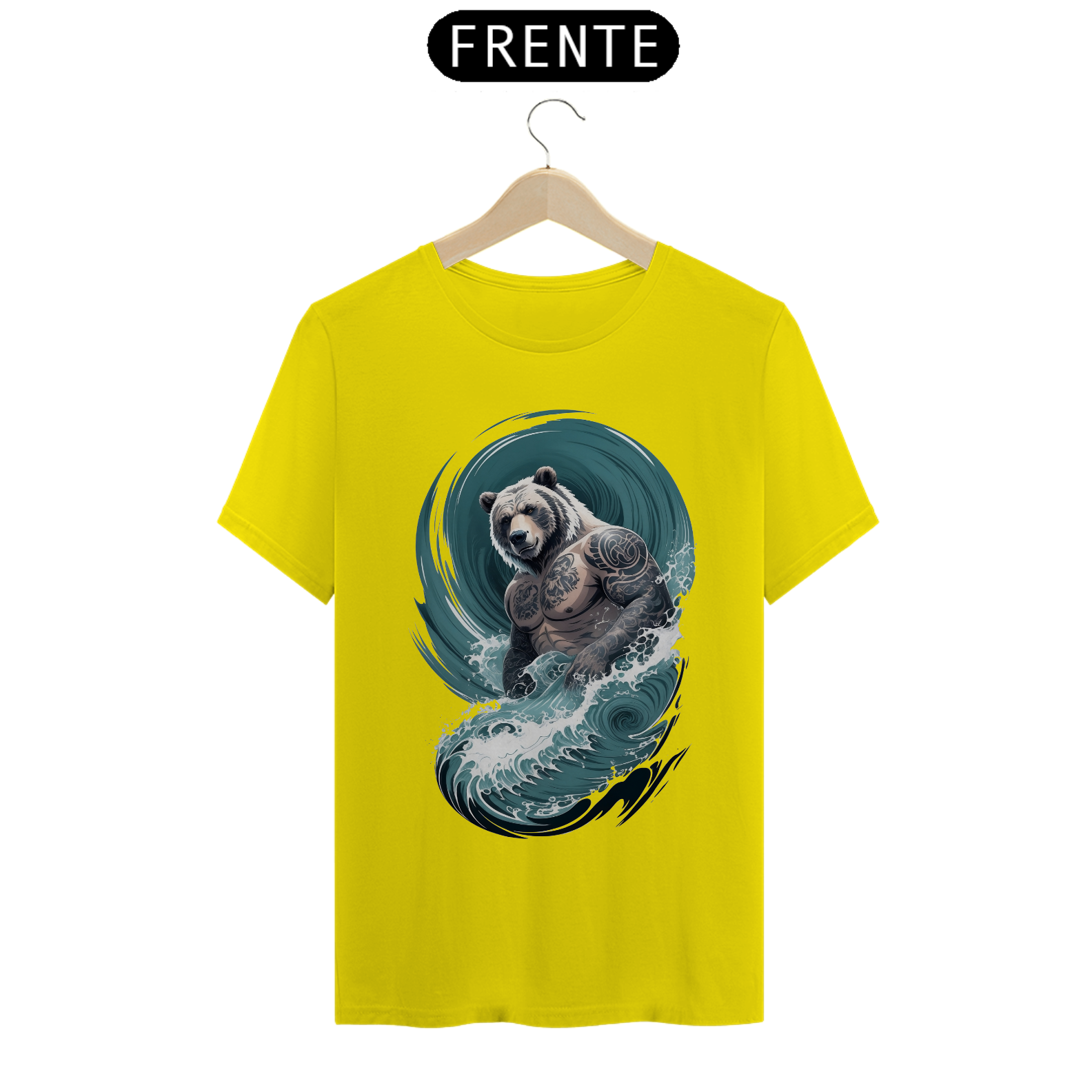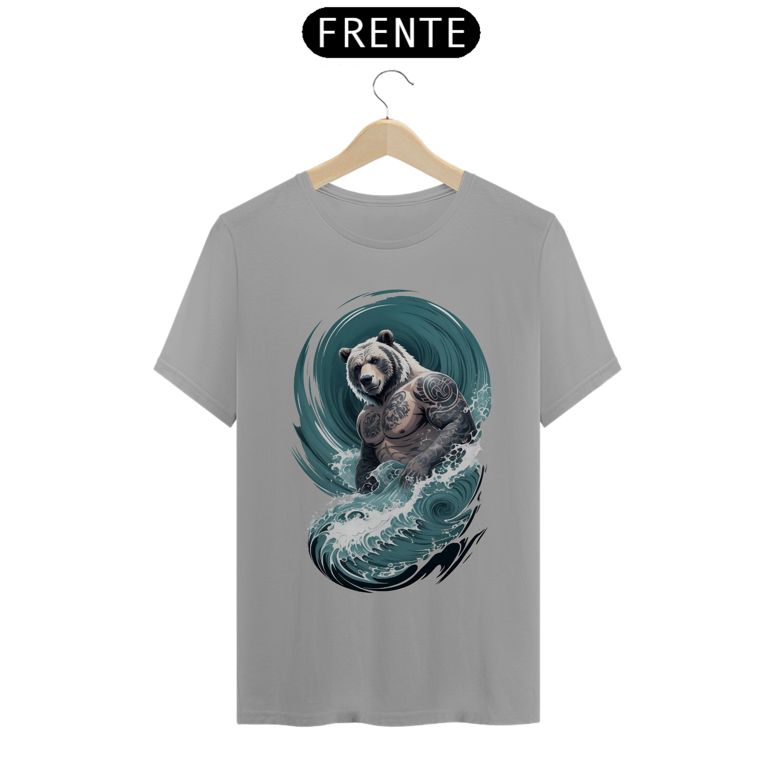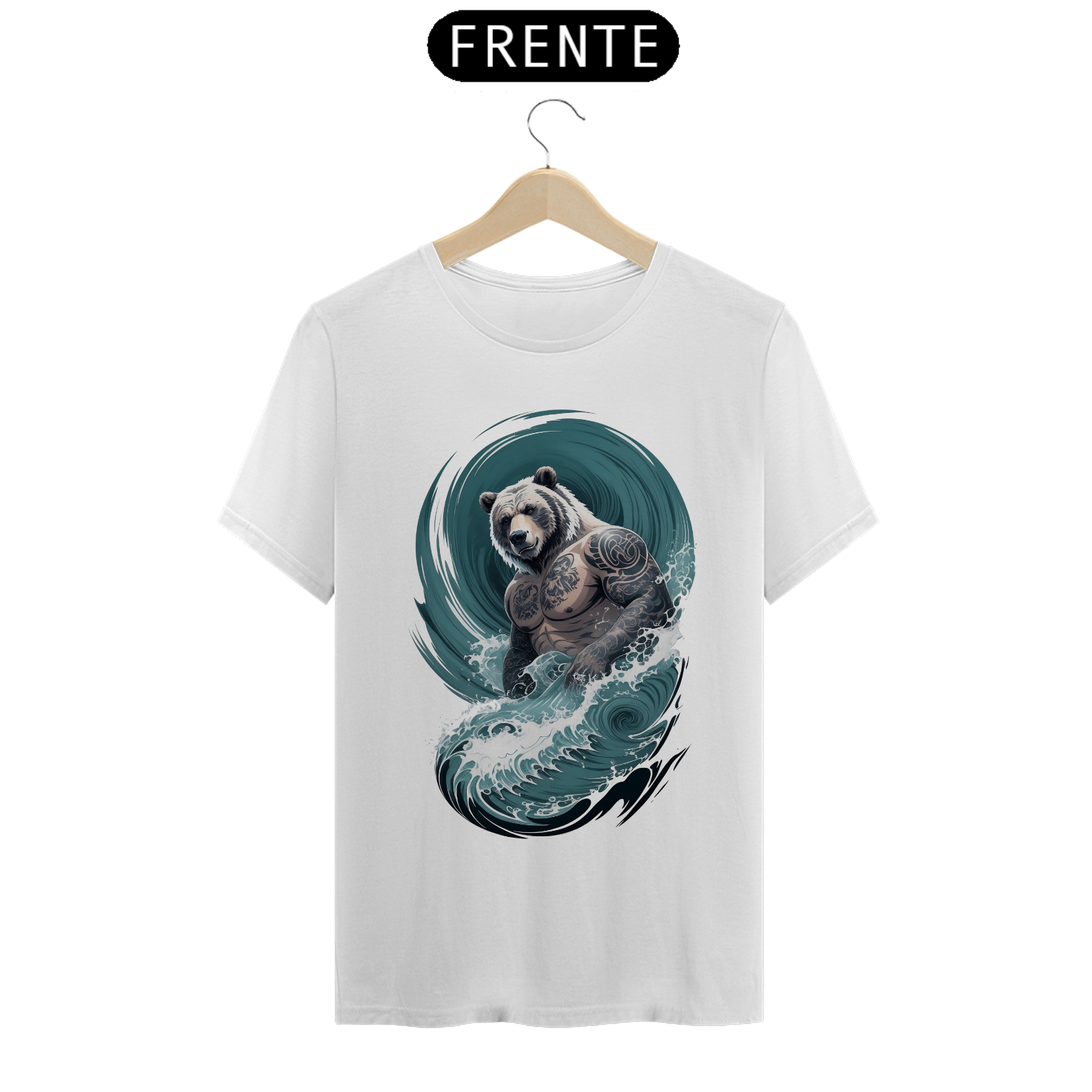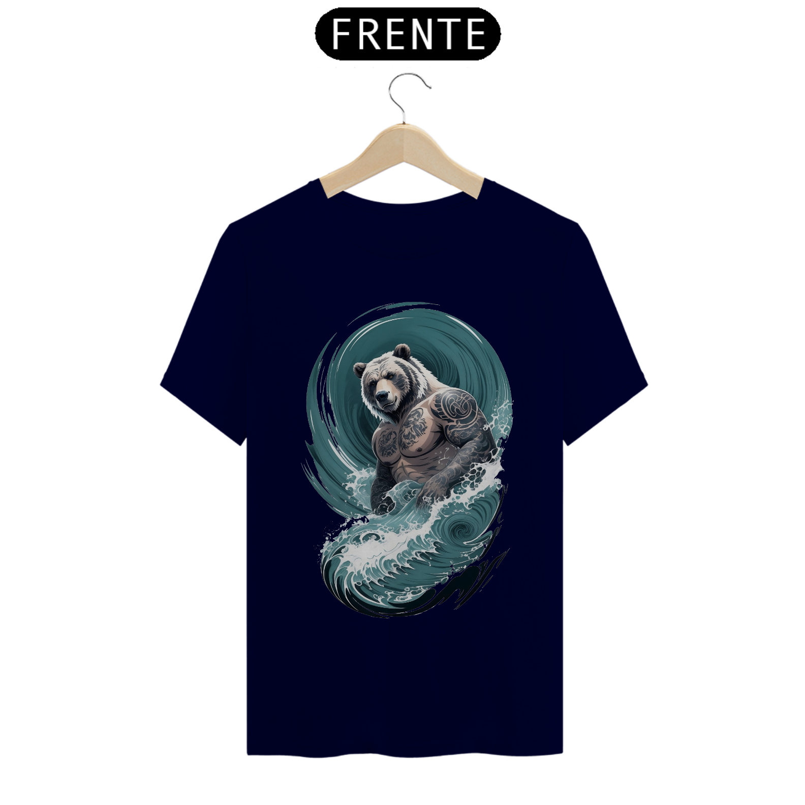 O urso, incorporando uma fusão de força e delicadeza, personifica a rica diversidade e o orgulho da comunidade Gaybear. O corpo tatuado é uma representação de autoexpressão e empoderamento, enquanto as ondas em estilo japonês adicionam um elemento de profundidade e espiritualidade à estampa.