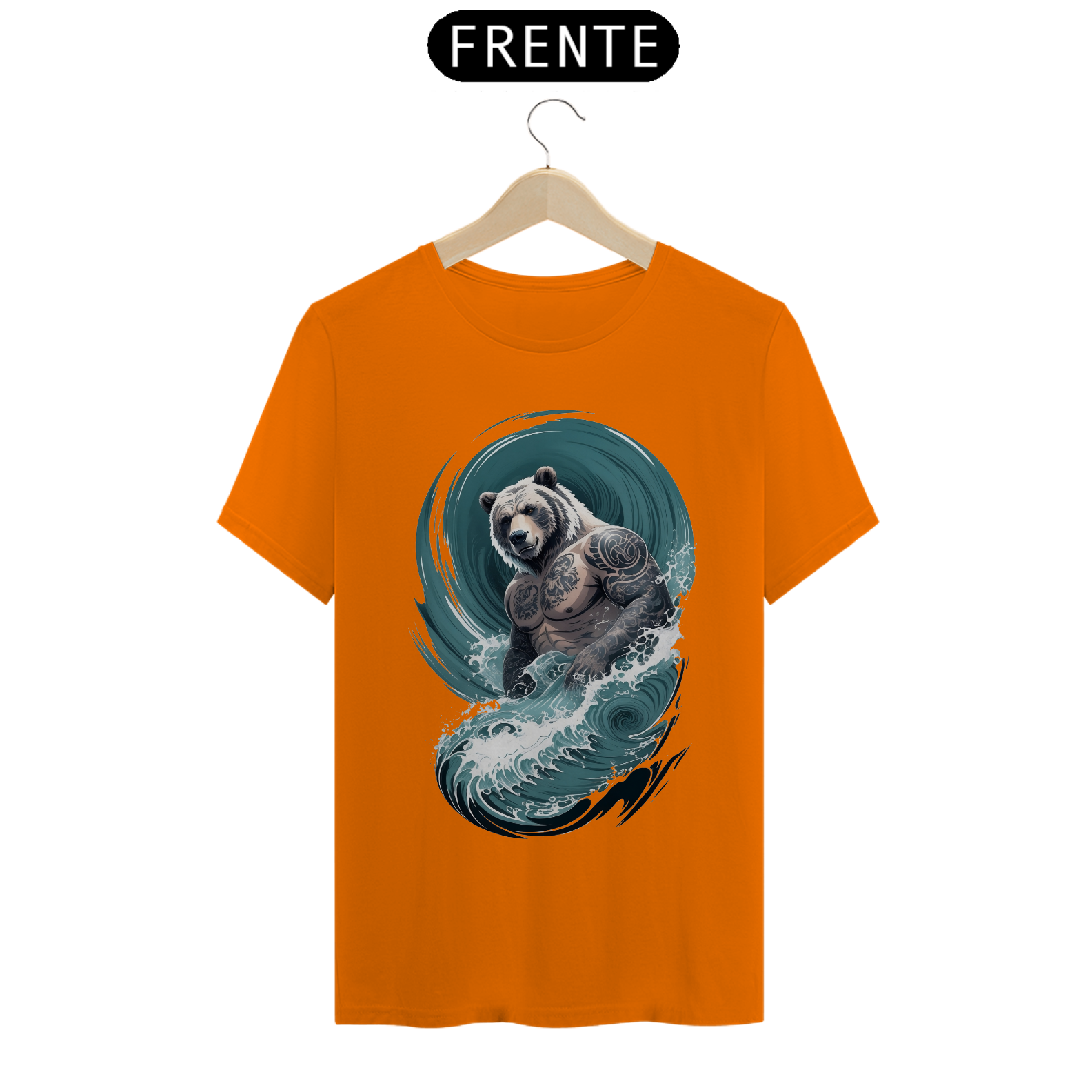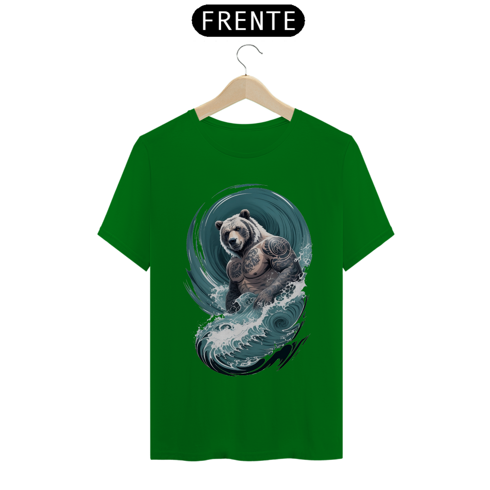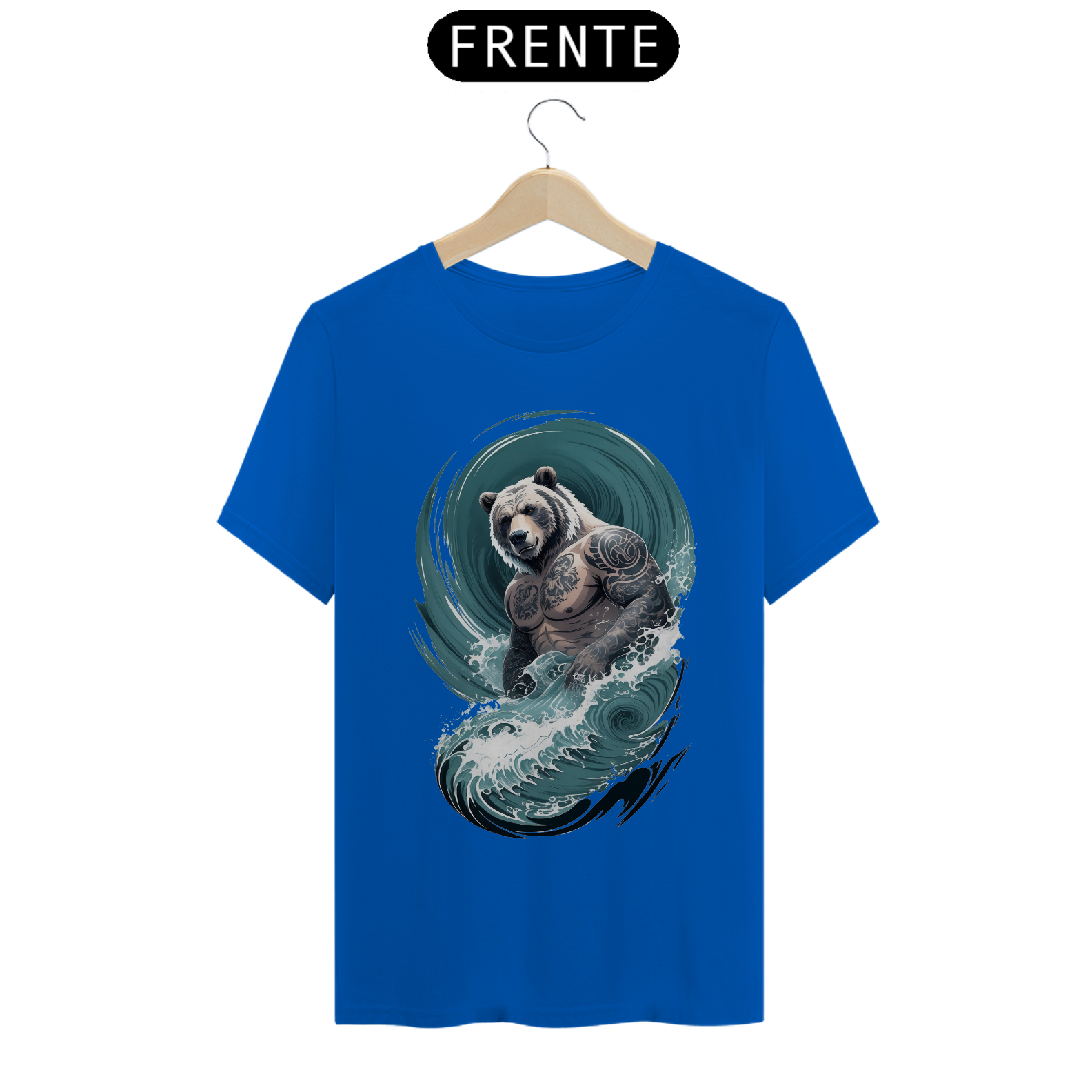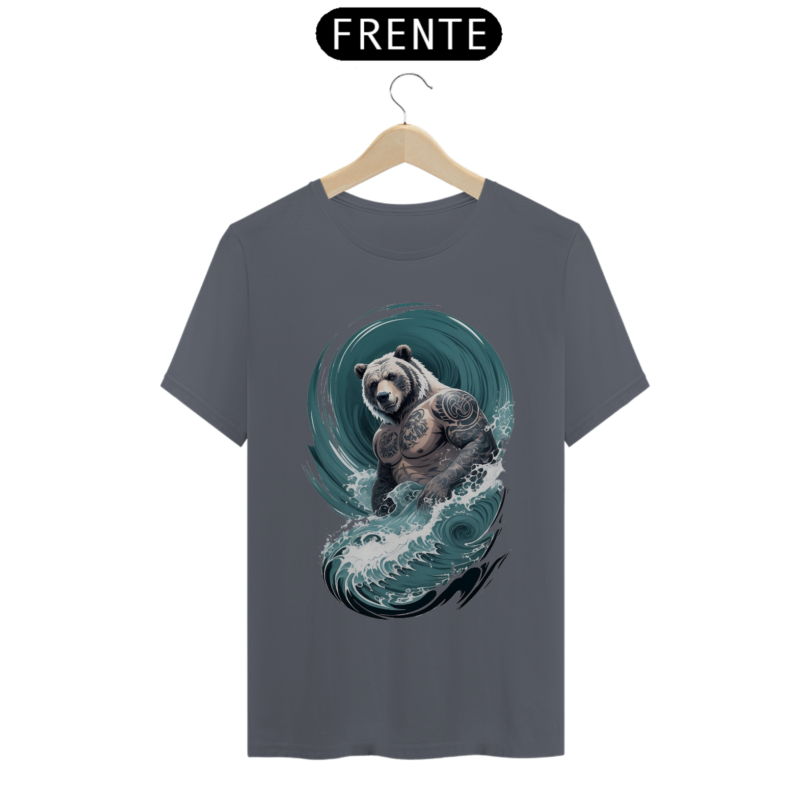 O urso, incorporando uma fusão de força e delicadeza, personifica a rica diversidade e o orgulho da comunidade Gaybear. O corpo tatuado é uma representação de autoexpressão e empoderamento, enquanto as ondas em estilo japonês adicionam um elemento de profundidade e espiritualidade à estampa.