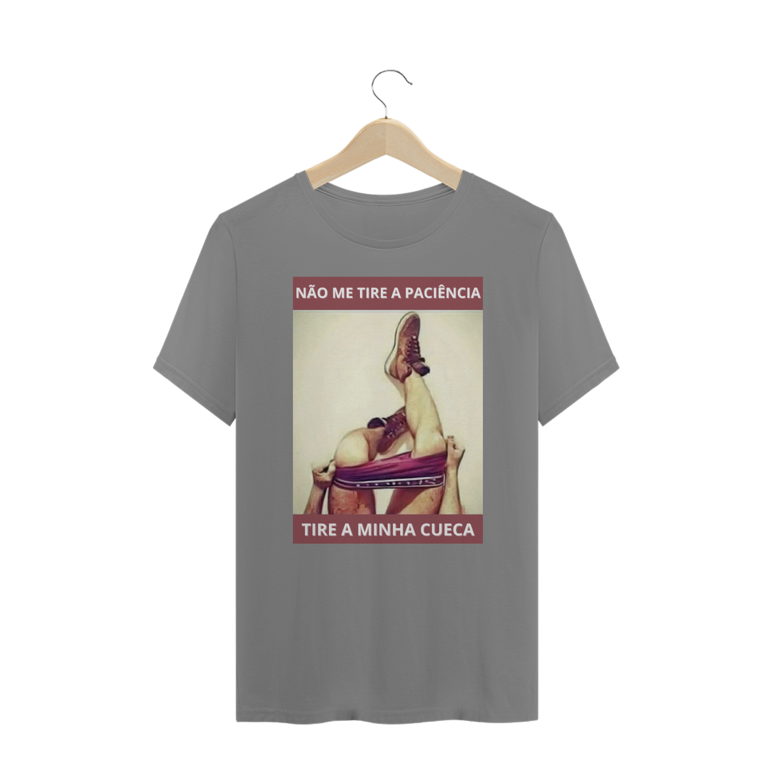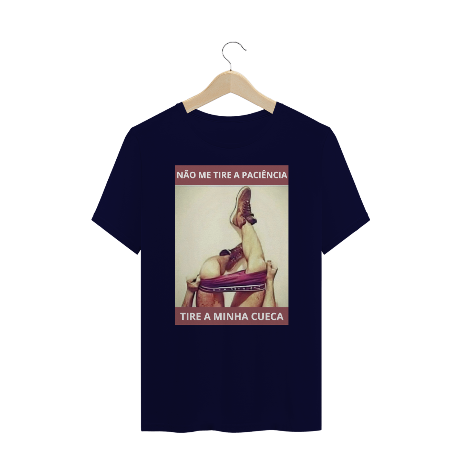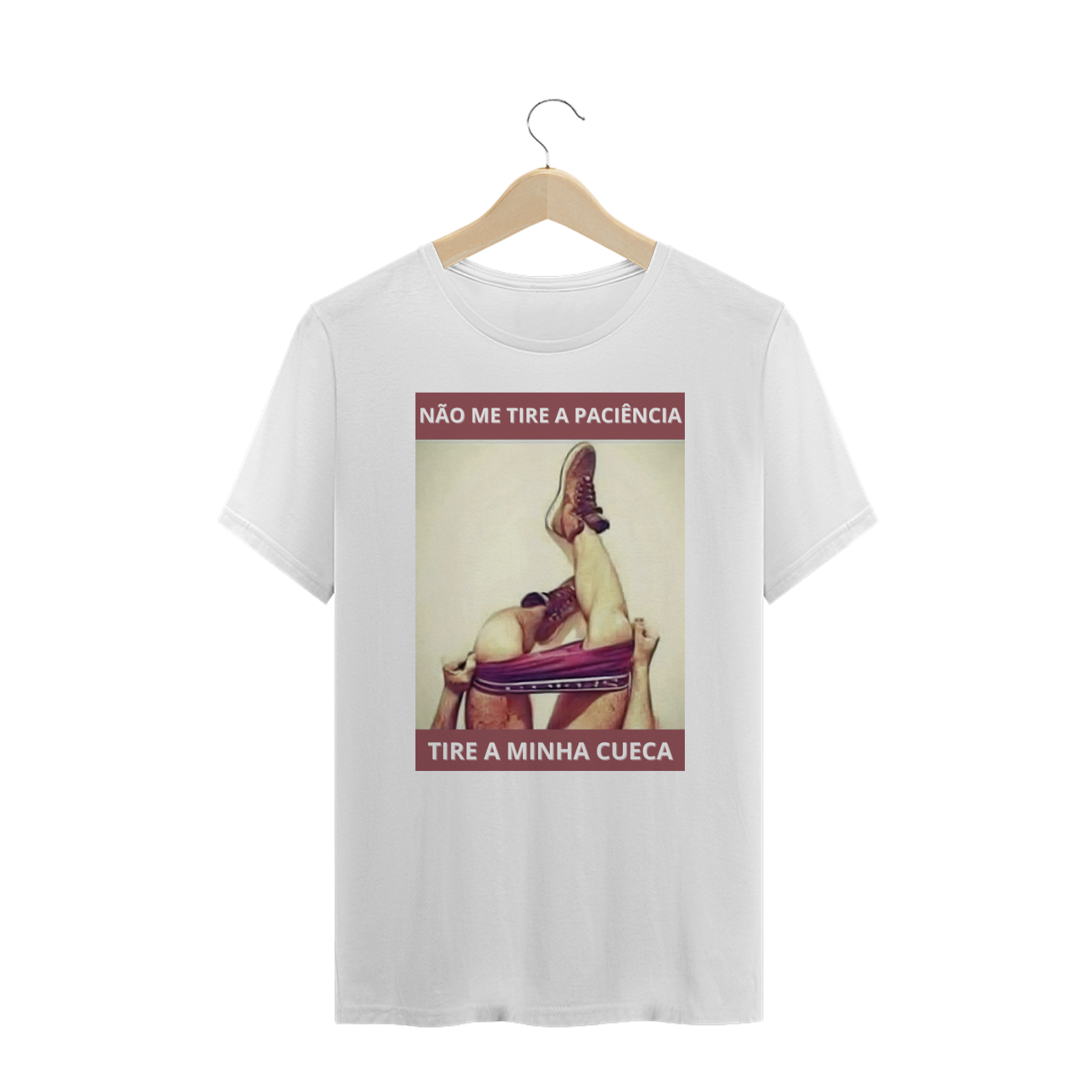 Esta estampa de camiseta é uma brincadeira provocativa e divertida com a paciência e a intimidade dentro da comunidade Gay Bear, apresentando as pernas de um homem tirando a cueca com a frase 'NÃO TIRE MINHA PACIÊNCIA' no alto e 'TIRE MINHA CUECA' abaixo. É uma representação ousada e sugestiva, que mistura humor e erotismo de forma criativa. Ao vestir essa camiseta, você não apenas exibe seu senso de humor e ousadia, mas também promove uma atmosfera de descontração e diversão dentro da comunidade LGBTQ+. Essa estampa é um convite para celebrar a intimidade e a sensualidade de maneira leve e descomplicada.