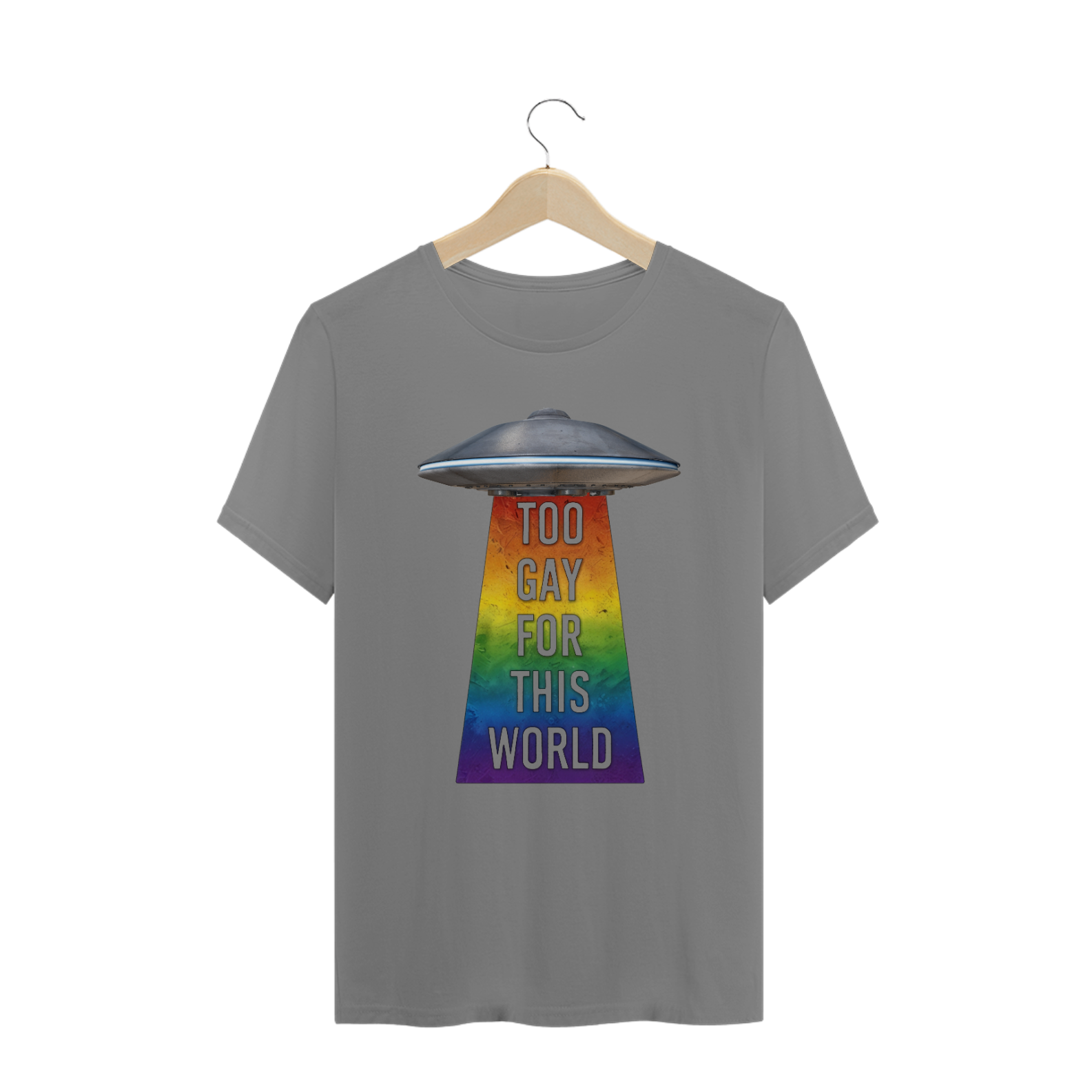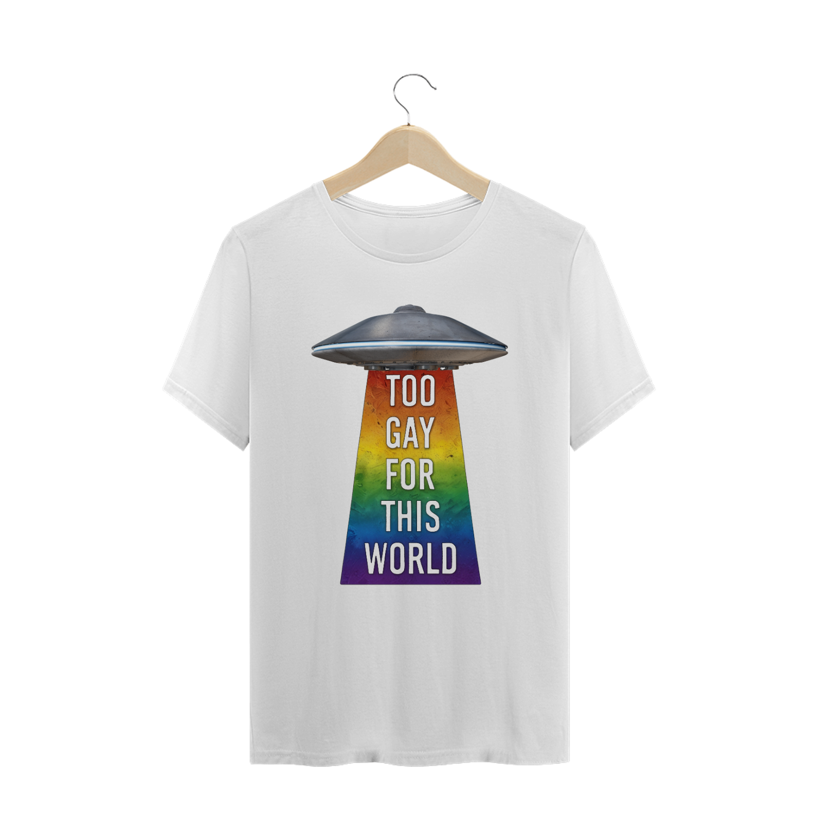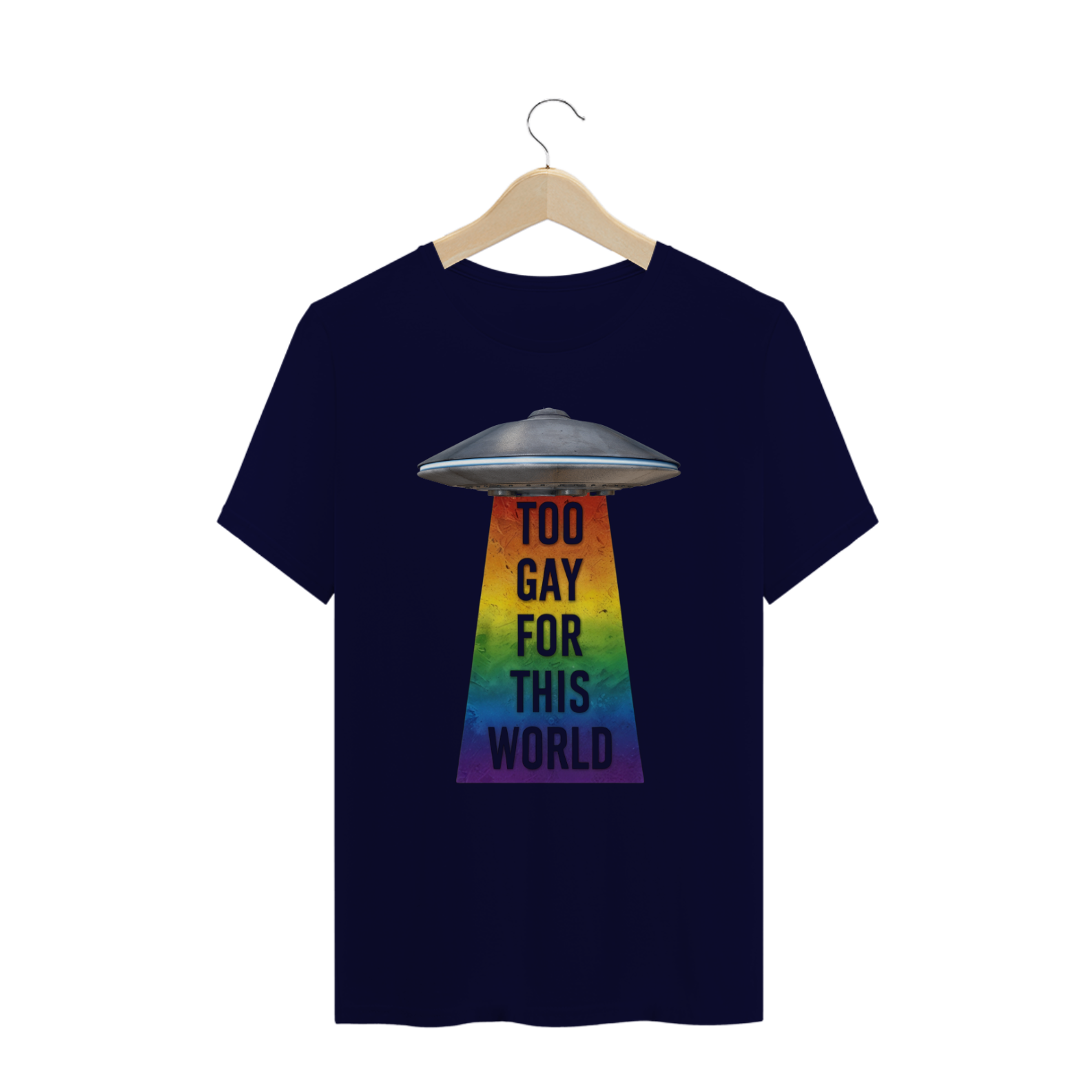 Deixe sua individualidade brilhar com esta estampa de camiseta que combina o mistério do espaço sideral com o orgulho da comunidade Gay Bear. Com um UFO projetando um raio trator nas cores do arco-íris e a frase 'Too gay for this World', esta camiseta é uma declaração audaciosa de autoexpressão e pertencimento. Seja você um entusiasta do espaço ou um membro da comunidade LGBTQ+, esta estampa é uma maneira divertida e ousada de mostrar sua autenticidade e celebrar sua identidade única.