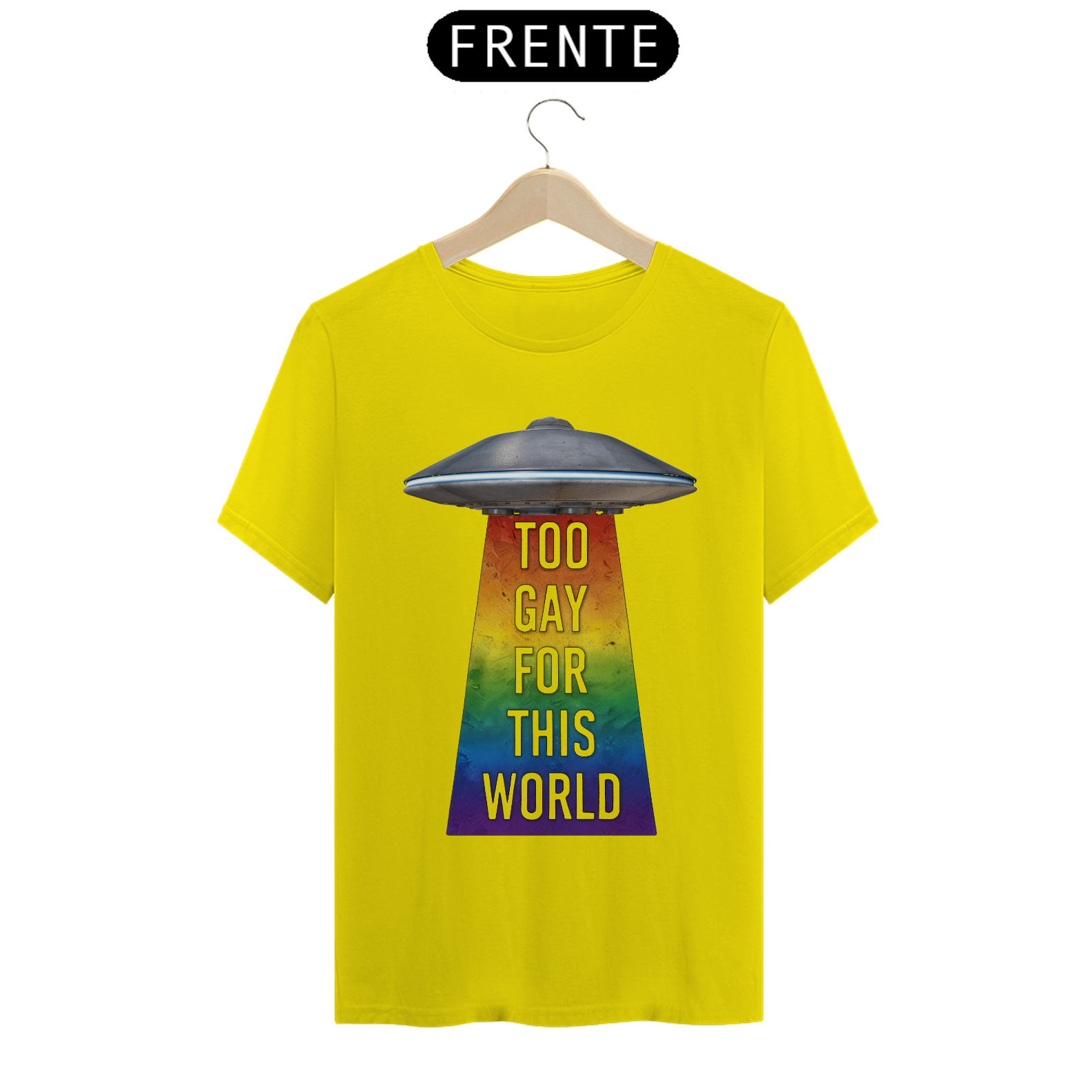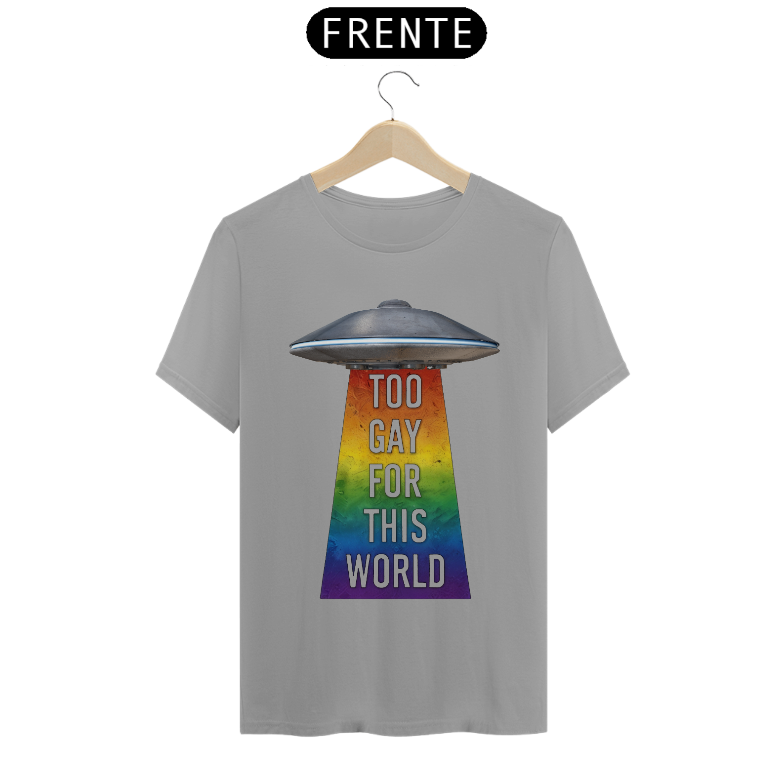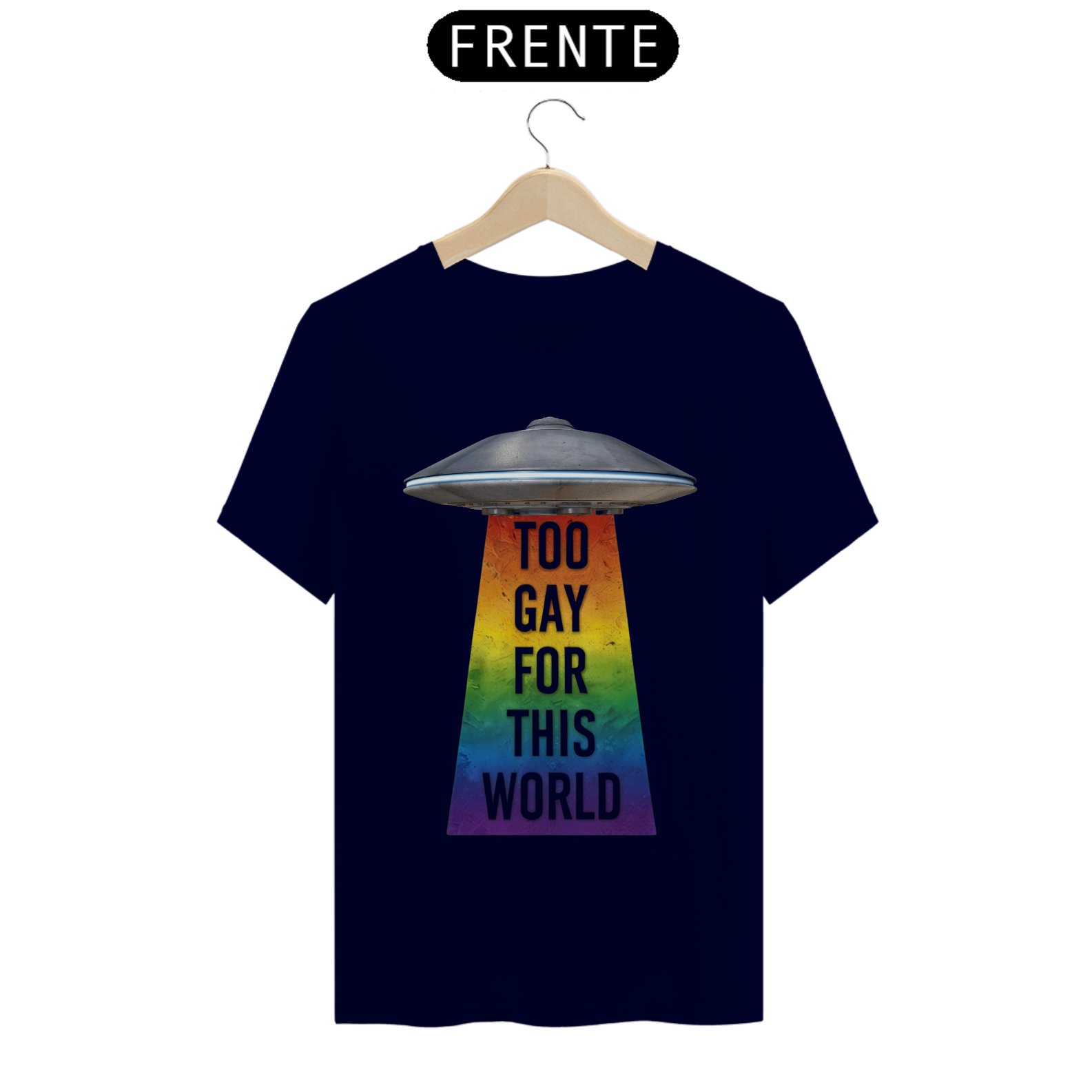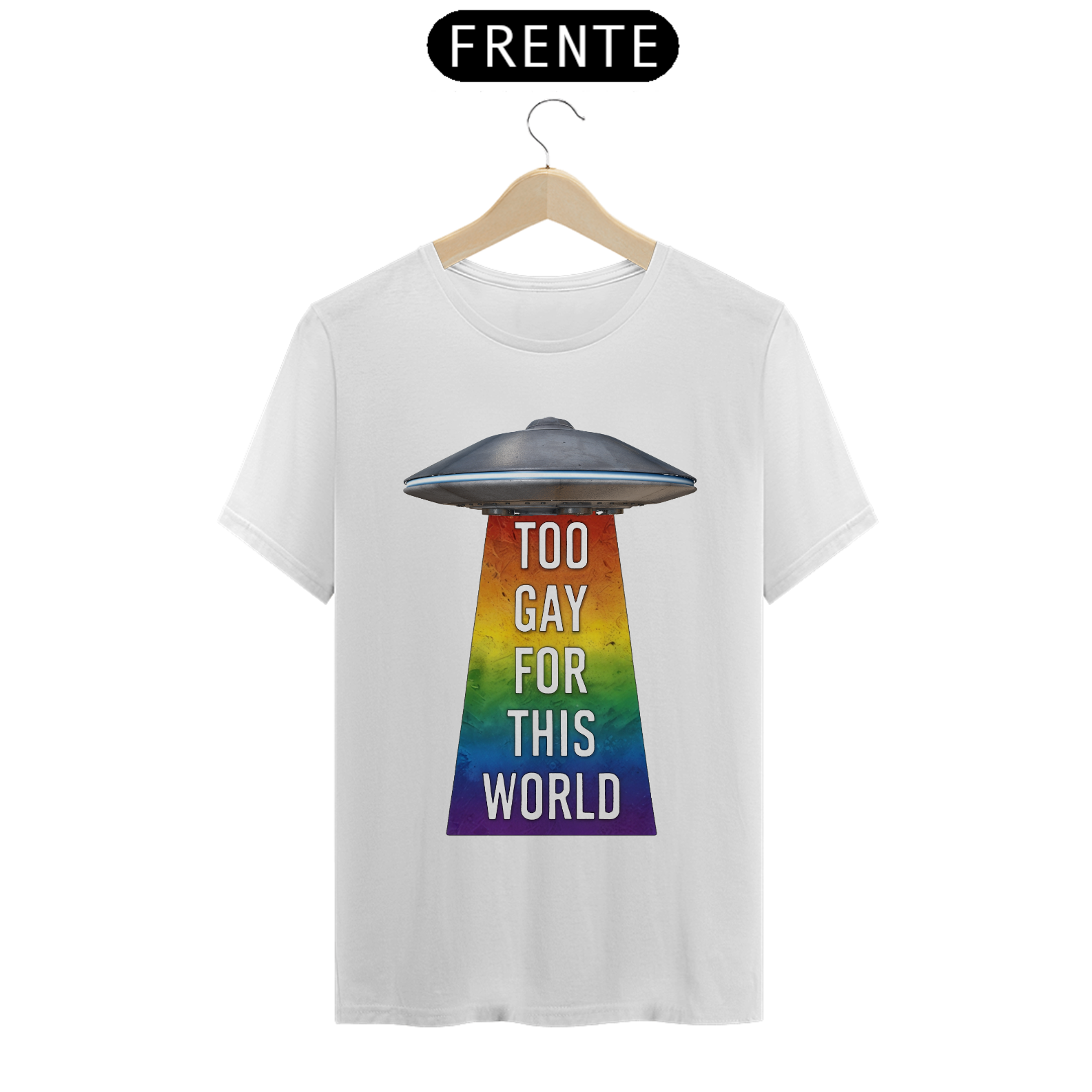 Deixe sua individualidade brilhar com esta estampa de camiseta que combina o mistério do espaço sideral com o orgulho da comunidade Gay Bear. Com um UFO projetando um raio trator nas cores do arco-íris e a frase 'Too gay for this World', esta camiseta é uma declaração audaciosa de autoexpressão e pertencimento. Seja você um entusiasta do espaço ou um membro da comunidade LGBTQ+, esta estampa é uma maneira divertida e ousada de mostrar sua autenticidade e celebrar sua identidade única.