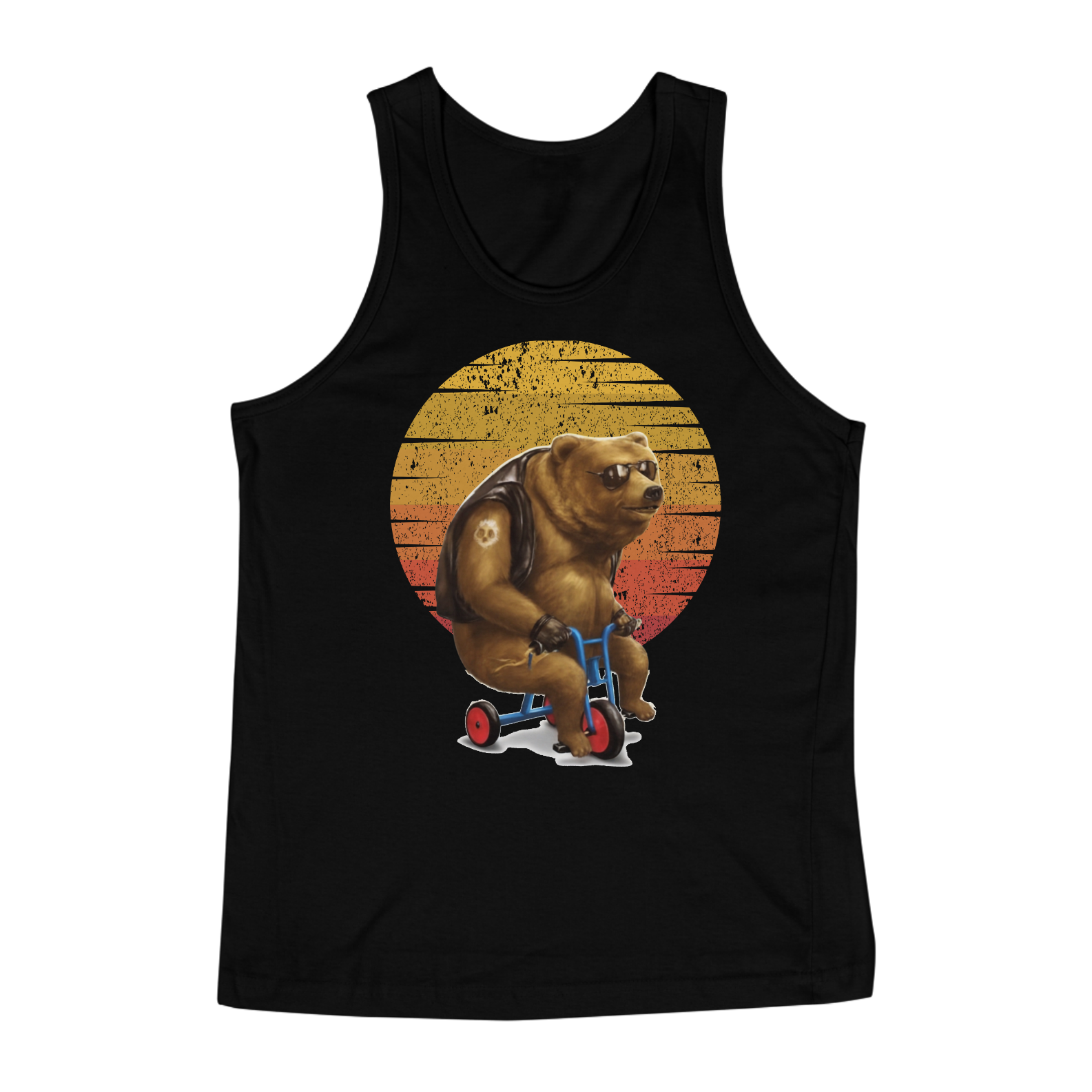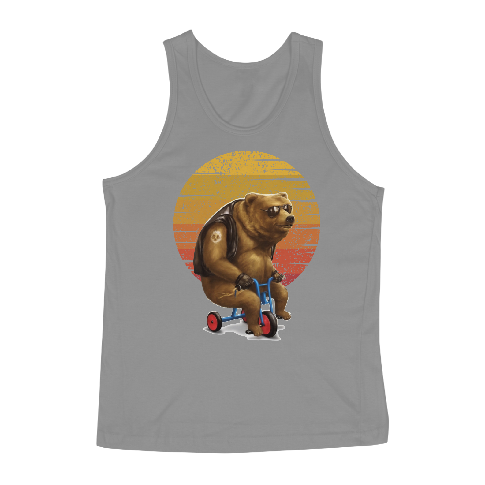 Esta estampa ousada e cheia de humor celebra a atitude motociclista de uma maneira única, apresentando um urso gordo com muito estilo. Vestindo um colete de couro e óculos escuros, ele domina um triciclo infantil, desafiando as expectativas e adicionando uma pitada de diversão à cena. O fundo com um gradiente nas cores vibrantes do pôr do sol complementa a ousadia dessa representação, tornando-a uma afirmação visual única para a comunidade Gaybear.