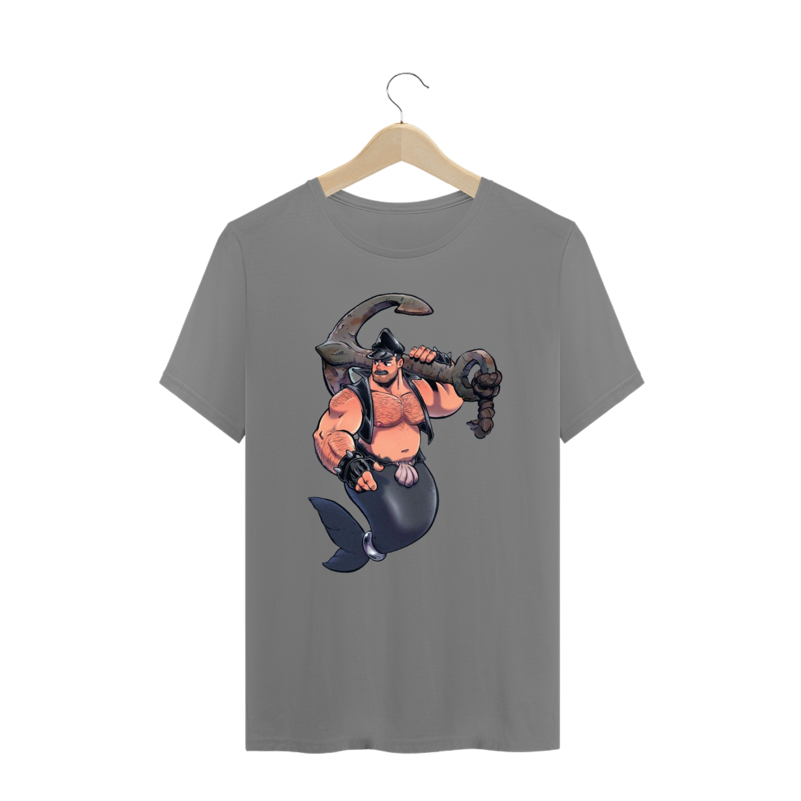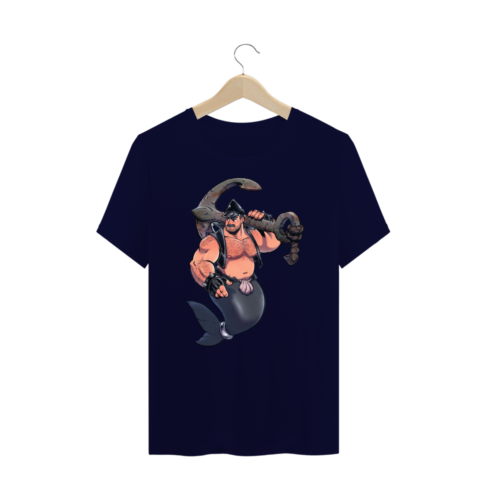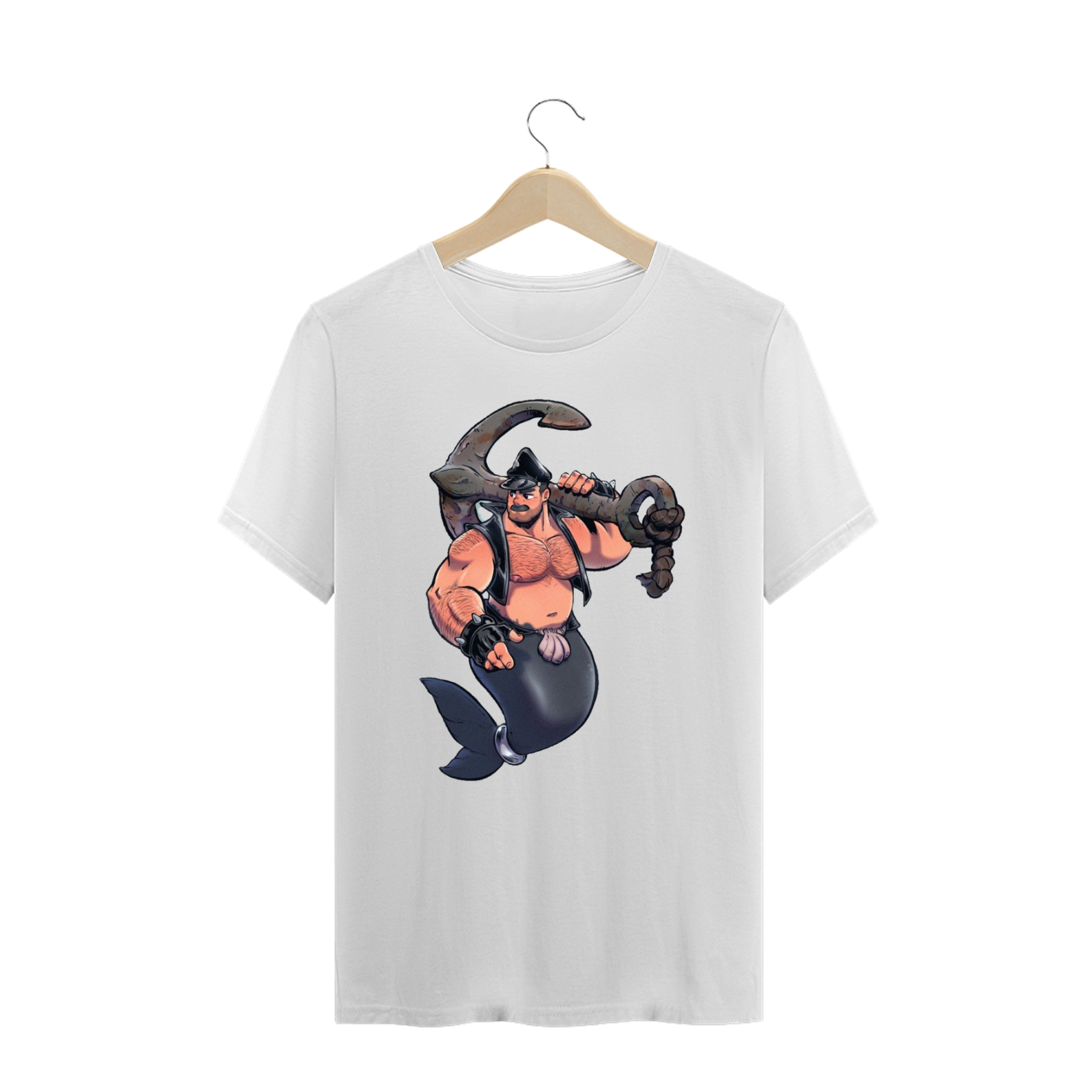 Esta estampa traz a imagem de um Tritão robusto, com um bigode marcante e peito peludo, emanando uma aura de virilidade. Vestido com um cap e um colete de couro, e adornado com pulseiras de couro com spikes, ele segura uma âncora com confiança, simbolizando sua força e determinação.