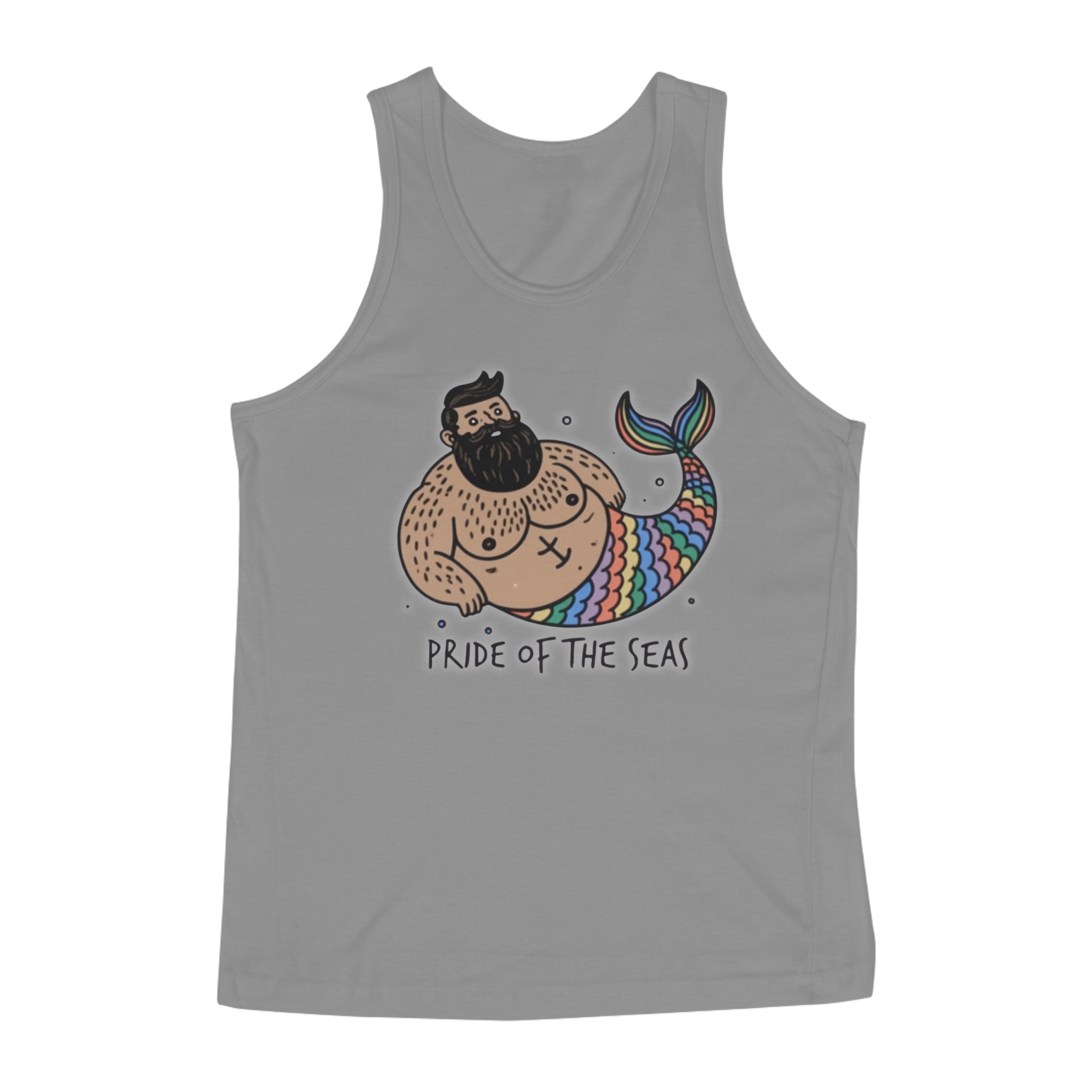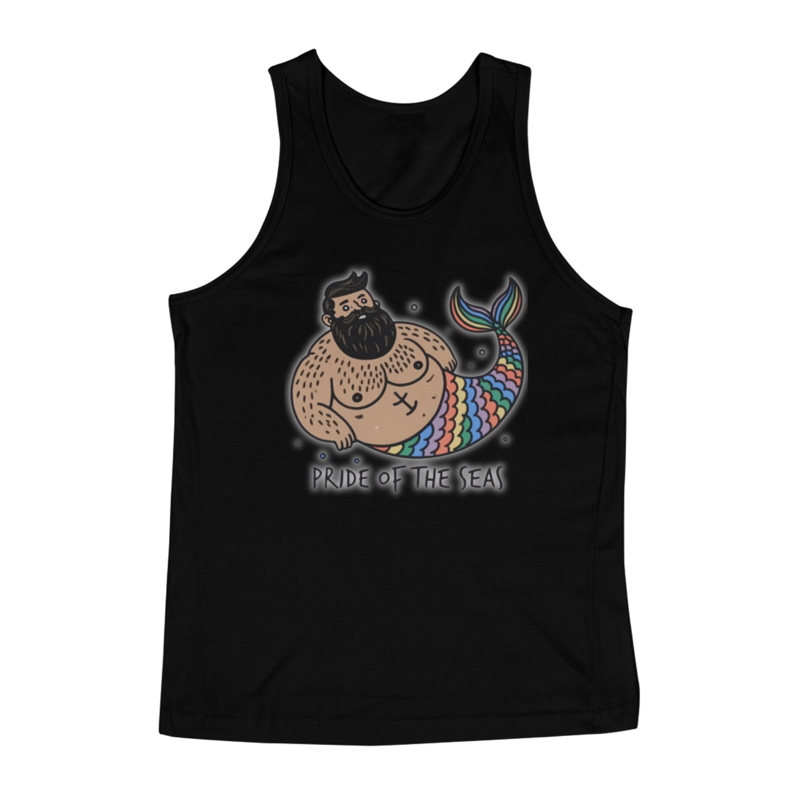 Esta estampa de camiseta celebra a diversidade e o orgulho da comunidade Gay Bear de uma forma única e marítima. Apresentando um tritão robusto e barbudo com um torso peludo e uma cauda escamosa colorida com as cores do arco-íris, esta estampa é uma afirmação poderosa da identidade e da autoexpressão. Com a frase "Pride of the Seas!" abaixo dele, este tritão gordinho não apenas personifica a força e a beleza dos ursos gays, mas também reivindica seu lugar com orgulho nos mares da comunidade LGBTQ+.