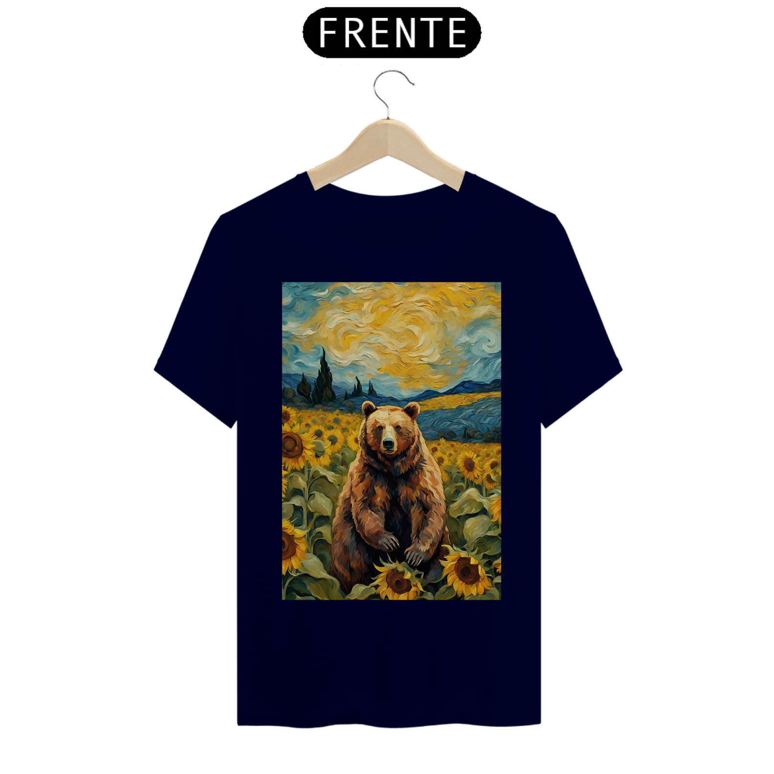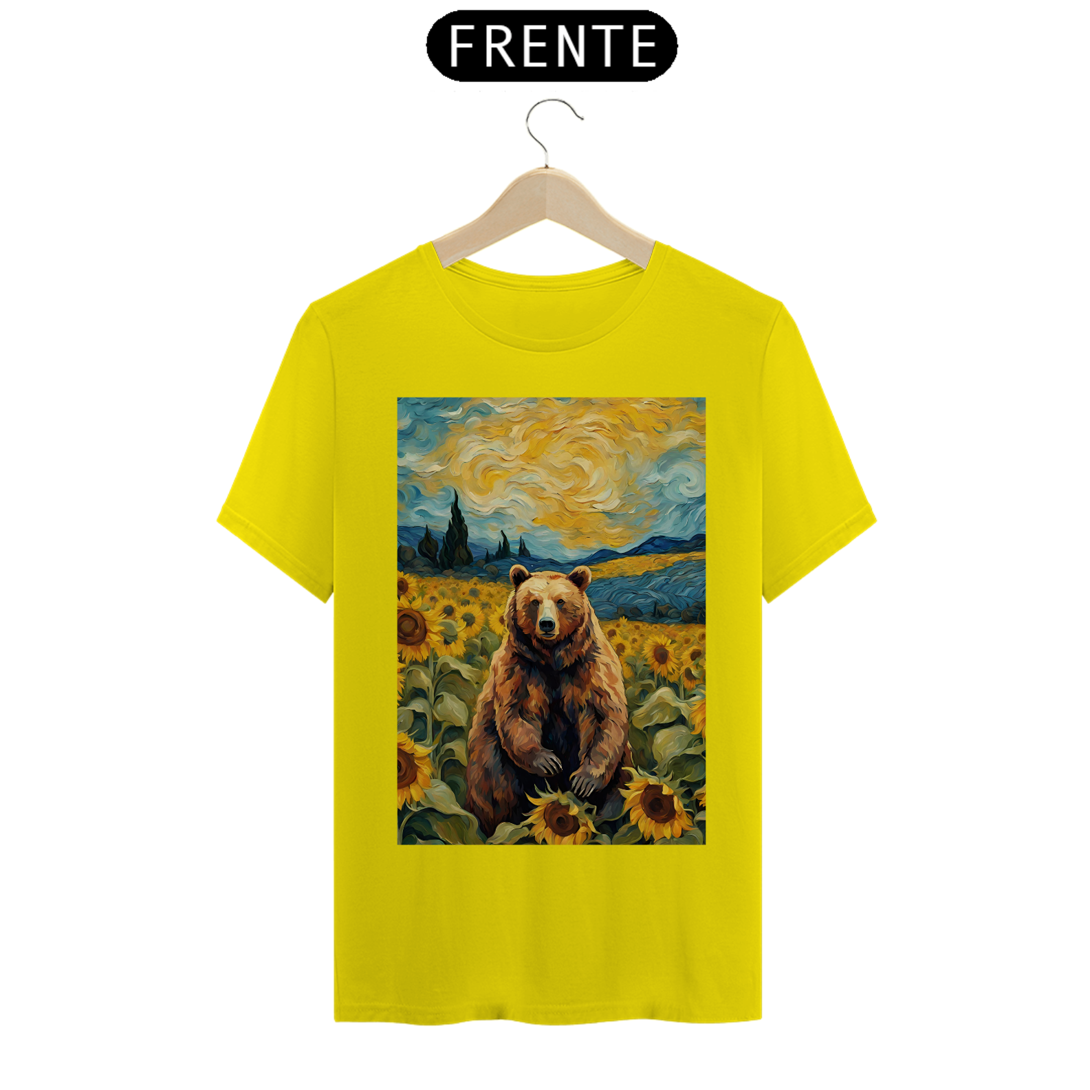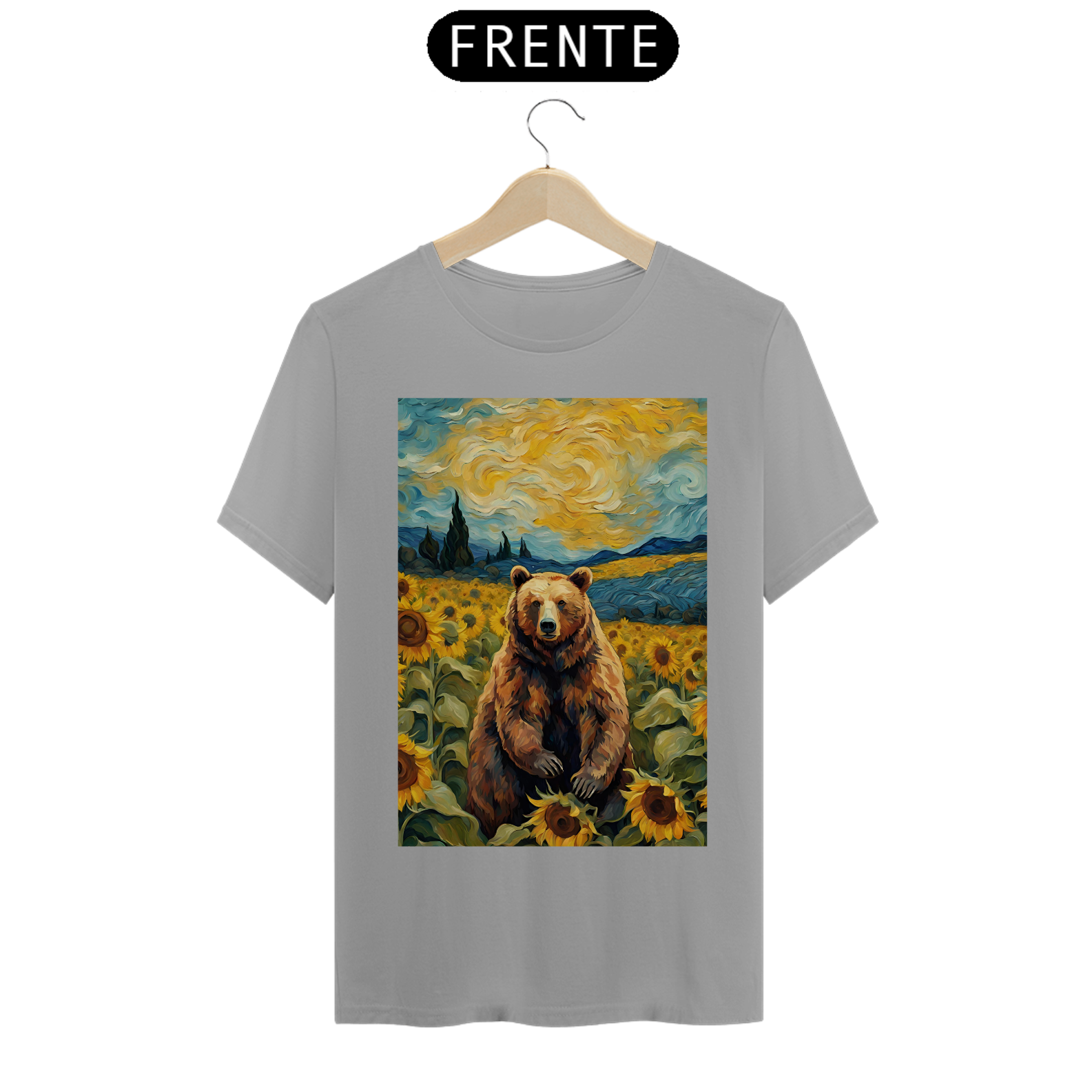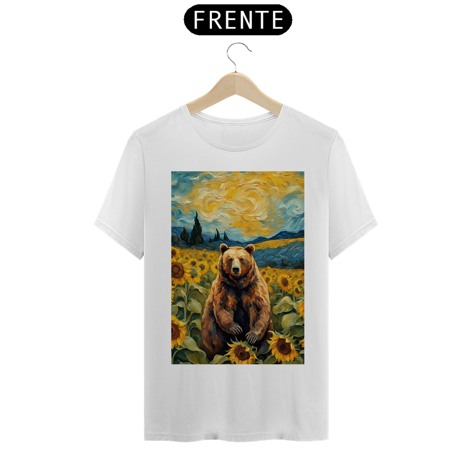 Esta camiseta transmite uma aura de serenidade e beleza, apresentando um urso sentado em um exuberante campo de girassóis, inspirado nas obras icônicas de Van Gogh. A cena é uma celebração da natureza e da autenticidade, refletindo a essência da comunidade Gay Bear em sua plenitude e diversidade. Com tons vibrantes e detalhes inspirados na técnica do mestre impressionista, esta estampa é uma ode à liberdade e à expressão individual, perfeita para aqueles que buscam conexão com a arte e com a comunidade LGBTQ+.