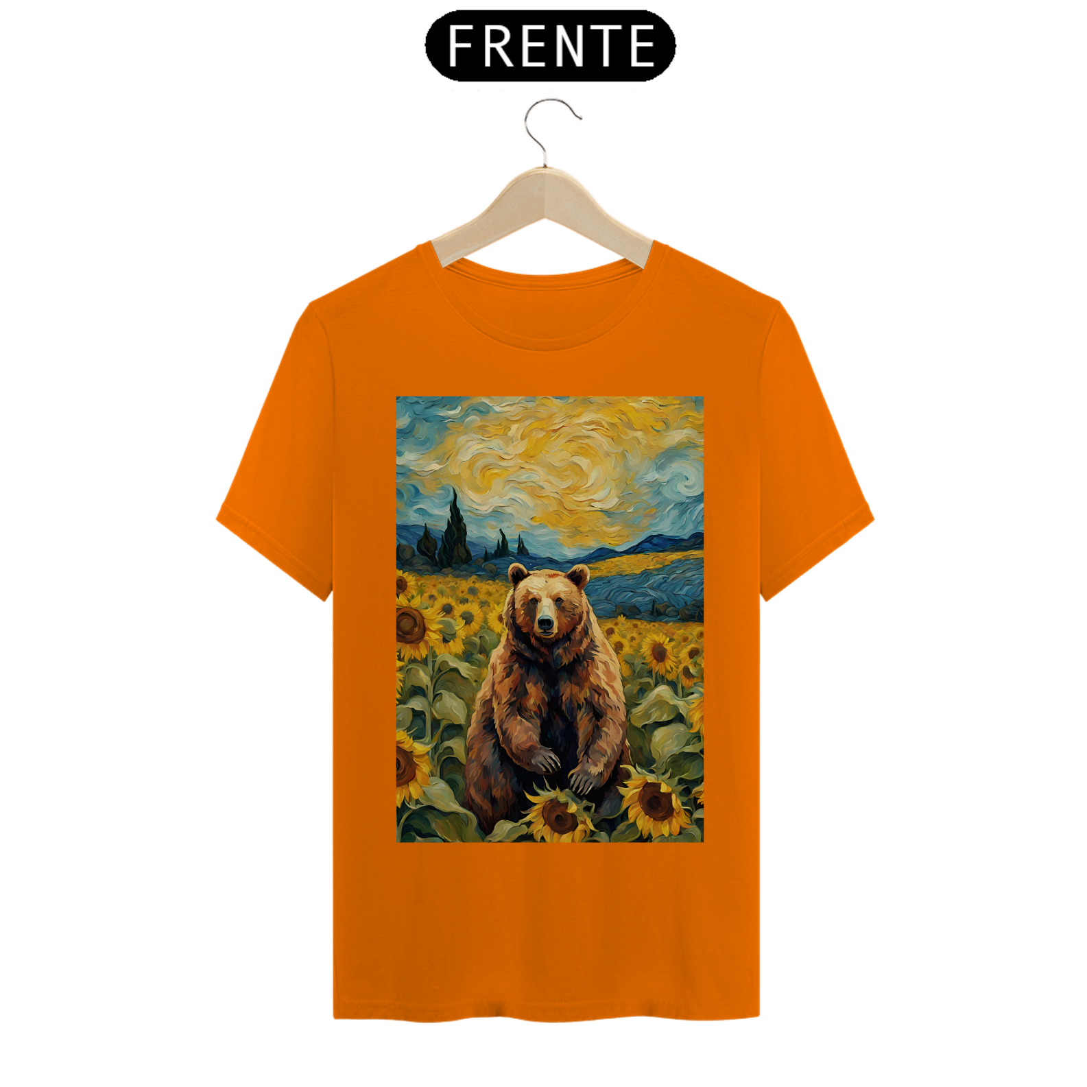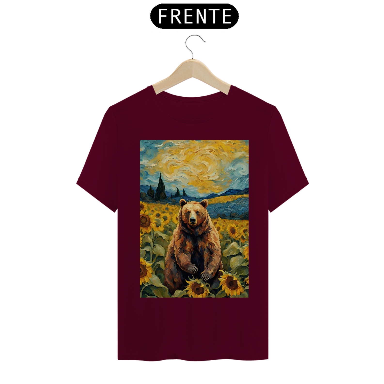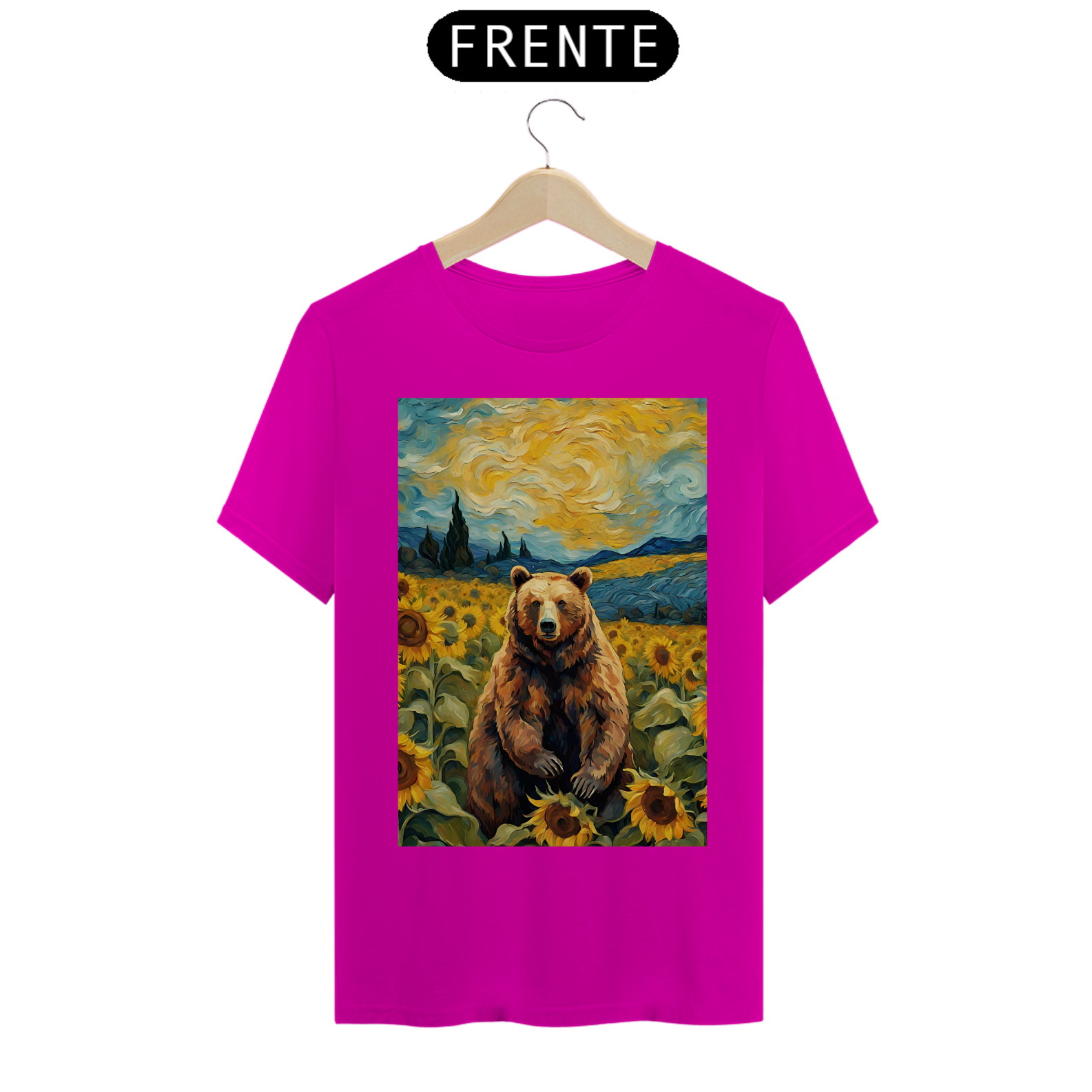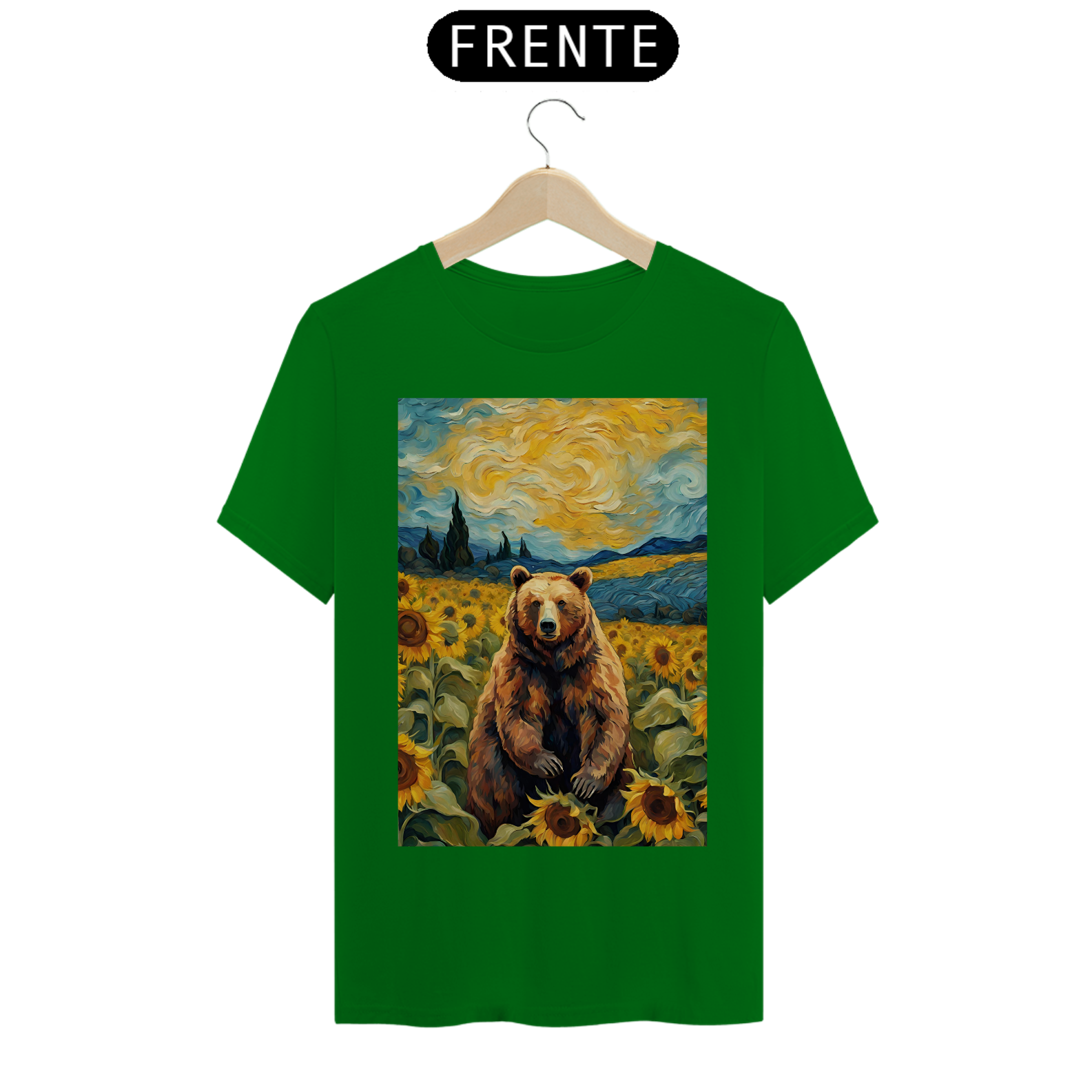 Esta camiseta transmite uma aura de serenidade e beleza, apresentando um urso sentado em um exuberante campo de girassóis, inspirado nas obras icônicas de Van Gogh. A cena é uma celebração da natureza e da autenticidade, refletindo a essência da comunidade Gay Bear em sua plenitude e diversidade. Com tons vibrantes e detalhes inspirados na técnica do mestre impressionista, esta estampa é uma ode à liberdade e à expressão individual, perfeita para aqueles que buscam conexão com a arte e com a comunidade LGBTQ+.