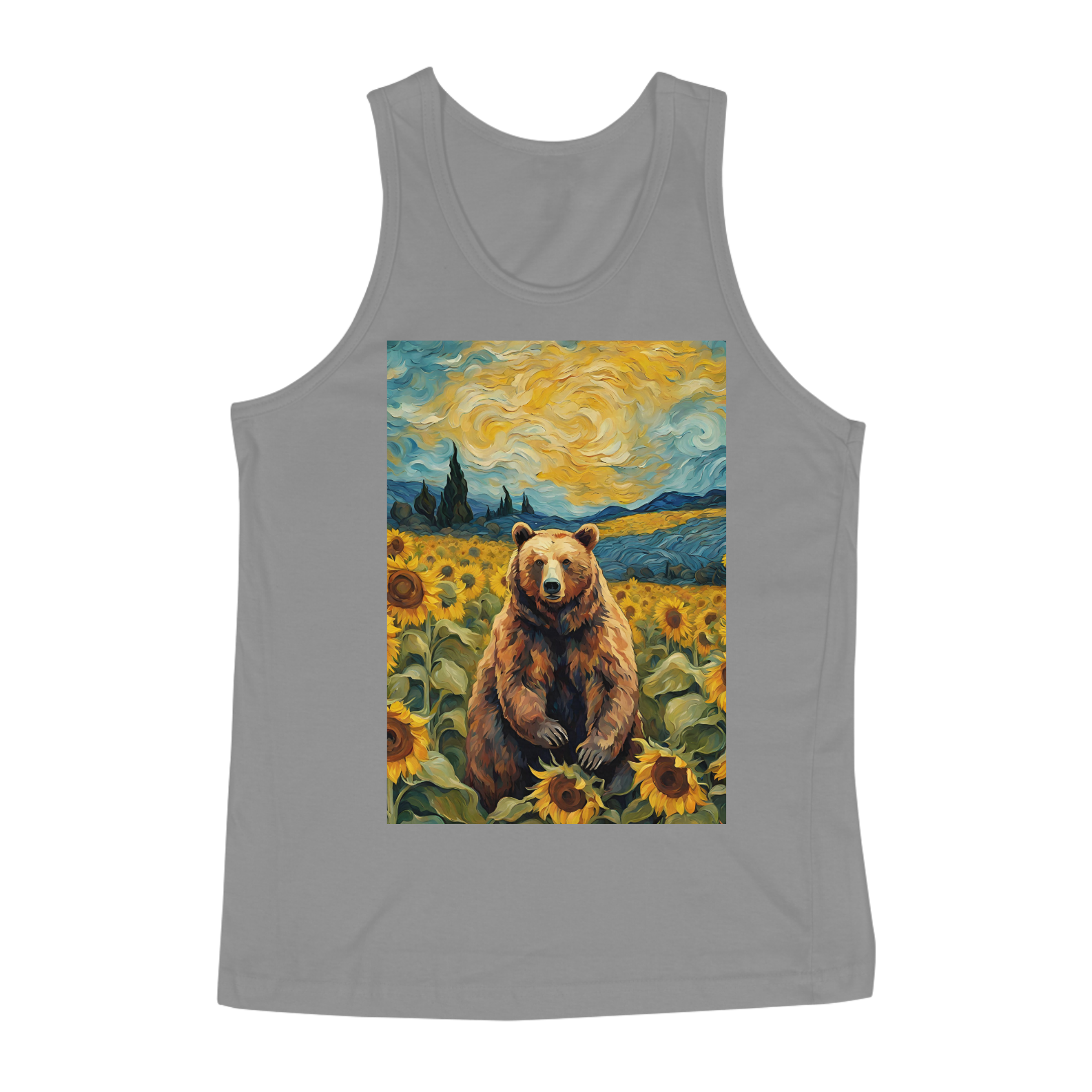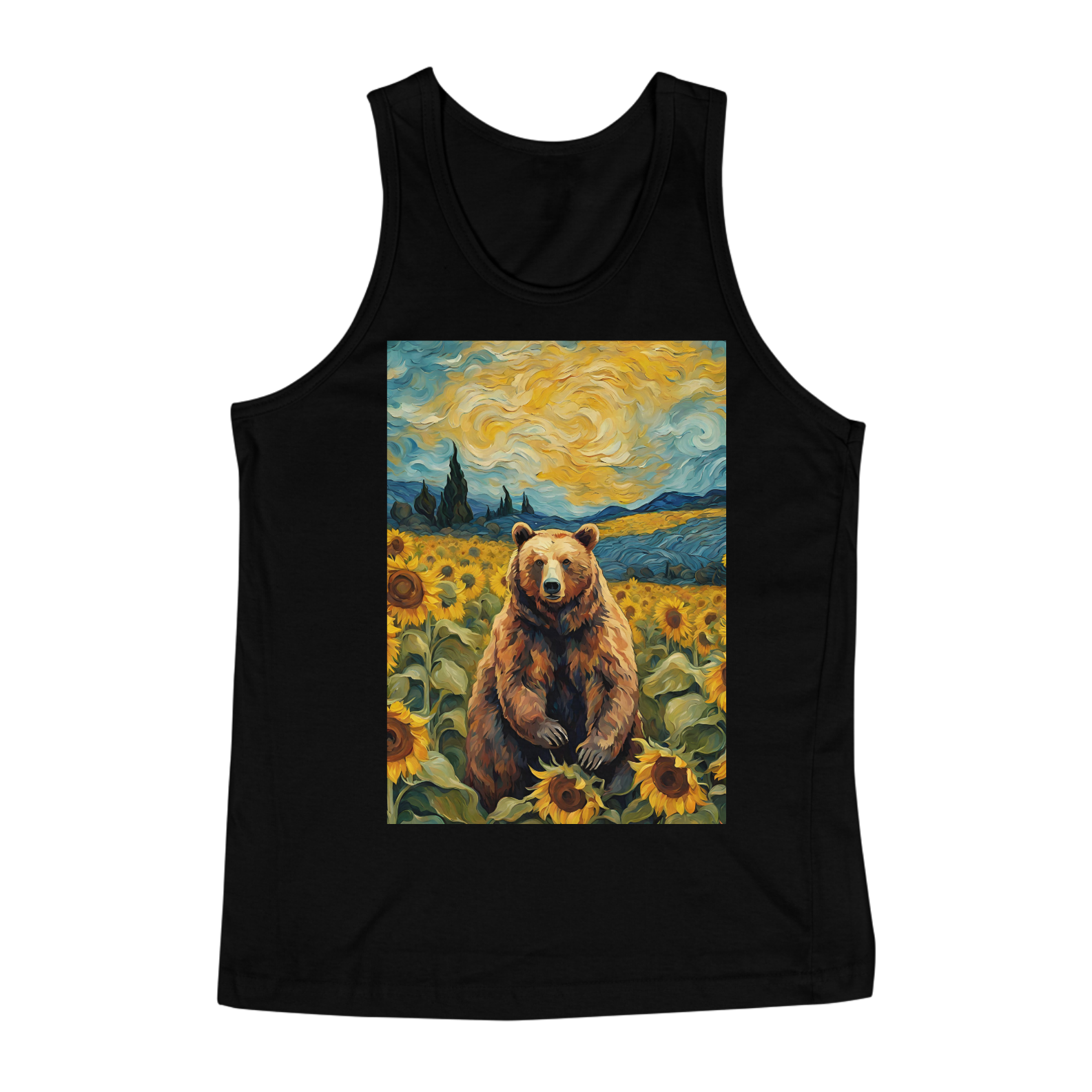 Esta camiseta transmite uma aura de serenidade e beleza, apresentando um urso sentado em um exuberante campo de girassóis, inspirado nas obras icônicas de Van Gogh. A cena é uma celebração da natureza e da autenticidade, refletindo a essência da comunidade Gay Bear em sua plenitude e diversidade. Com tons vibrantes e detalhes inspirados na técnica do mestre impressionista, esta estampa é uma ode à liberdade e à expressão individual, perfeita para aqueles que buscam conexão com a arte e com a comunidade LGBTQ+.