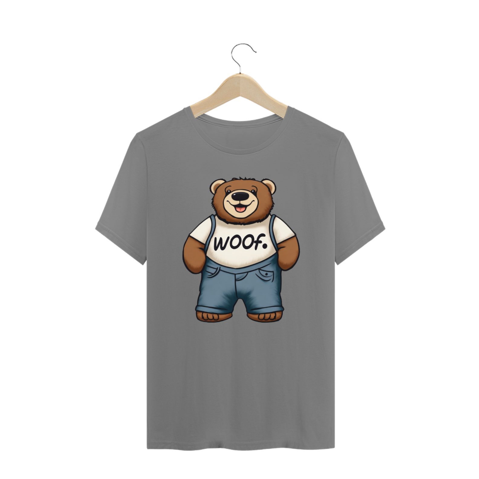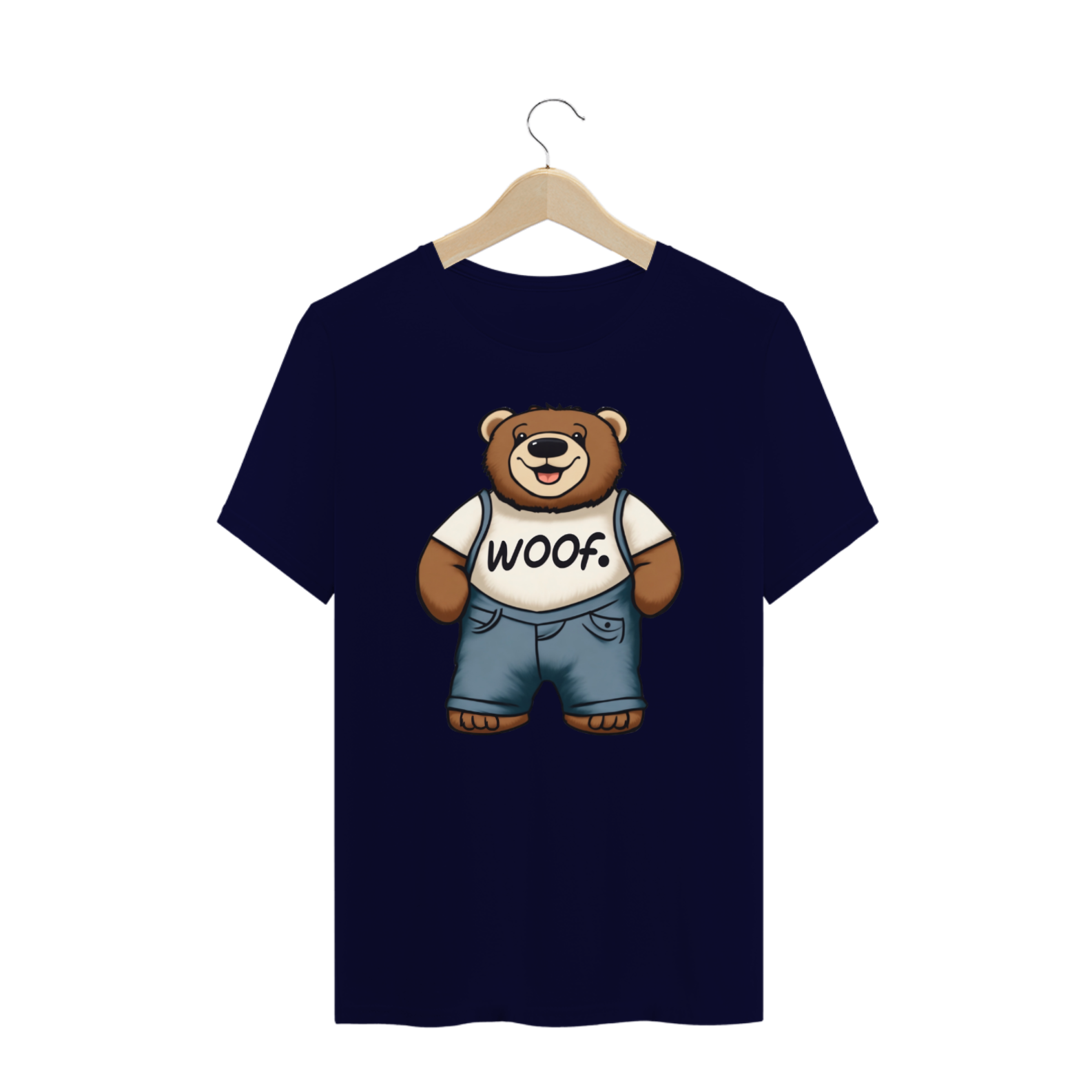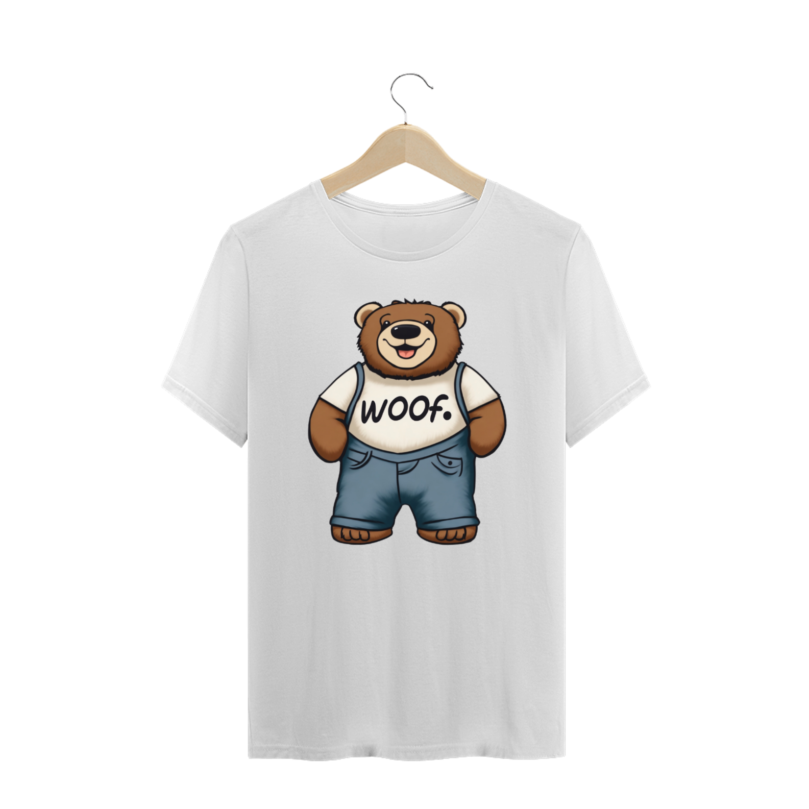 Apresentamos com carinho a nossa camiseta exclusiva que une fofura, estilo e apoio ao movimento LGBT. A estampa traz a imagem encantadora de um Teddy Bear rechonchudo e simpático, usando calças jeans e uma camiseta branca onde se lê a palavra "Woof". No canto superior, o símbolo icônico do movimento LGBT Gaybear está presente, representando a comunidade gay masculina e a celebração da diversidade.