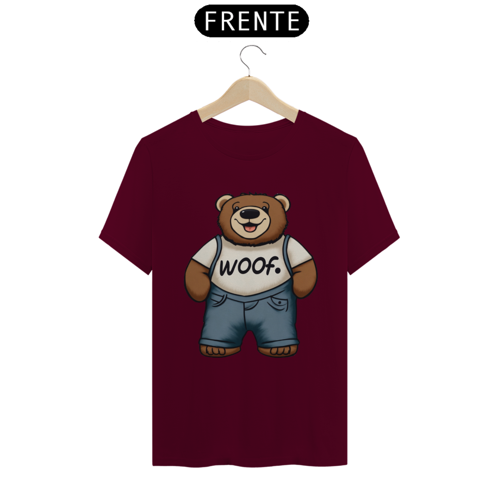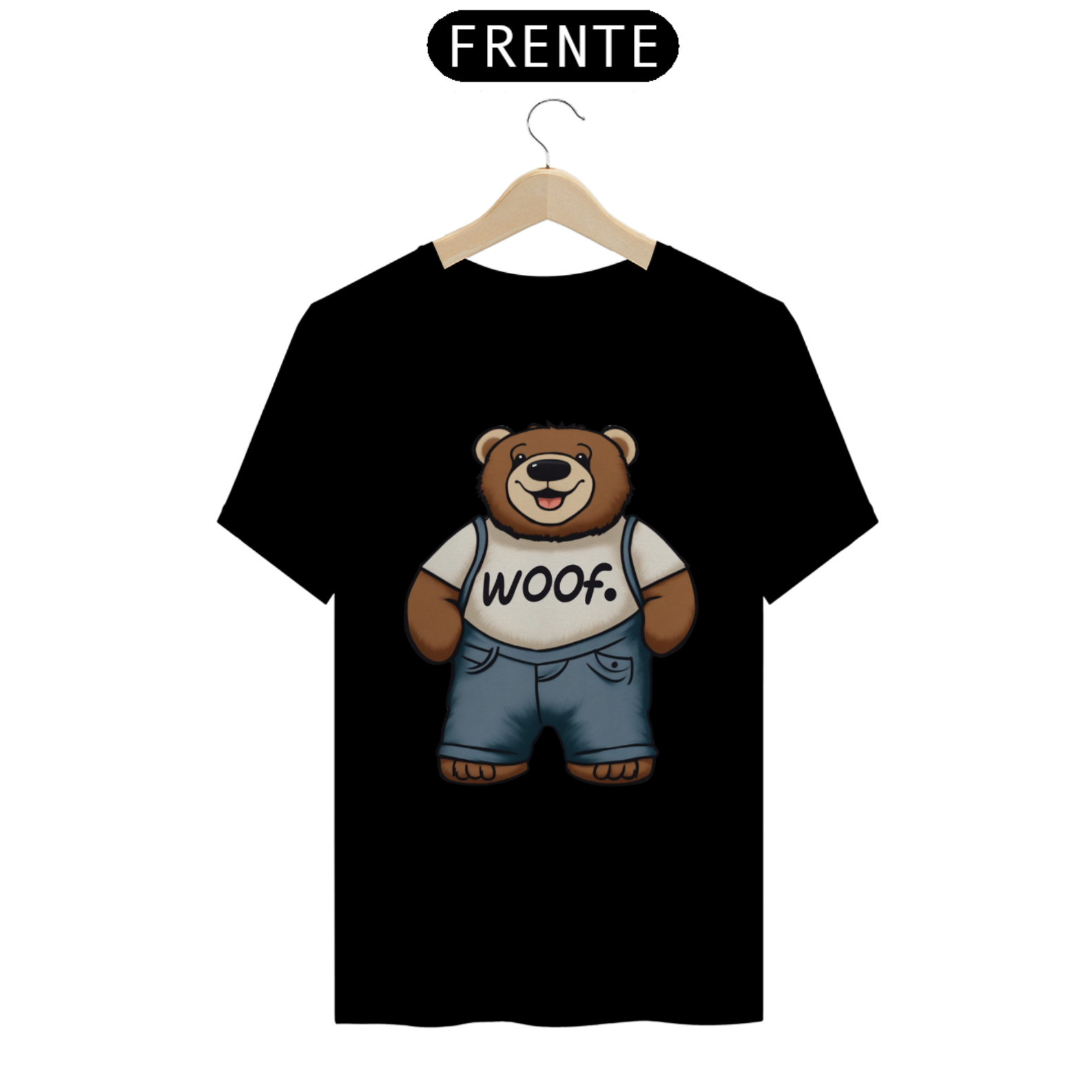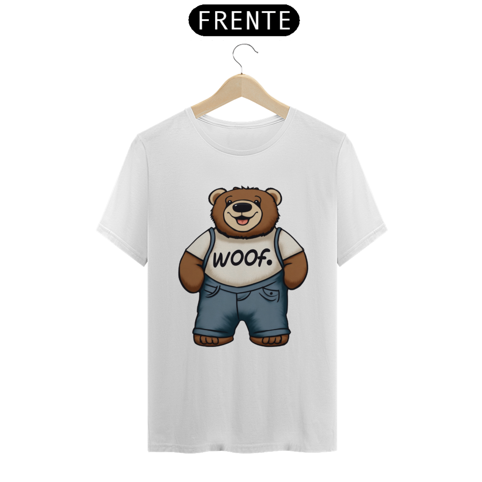 Apresentamos com carinho a nossa camiseta exclusiva que une fofura, estilo e apoio ao movimento LGBT. A estampa traz a imagem encantadora de um Teddy Bear rechonchudo e simpático, usando calças jeans e uma camiseta branca onde se lê a palavra "Woof". No canto superior, o símbolo icônico do movimento LGBT Gaybear está presente, representando a comunidade gay masculina e a celebração da diversidade.