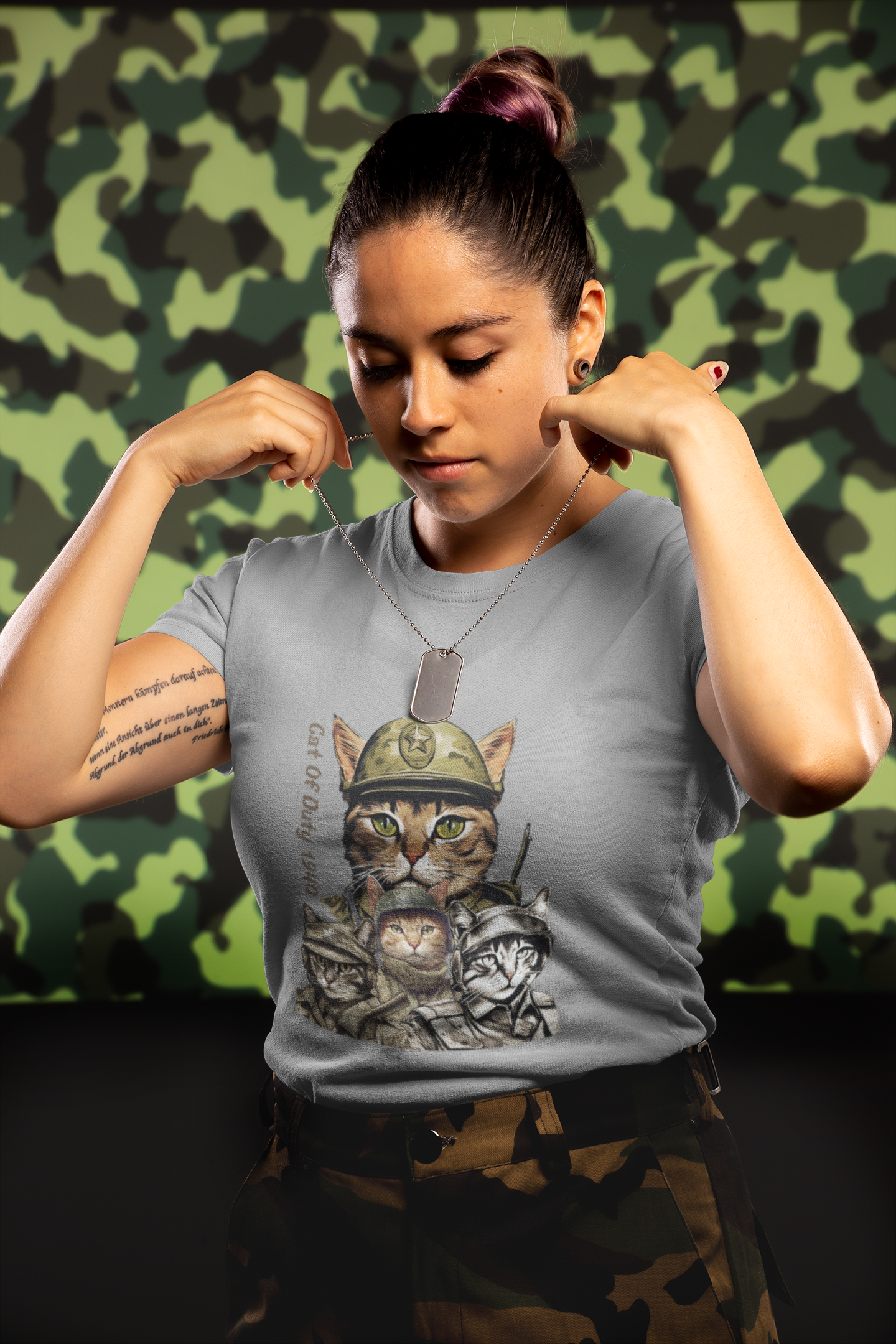 Inspirada no icônico jogo "Call of Duty", esta camiseta apresenta uma reviravolta única, com gatos vestidos para a batalha.