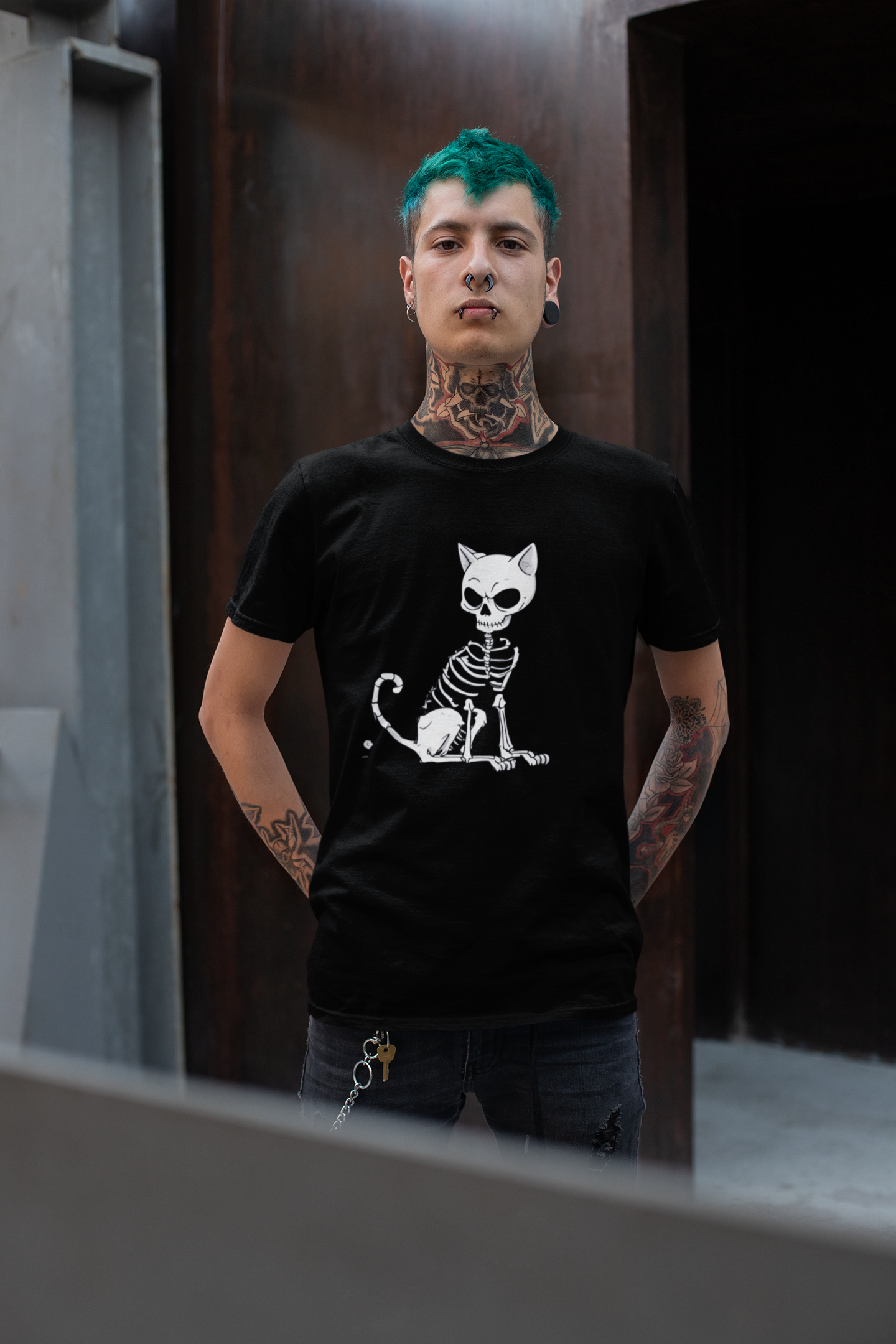 Entre no espírito do Dia das Bruxas com nossa camiseta "Esquelecat"!