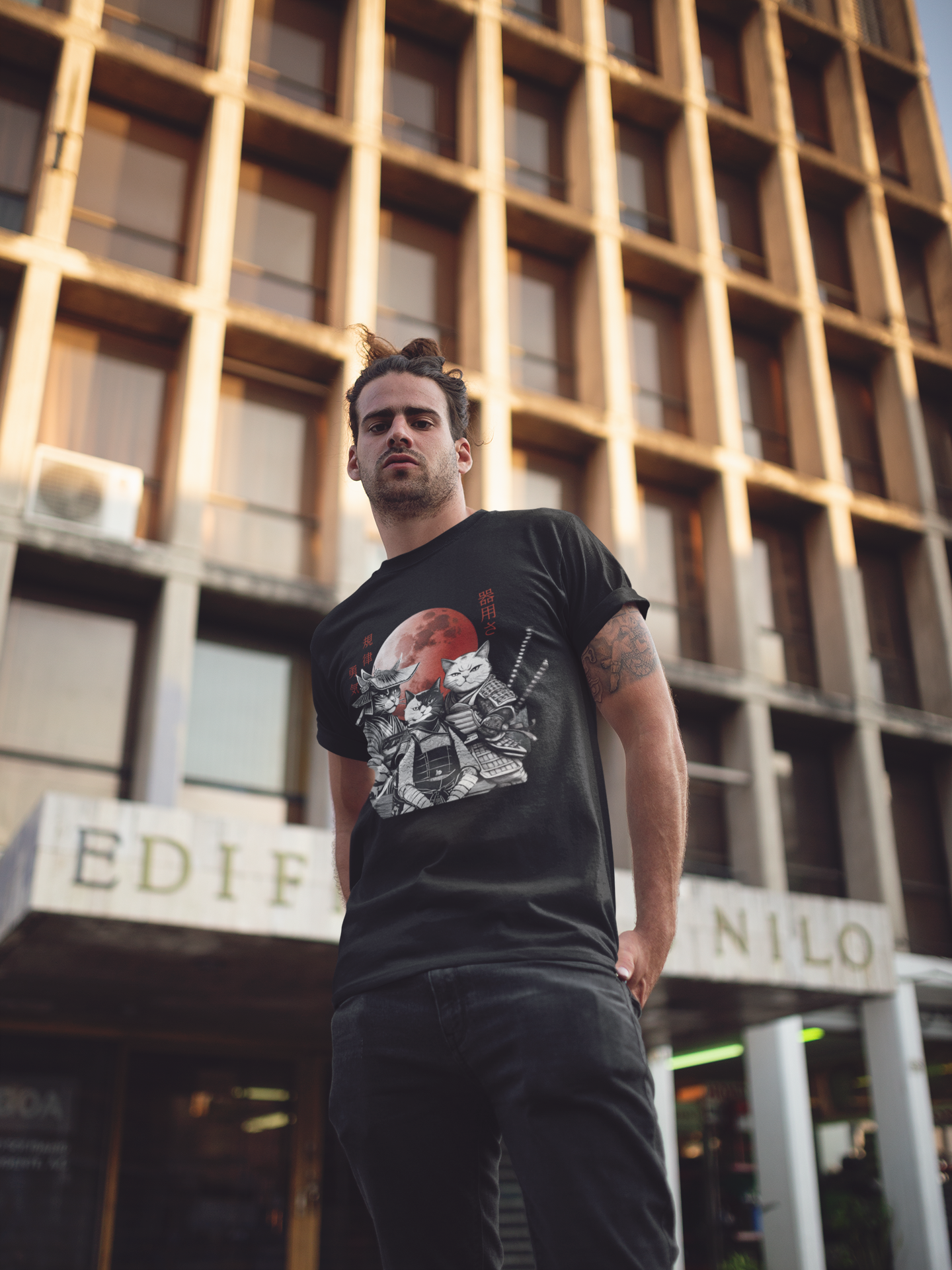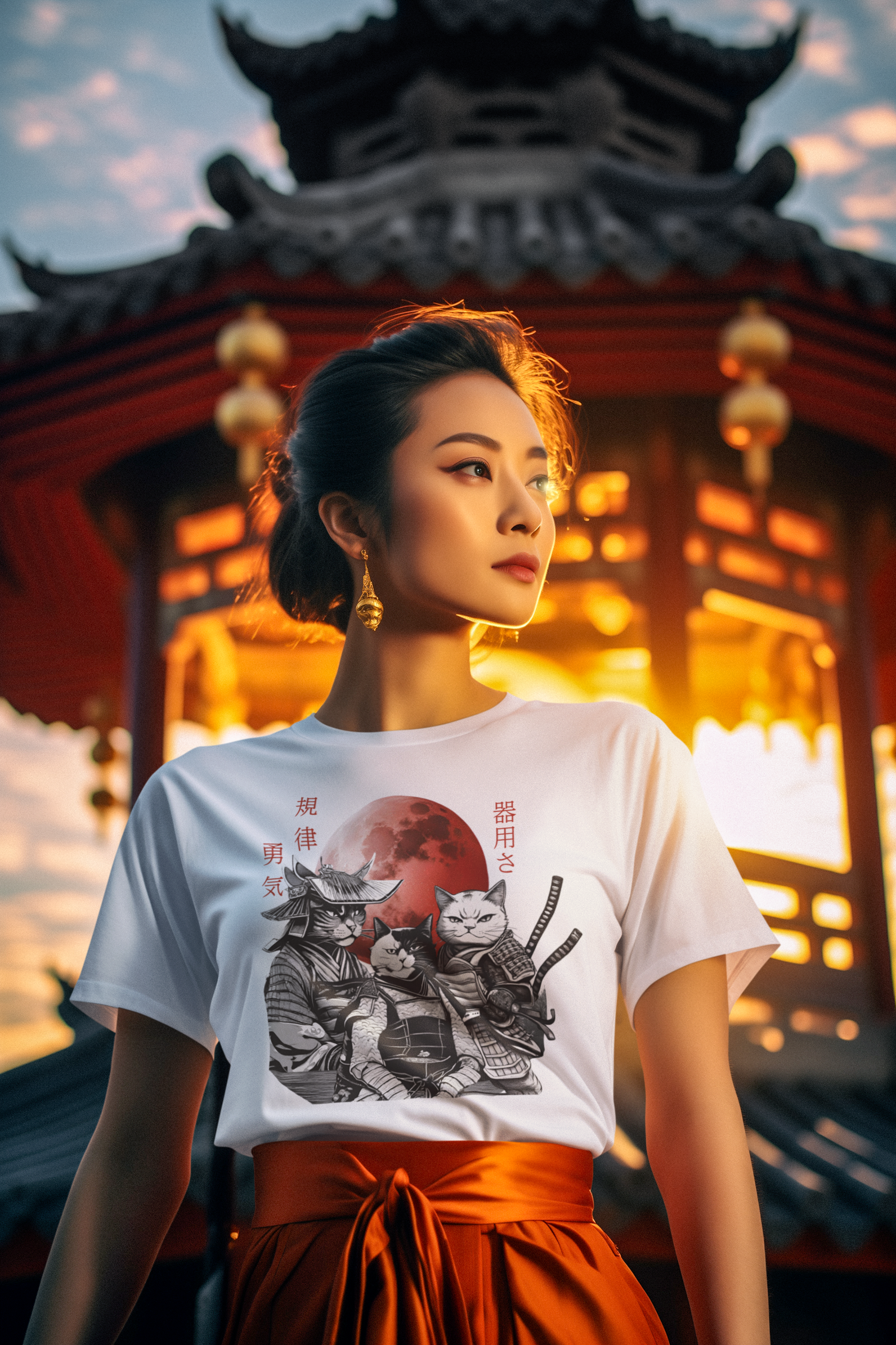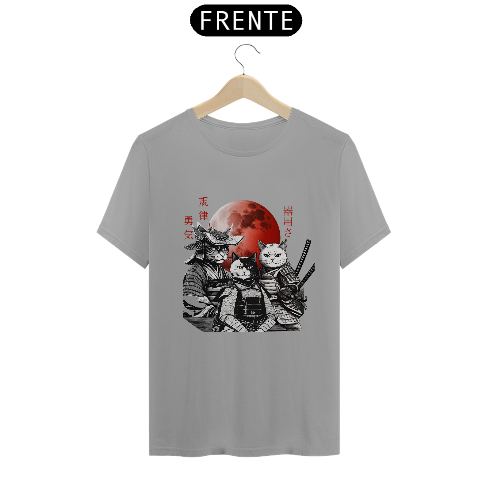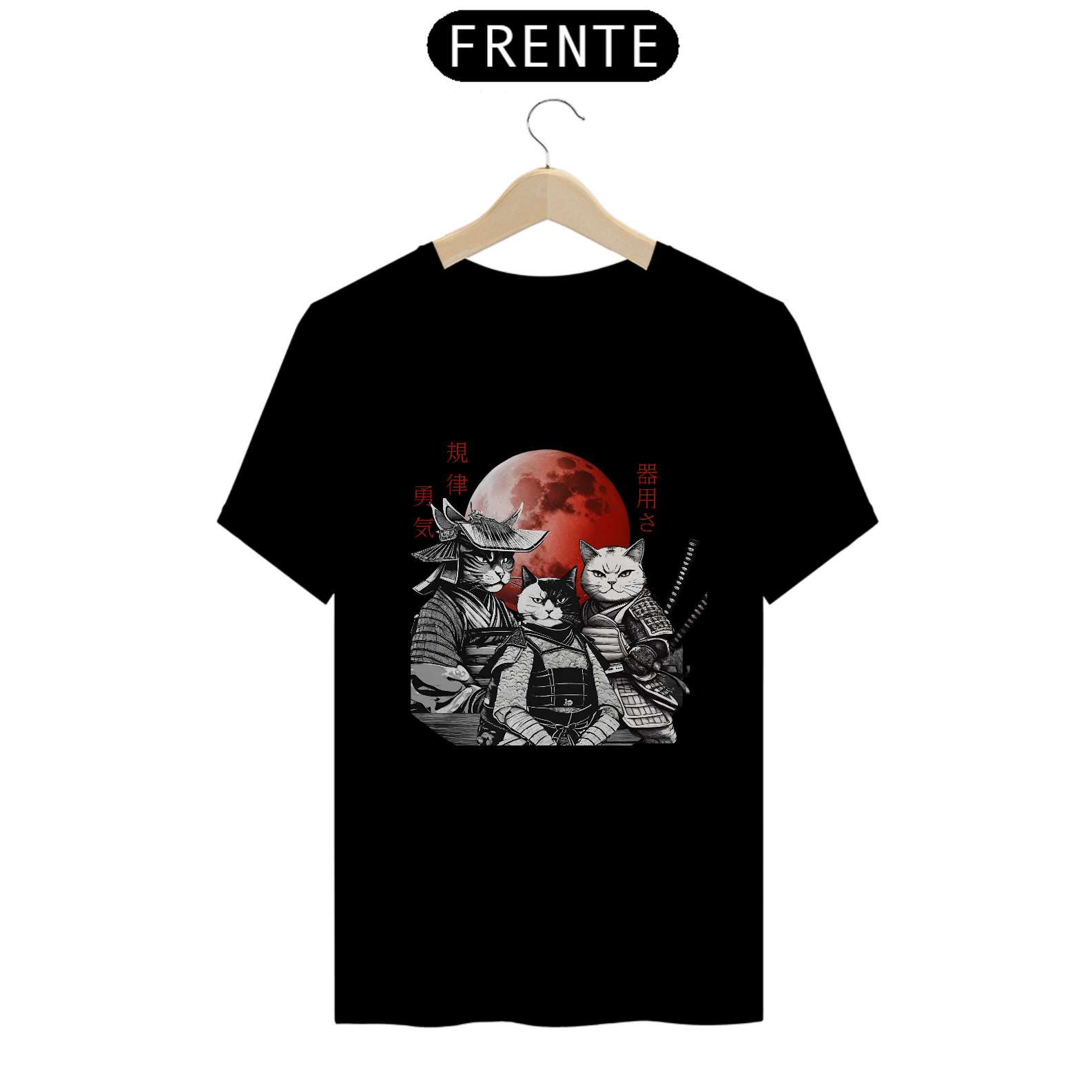 Adicione um toque de elegância e mistério oriental ao seu guarda-roupa com nossa camiseta exclusiva de "Gatos Samurai"!