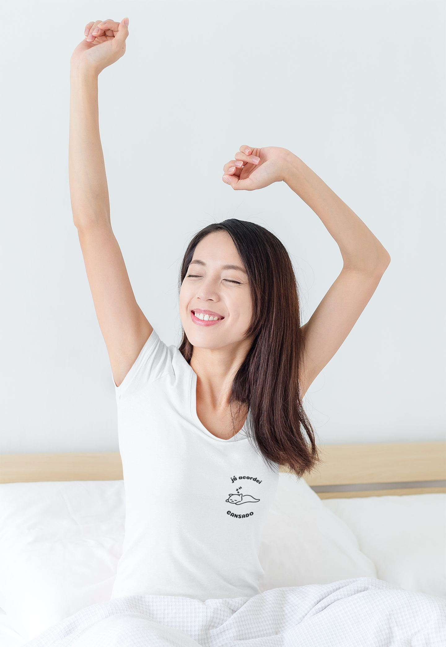 Esta camiseta não só expressa o que muitos de nós sentimos de manhã, mas também adiciona um toque de fofura com o nosso amigo felino preguiçoso.
