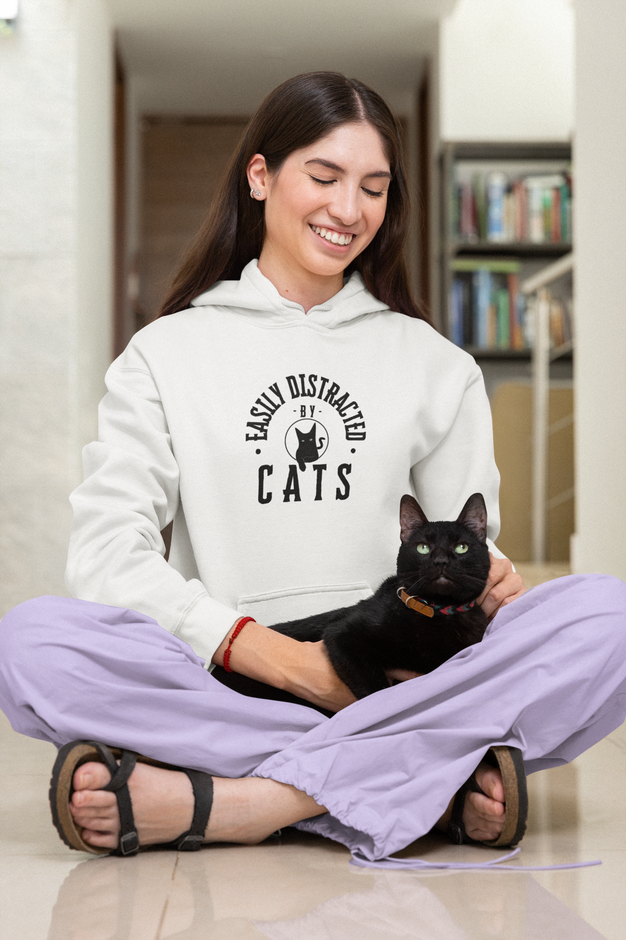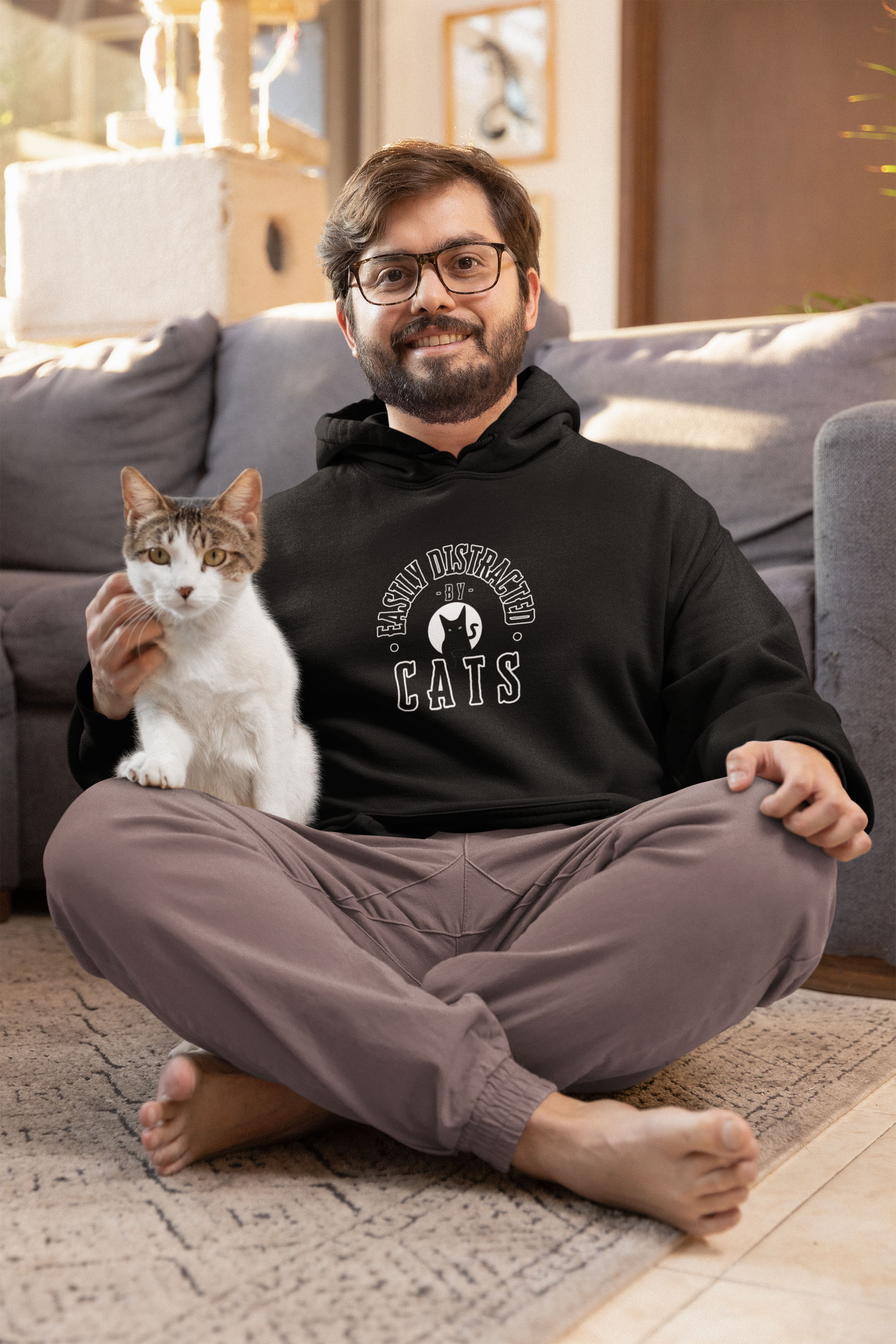 Apresentamos nosso Moletom 'Easily Distracted by Cats' - uma expressão divertida e totalmente verdadeira para todos os gateiros de plantão.