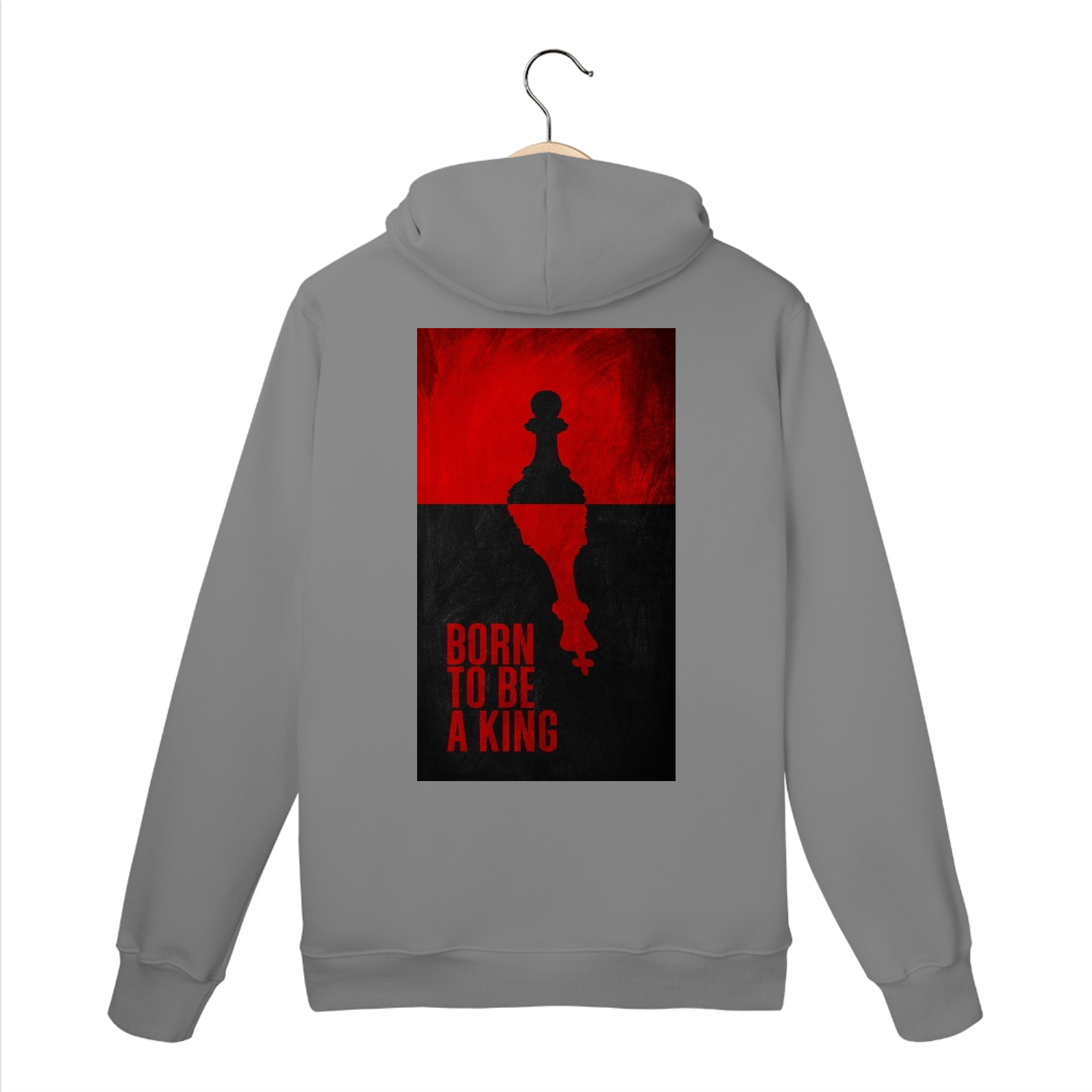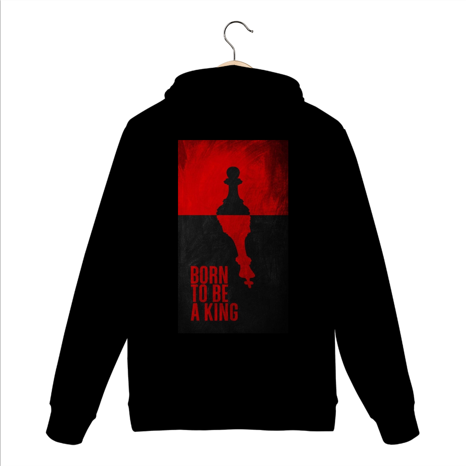 Confeccionado com material de alta qualidade (45% algodão e 55% poliéster), o moletom apresenta interior flanelado, punho e barra em retilínea, proporcionando aquecimento, durabilidade e ajuste perfeito. A estampa nas costas traz um design impactante: um peão de xadrez no topo, refletindo a imagem de um rei, acompanhado pela frase "Born to Be a King". Essa arte simboliza crescimento, superação e a busca incessante por excelência pessoal.