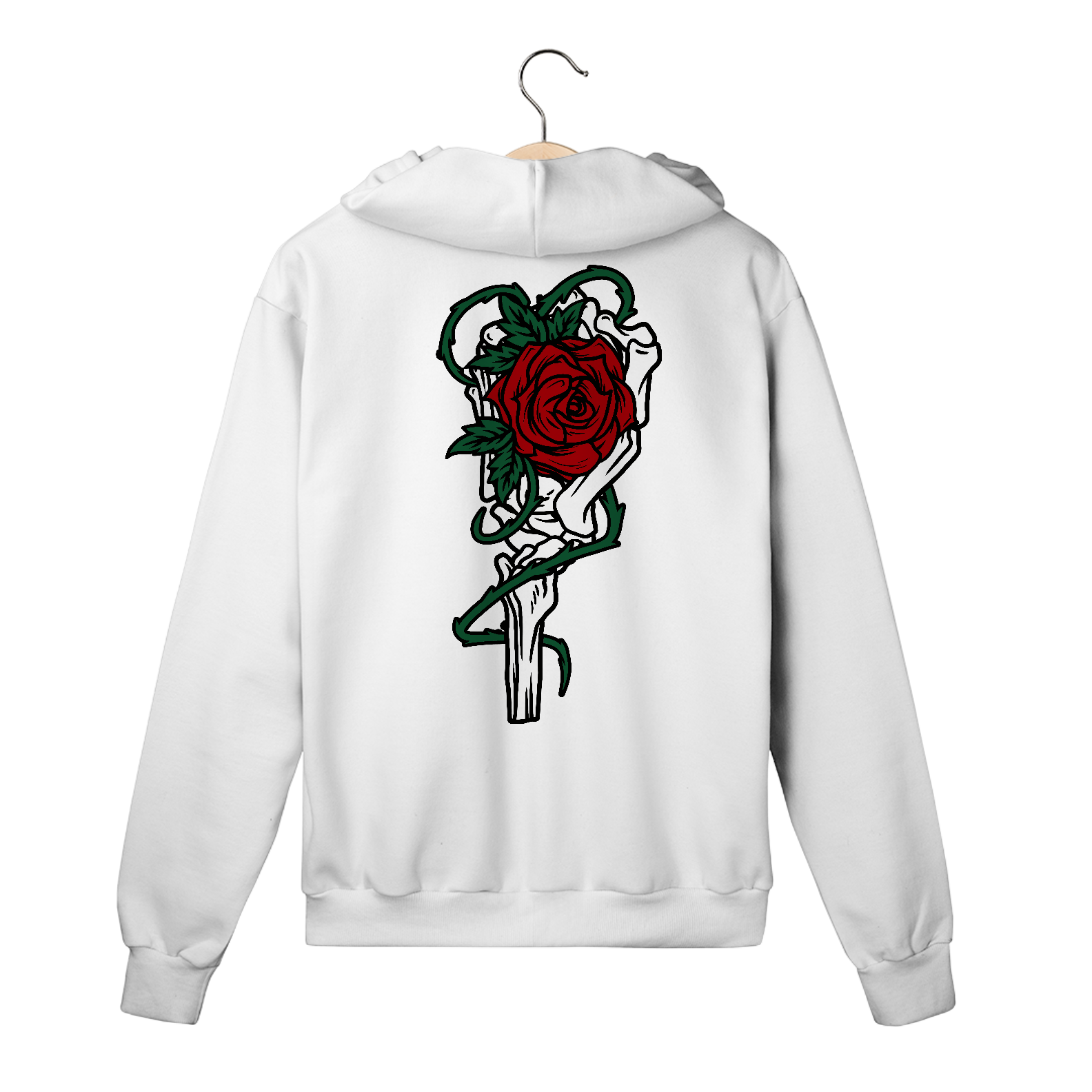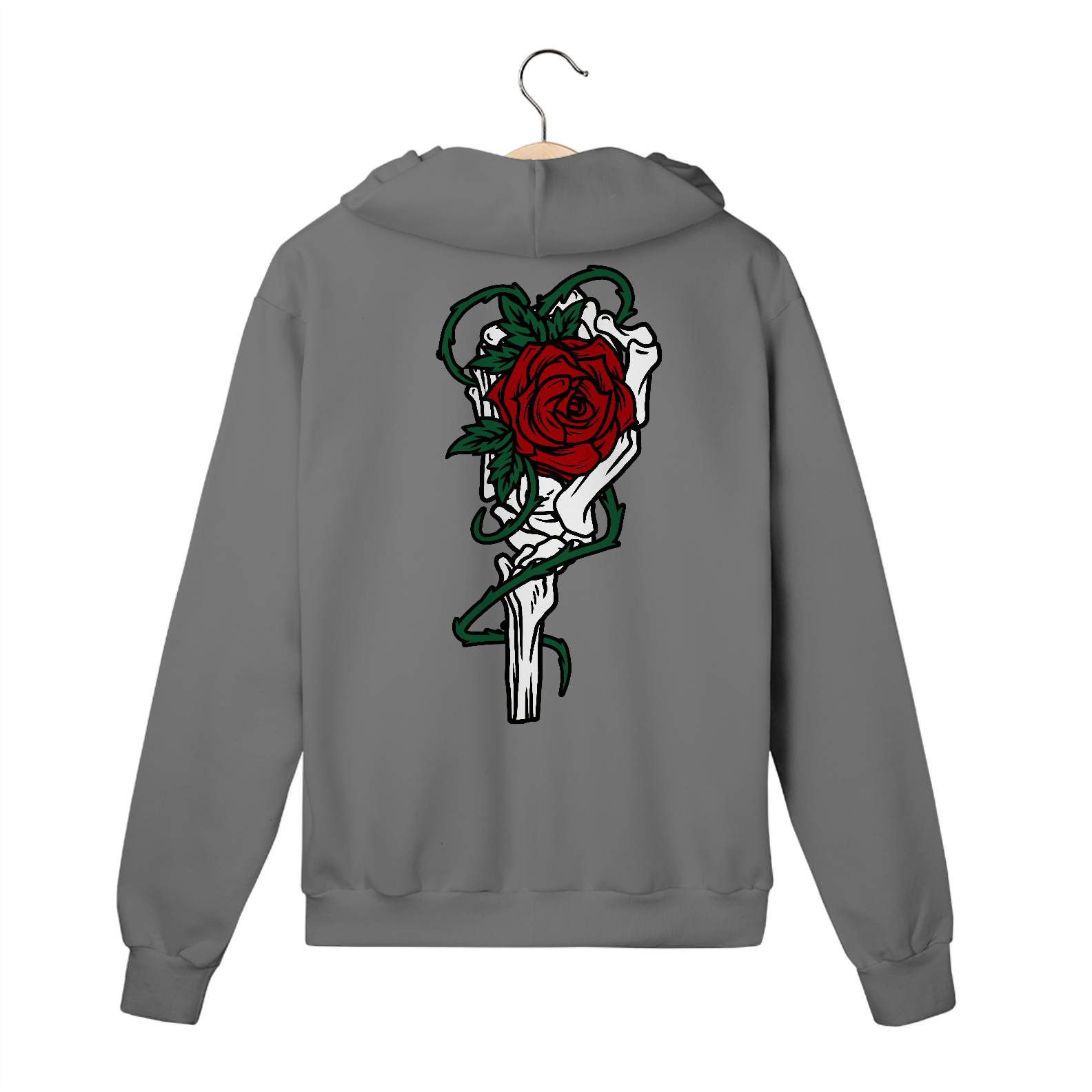 Com design moderno e uma estampa única de mão de ossos segurando uma flor, este moletom com zíper combina perfeitamente praticidade e personalidade. Disponível em cores atemporais como branco, preto e cinza-mescla, ele se adapta a diversas ocasiões, desde atividades casuais até momentos de descontração no dia a dia.