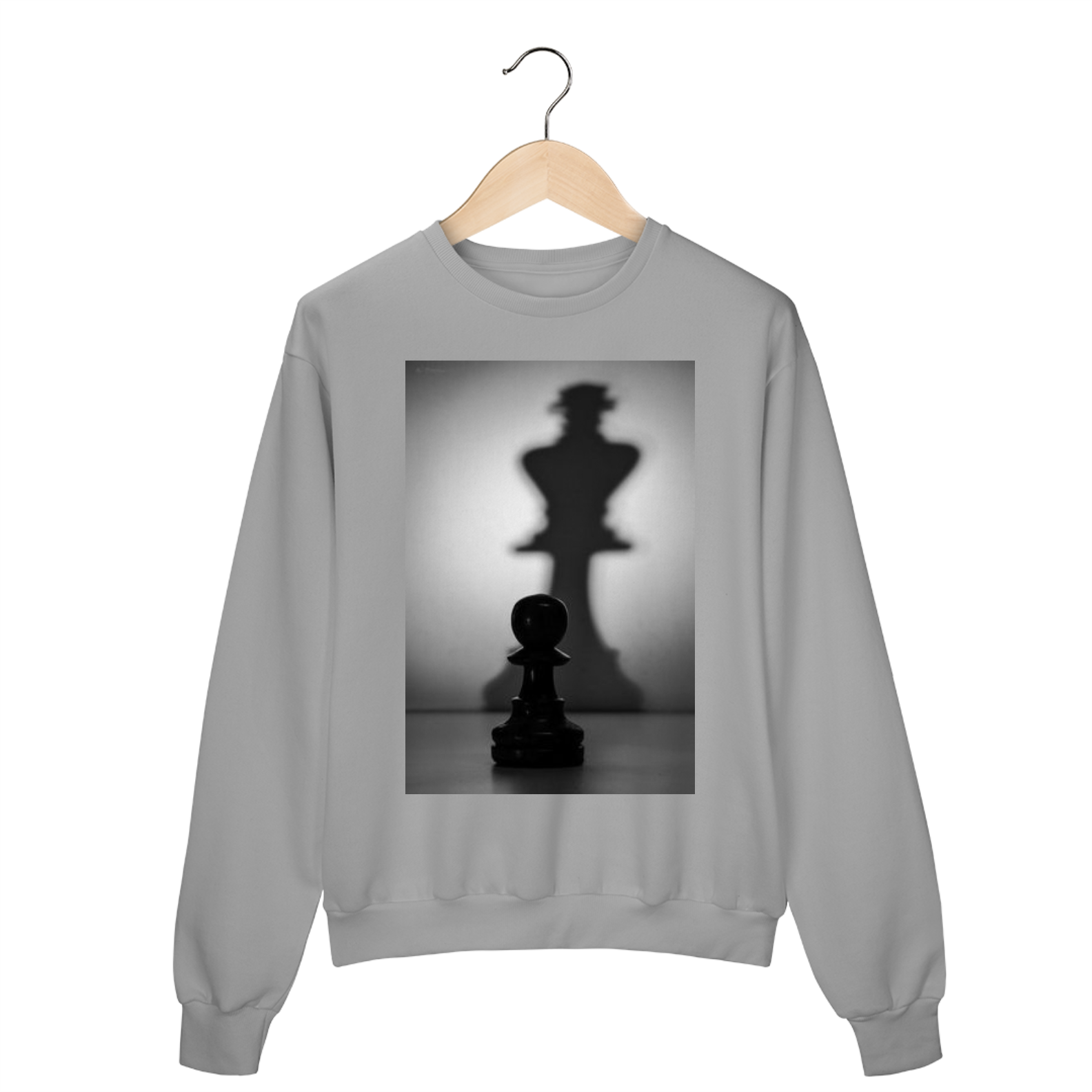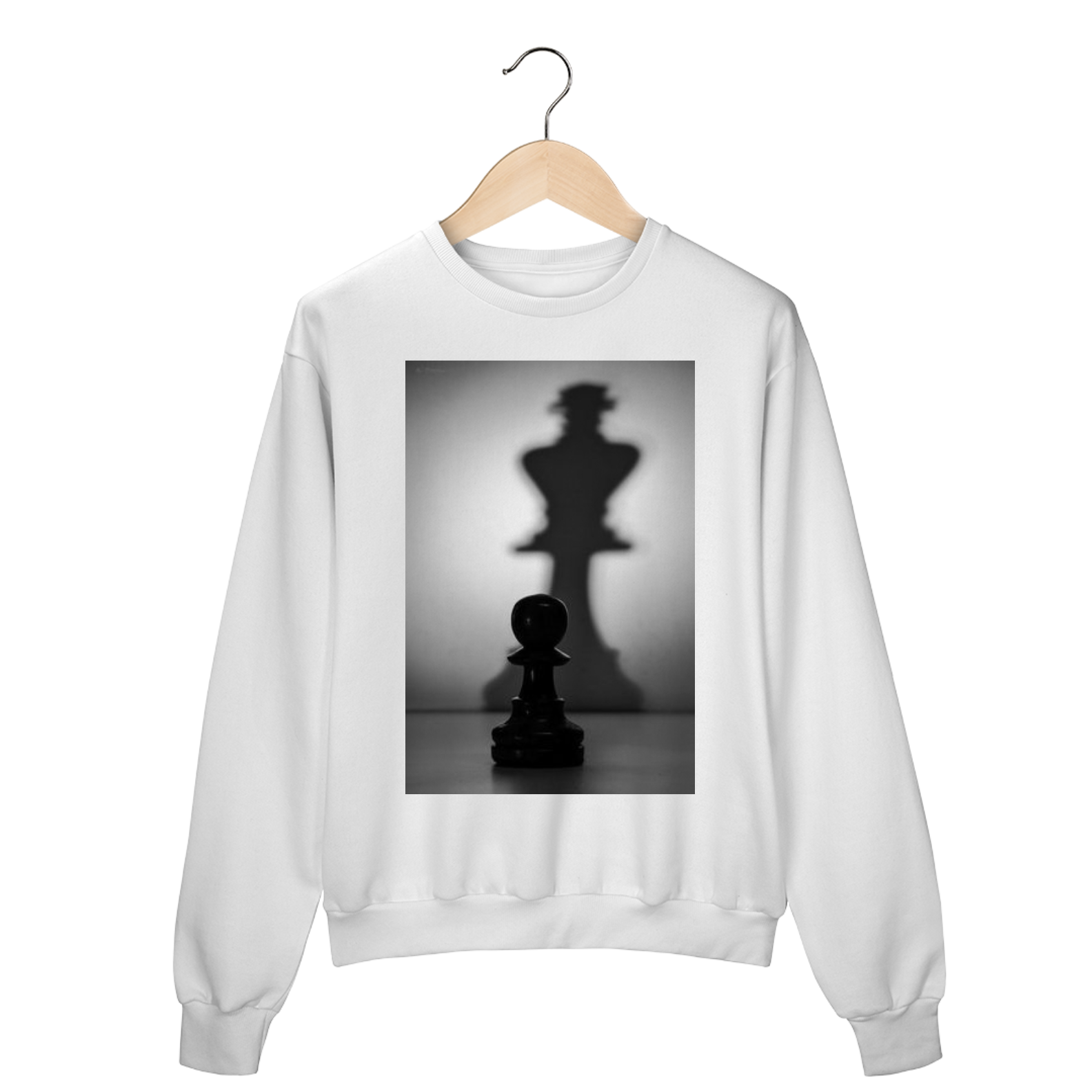 Com uma estampa frontal centralizada, o moletom apresenta um peão de xadrez e um rei, representando a transformação de humildes começos em grandes realizações. Essa peça captura a essência de determinação e foco, lembrando que cada passo te aproxima do seu potencial máximo.