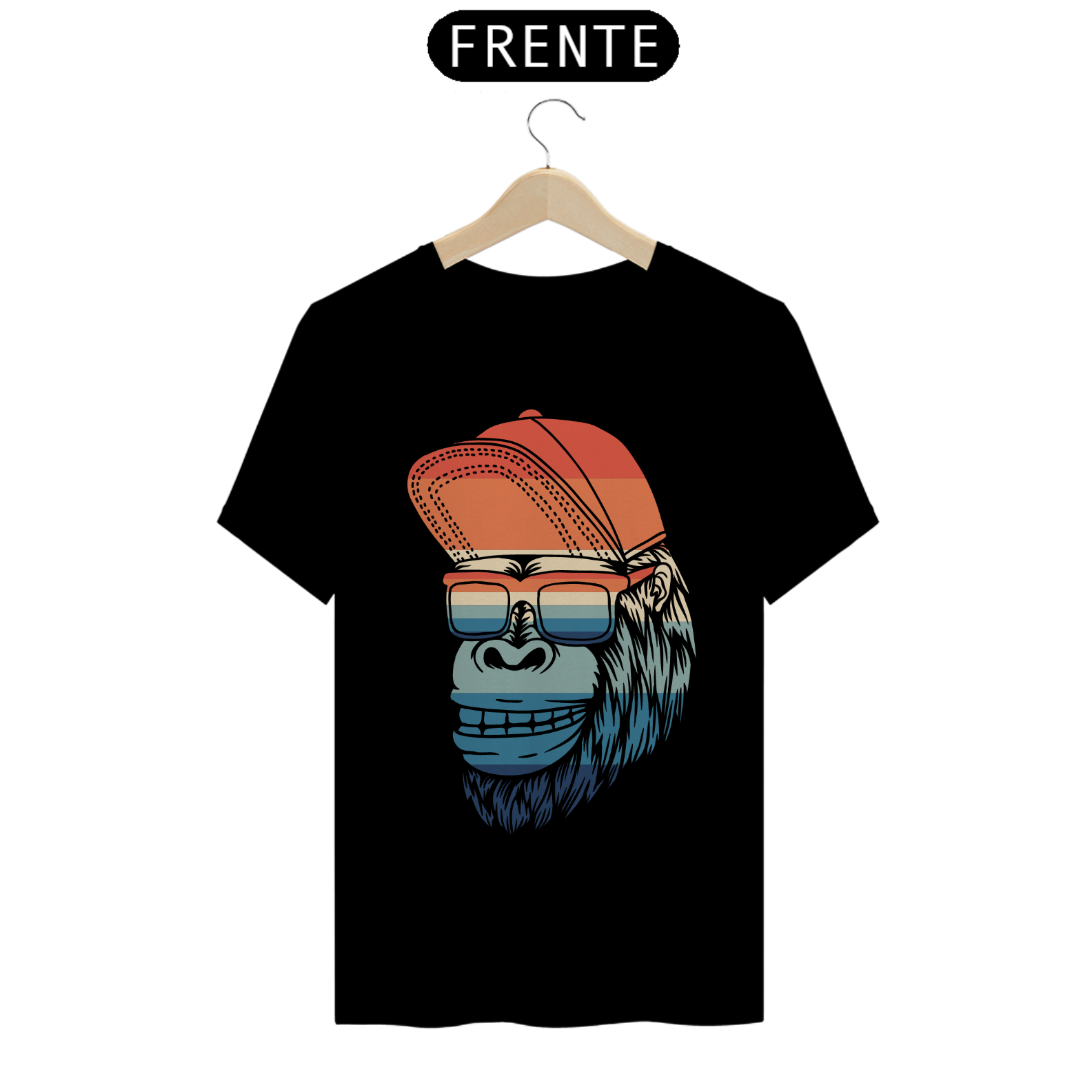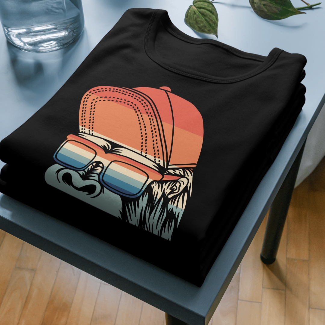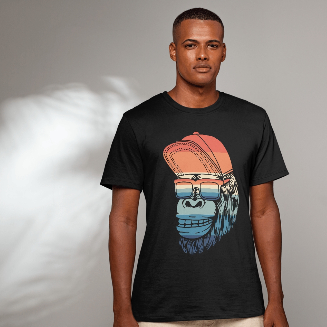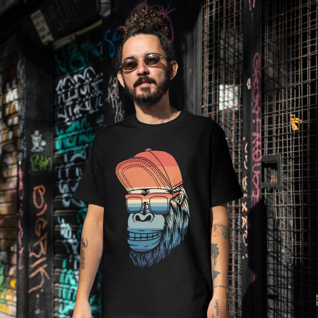 Explore a selva urbana com a Camiseta Black. Gorila Style! Esta camiseta apresenta uma estampa divertida de um gorila usando um boné e óculos coloridos, combinando o charme selvagem com um toque de moda urbana, é ideal para quem busca um visual único e cheio de personalidade.
