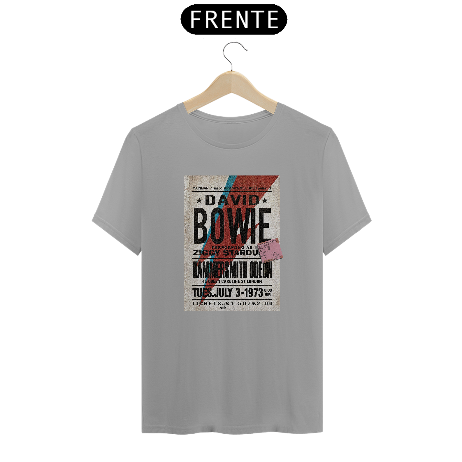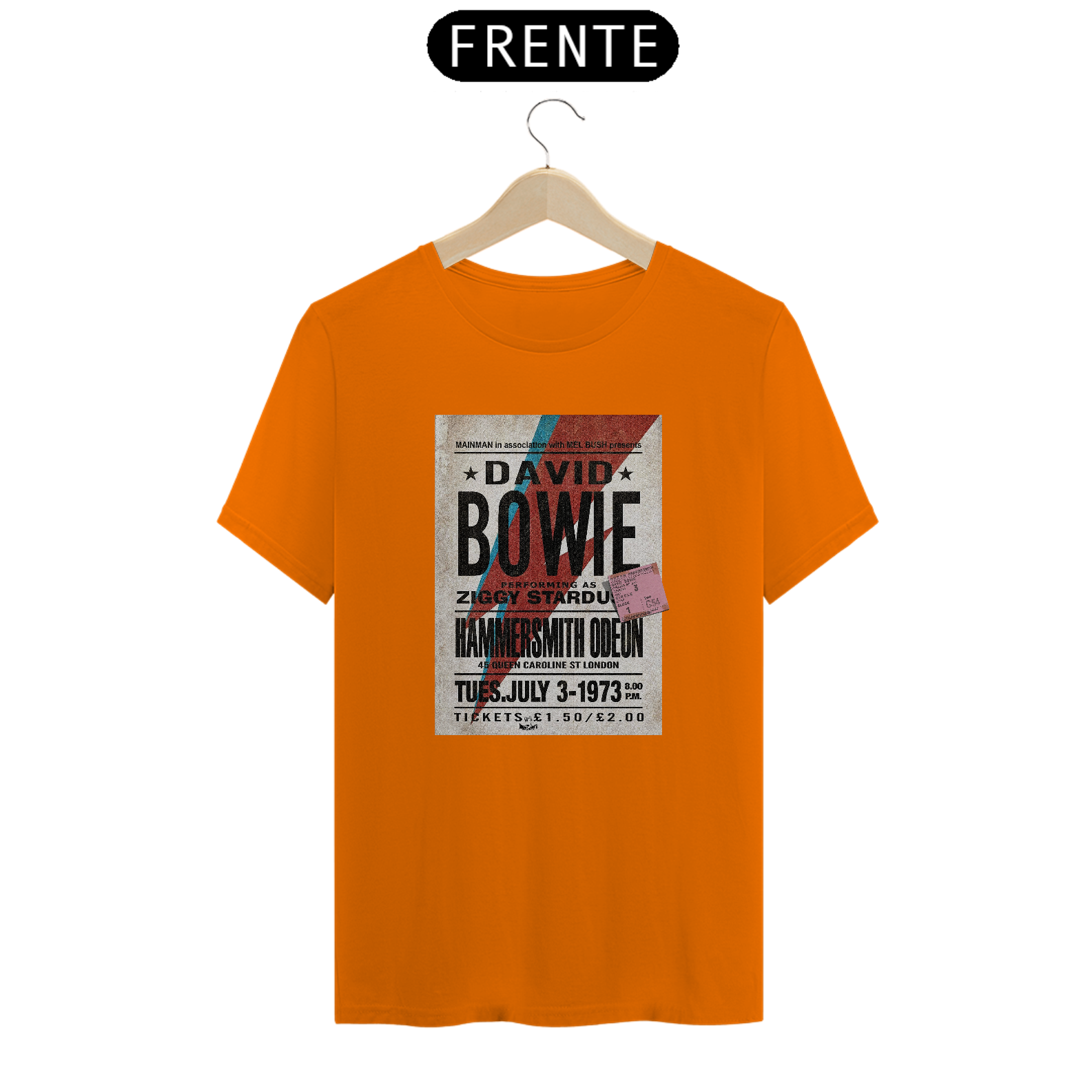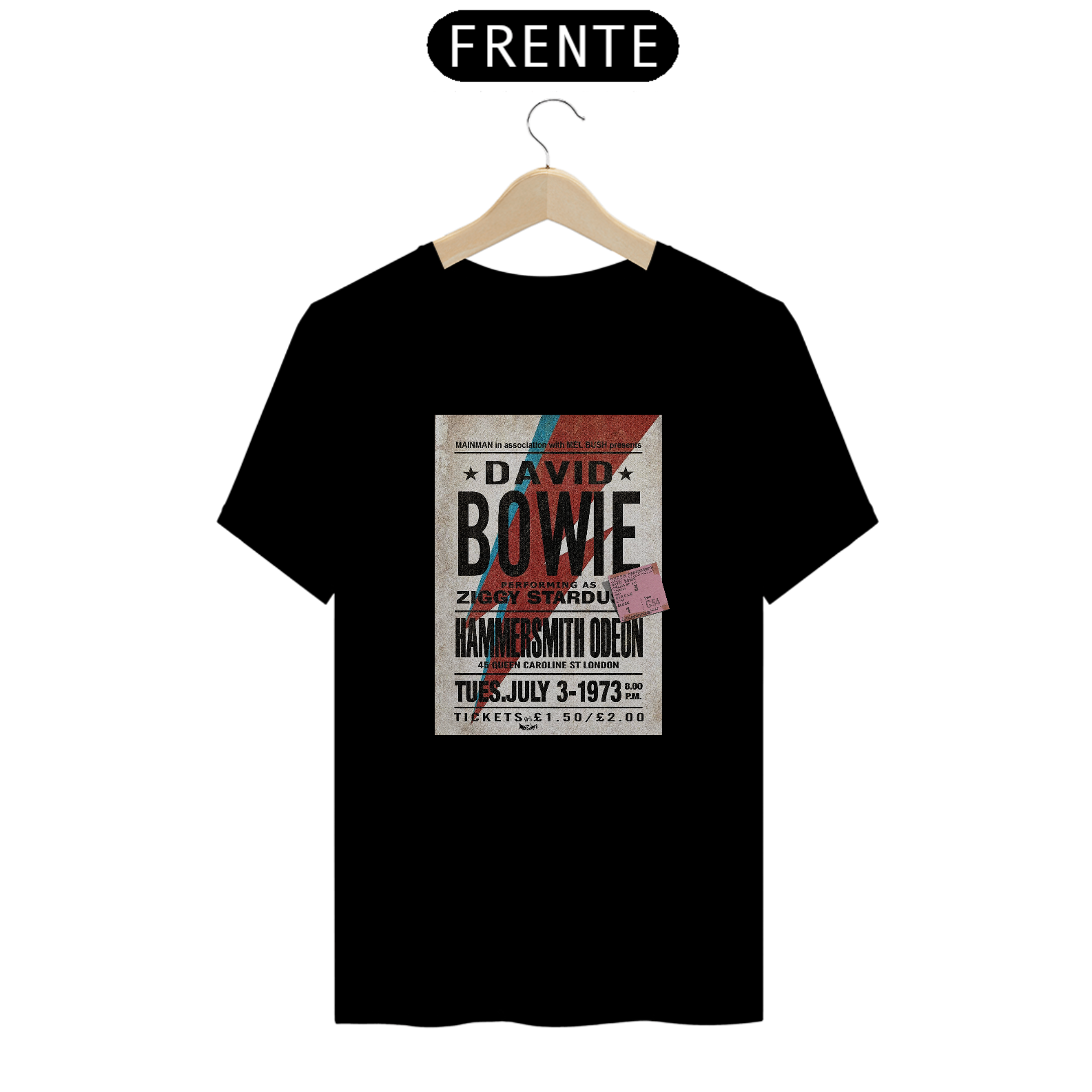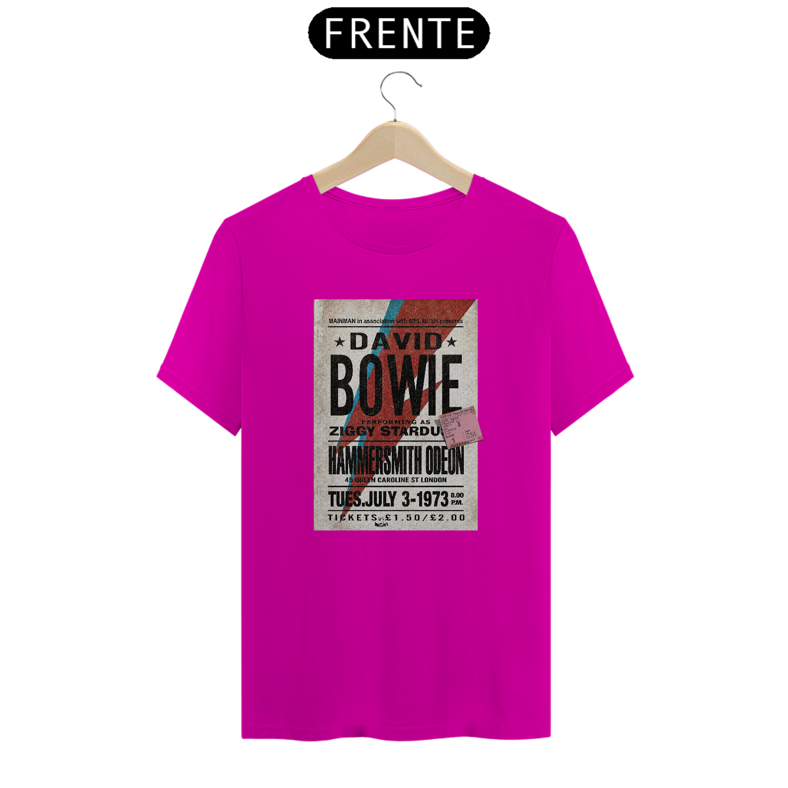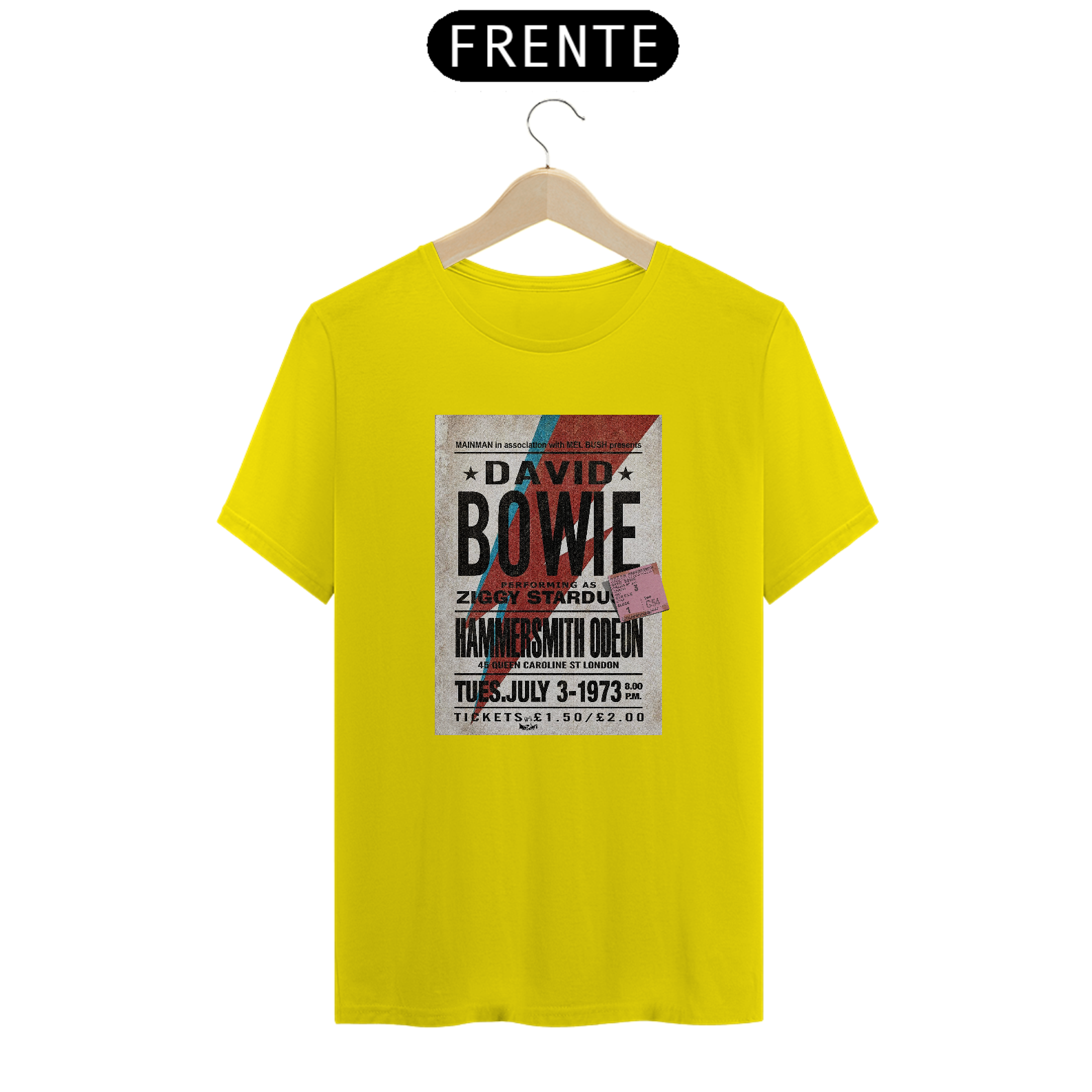 Estampa clássica da divulgação do Show de David Bowie Ziggy Stardust com seu ingresso original incluso na estampa. Além da raridade do poster, a estampa traz esse detalhe mais que especial, do ingresso original e exclusivo do concerto.