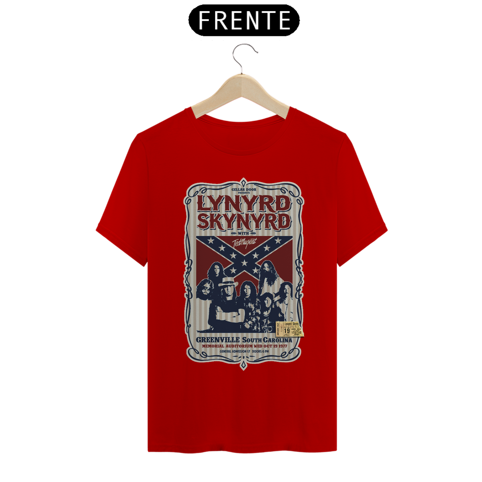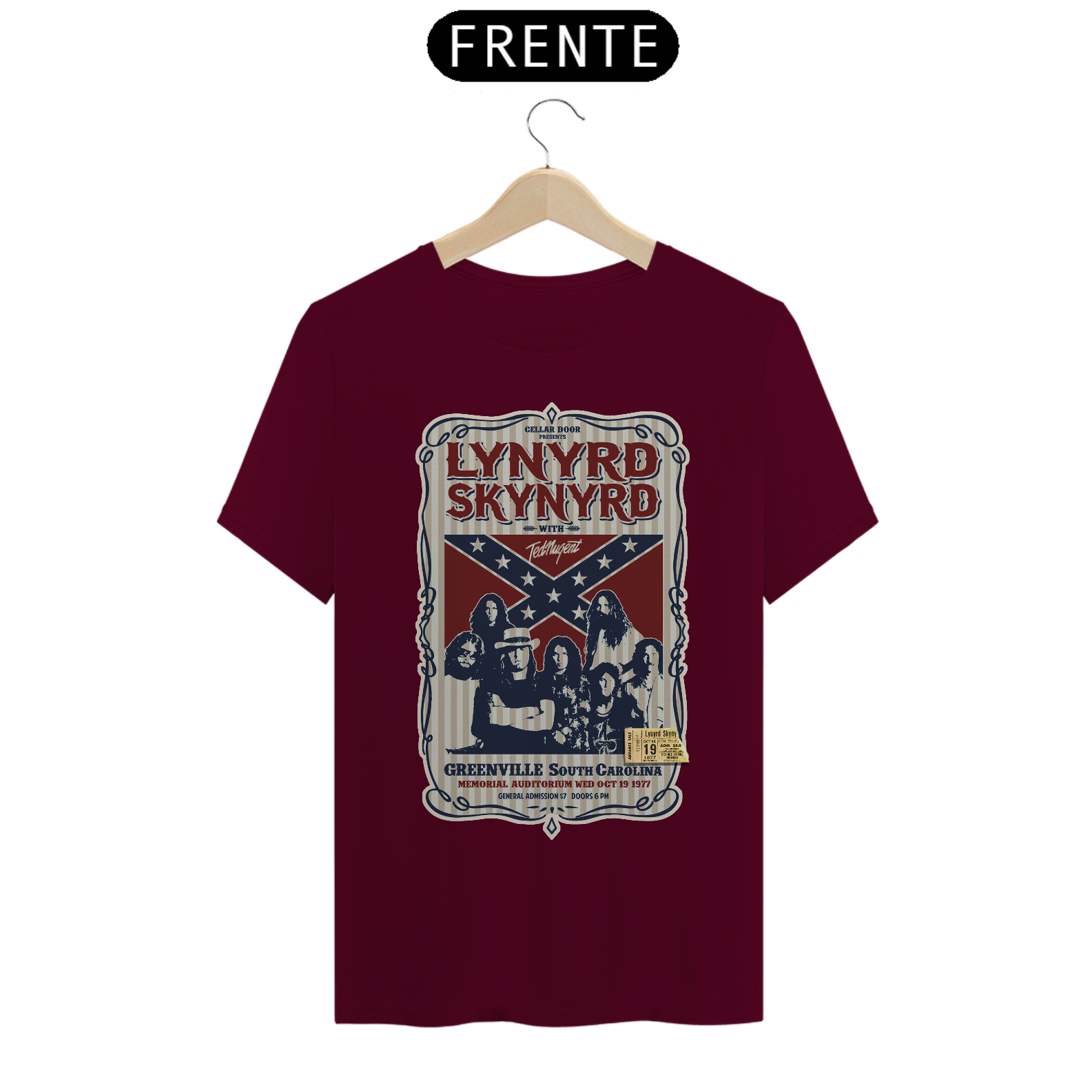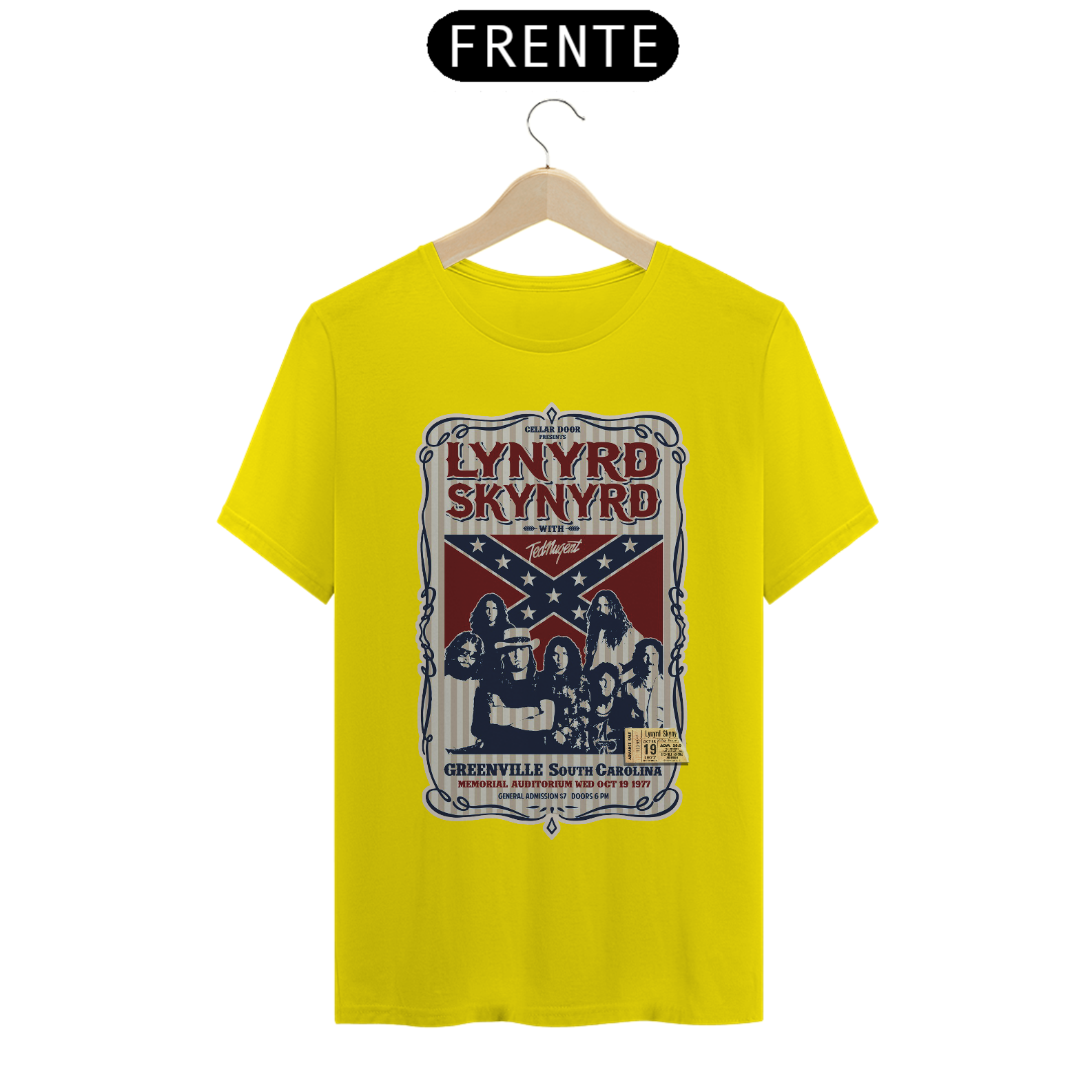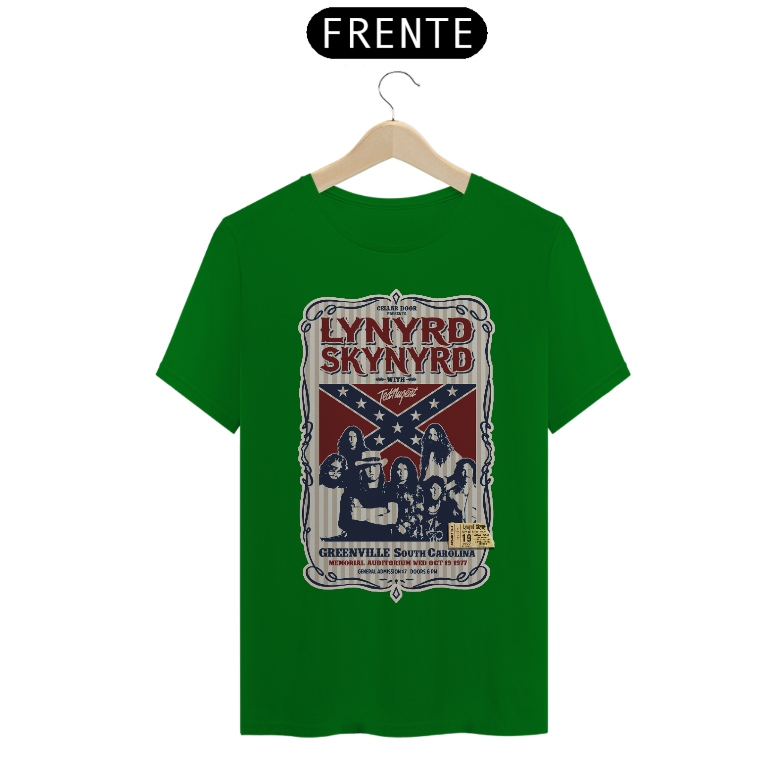 Poster de divulgação do show Lynyrd Skynyrd Show na Carolina do Sul em 1977 com seu ingresso original