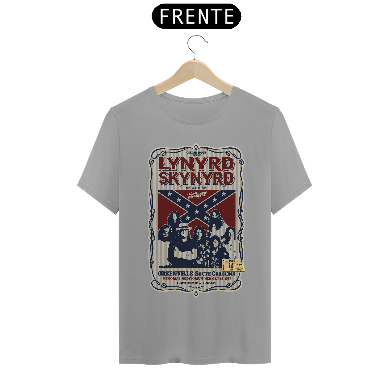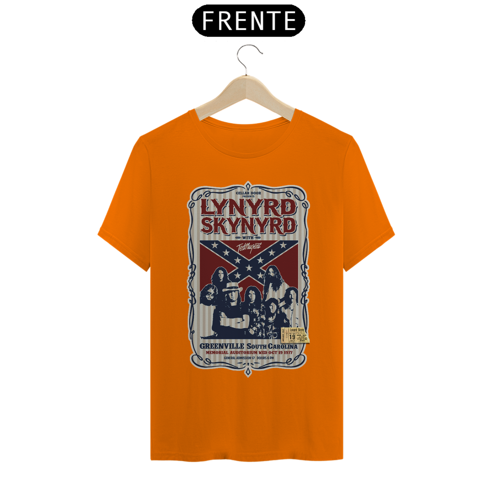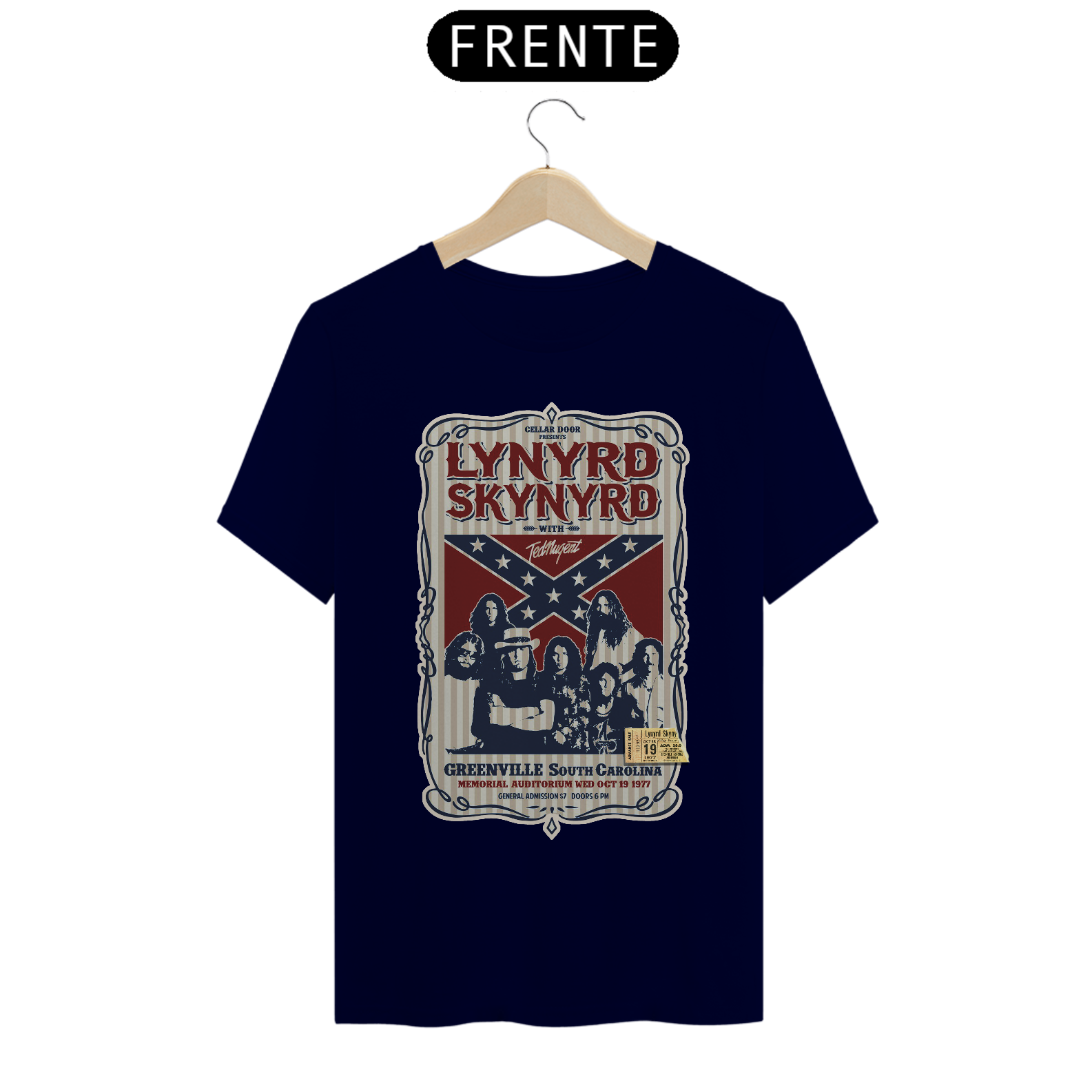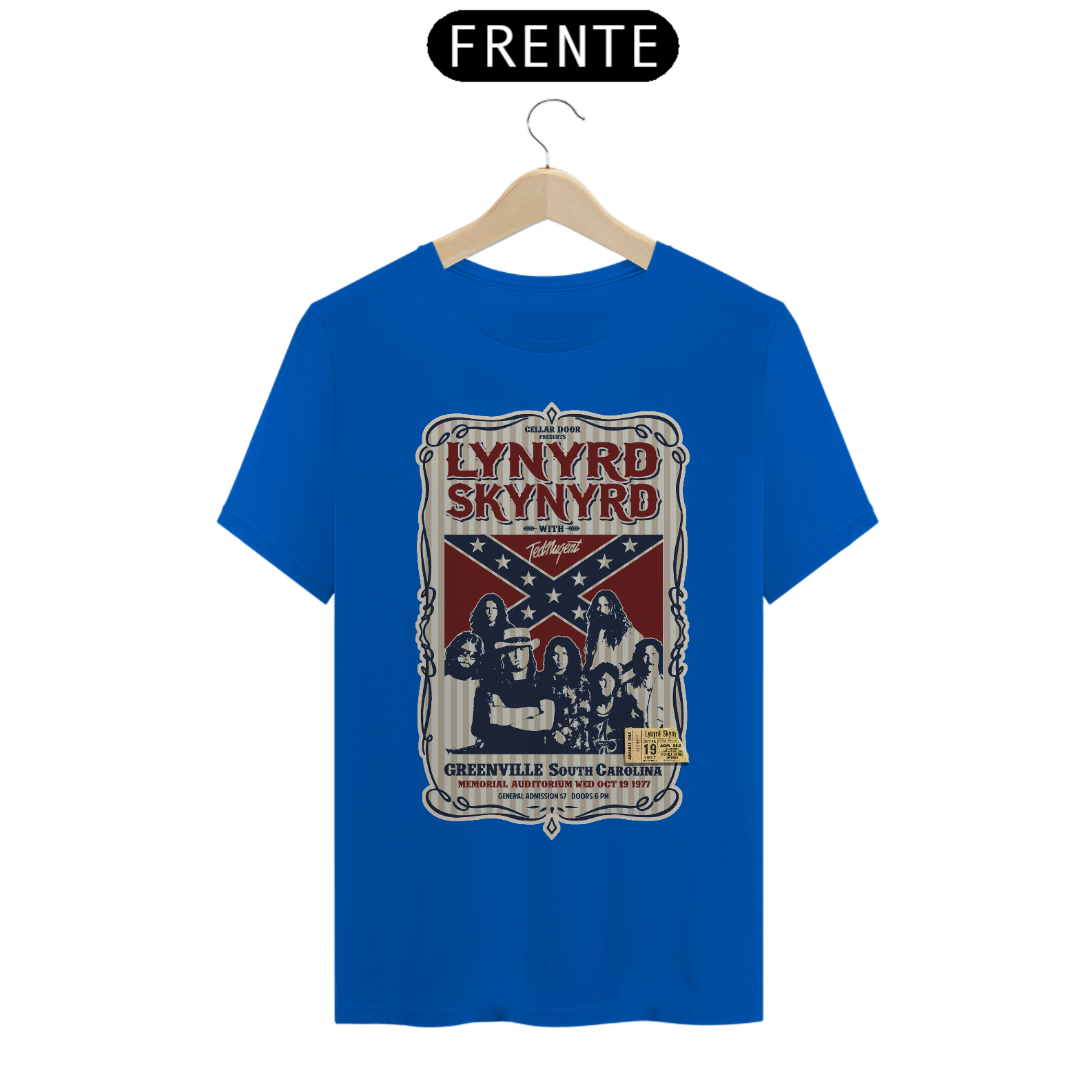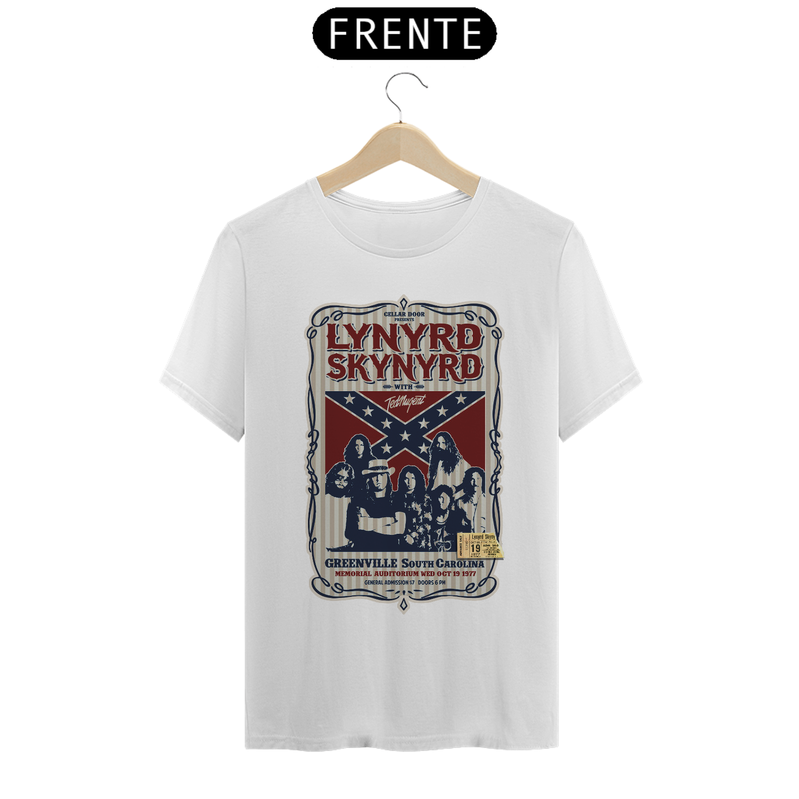 Poster de divulgação do show Lynyrd Skynyrd Show na Carolina do Sul em 1977 com seu ingresso original