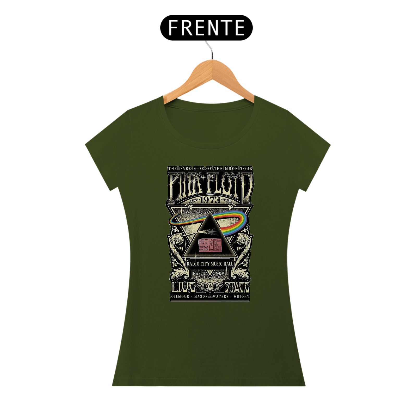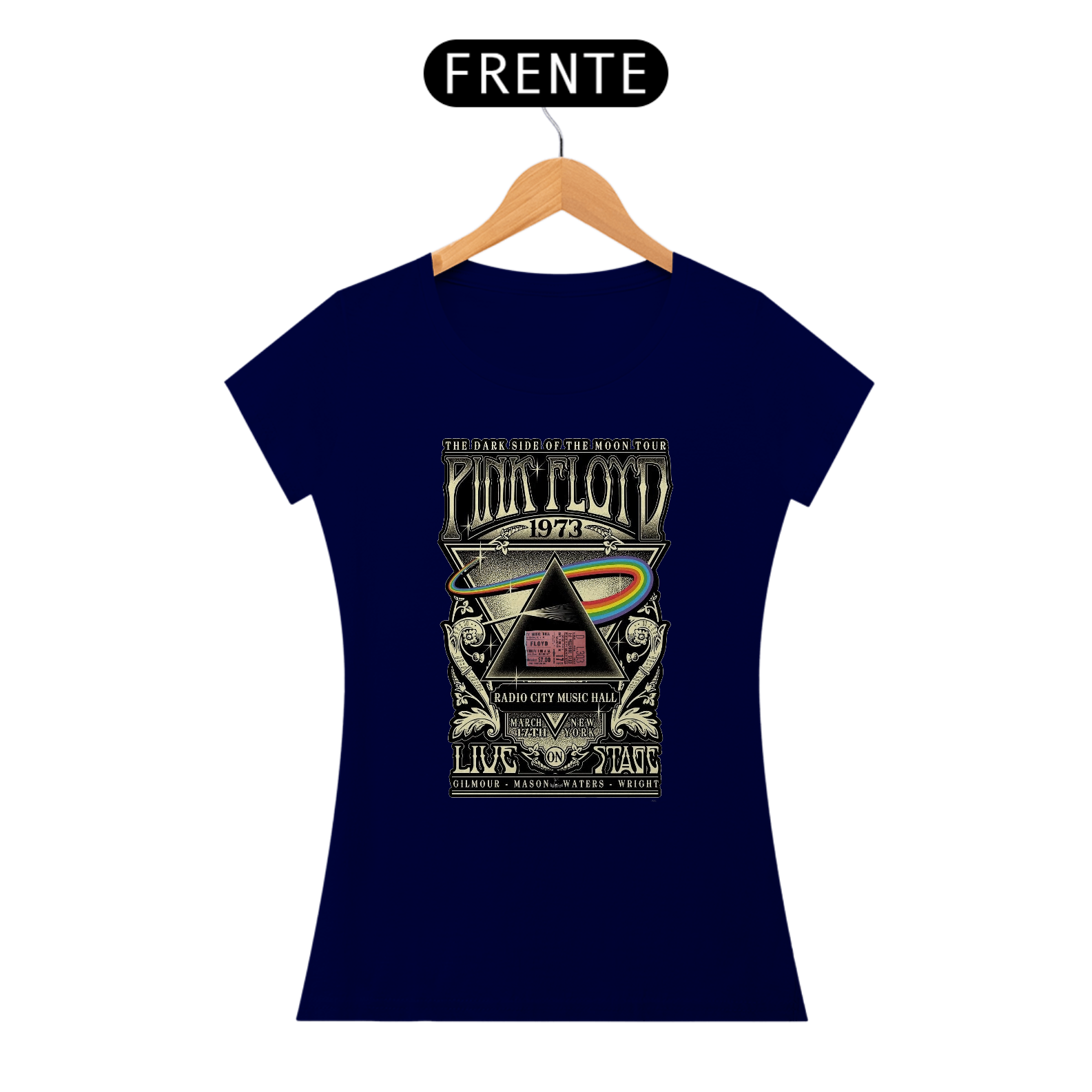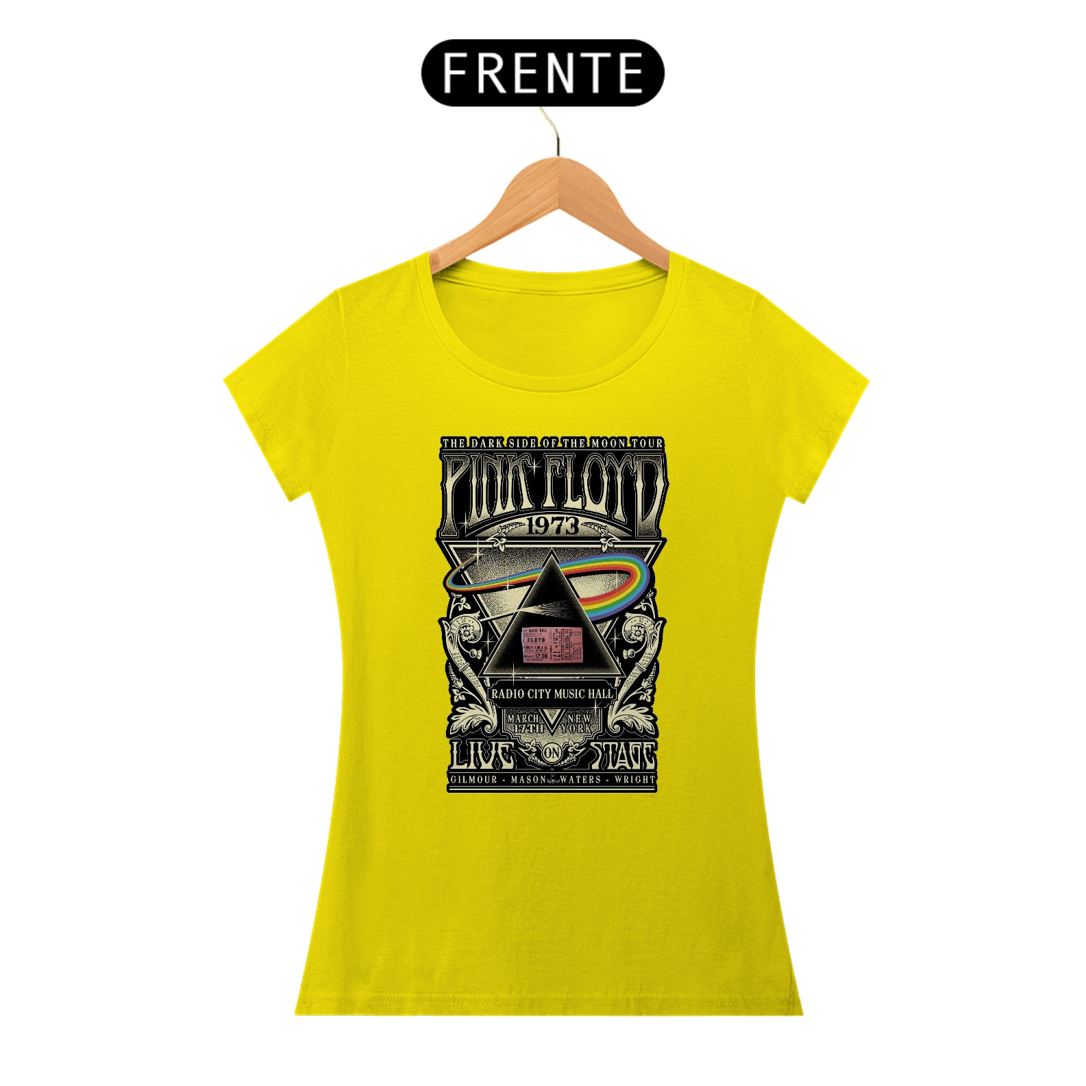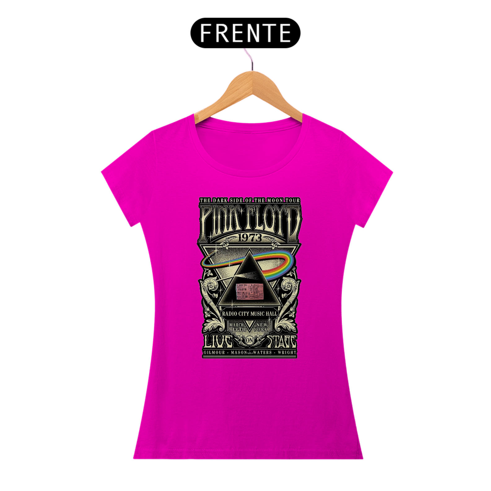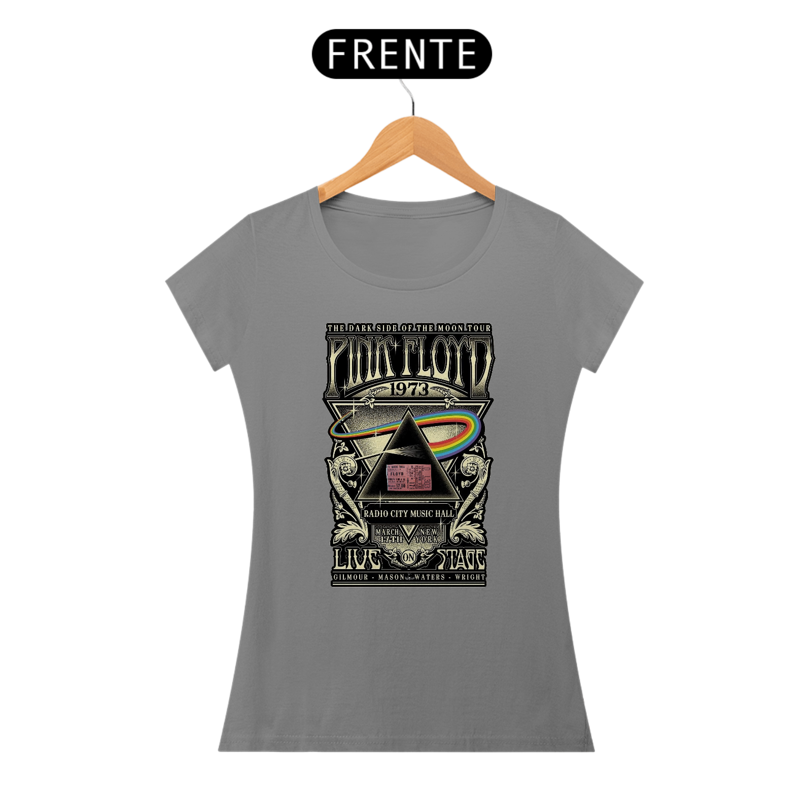 BabyLook feminina Clássica e raríssima do Show do Pink Floyd em Nova York com seu ingresso Original na estampa de concerto Dark Side Of The Moon de 1073