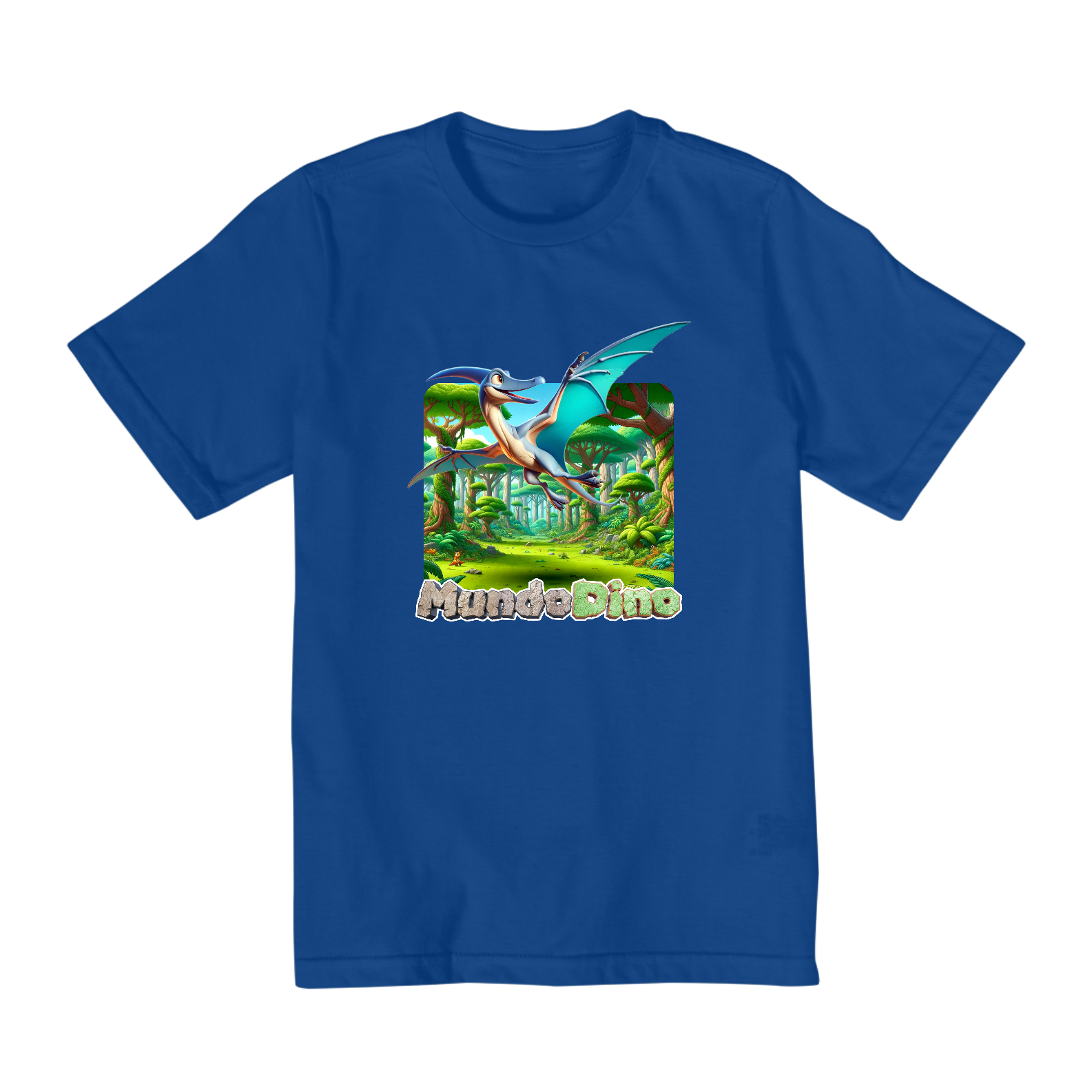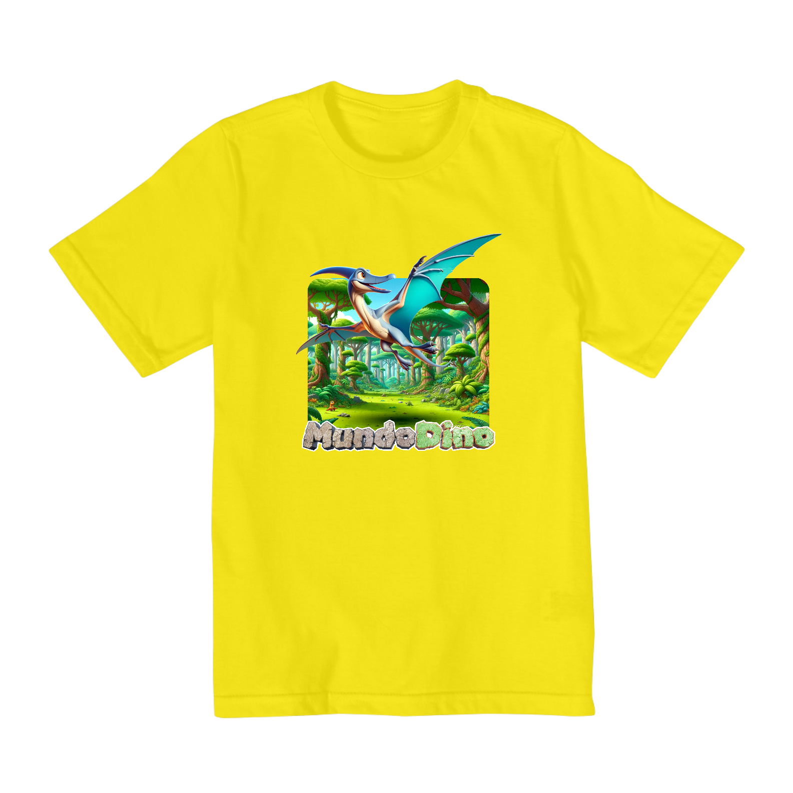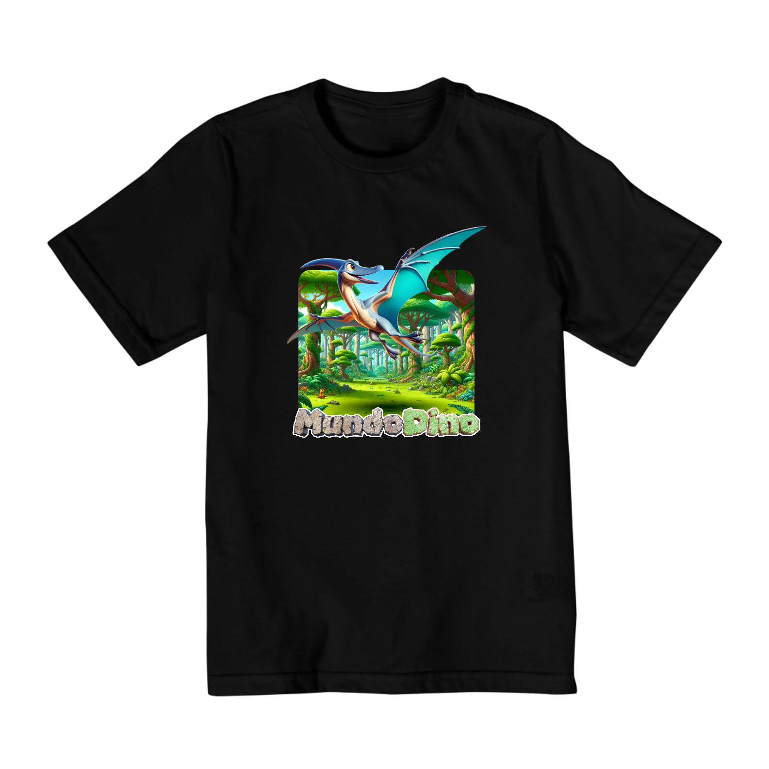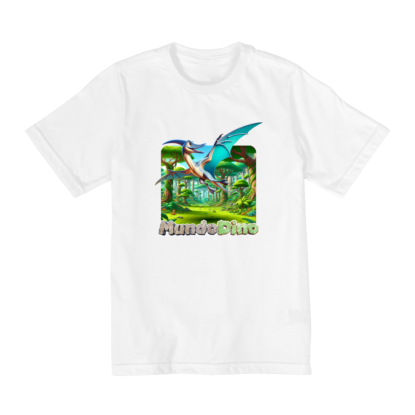 Camiseta infantil com tema de Dinossauro, sendo este modelo do Pterodactilo do Mundo Dino. Numeração de 02 a 08.