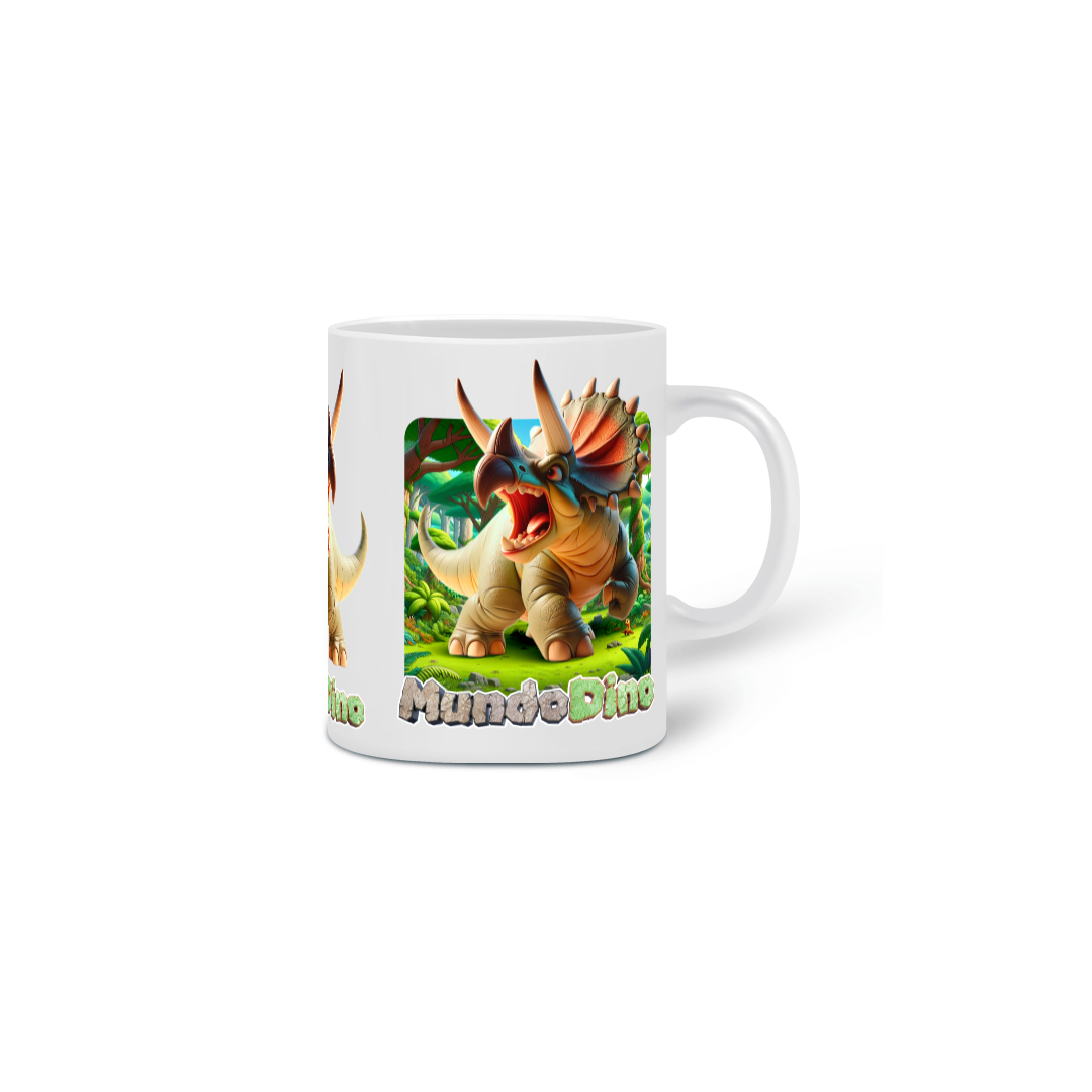 Caneca de porcelana com o tema de Dinossauro, sendo esse modelo o Triceratops do Mundo Dino.