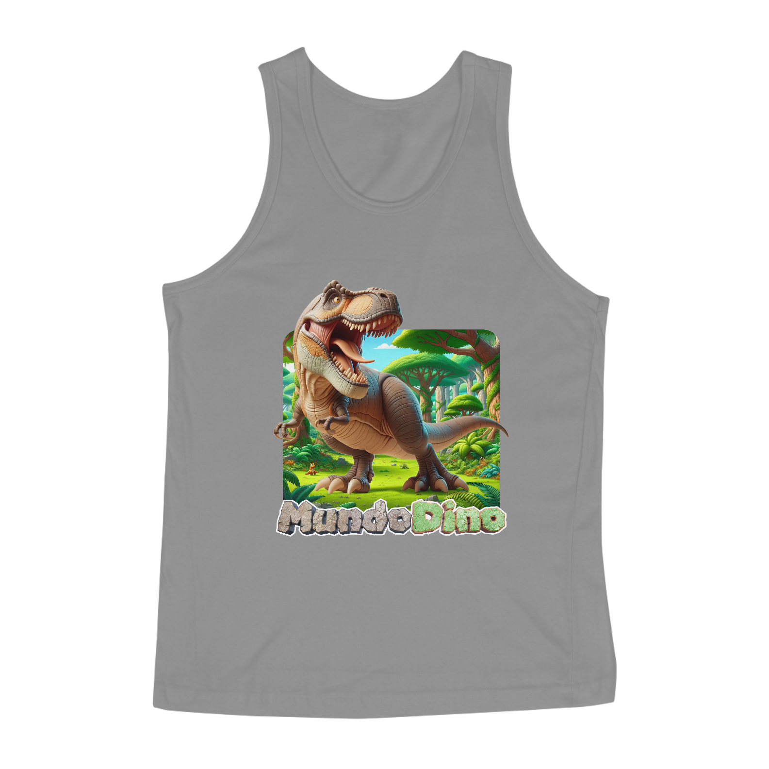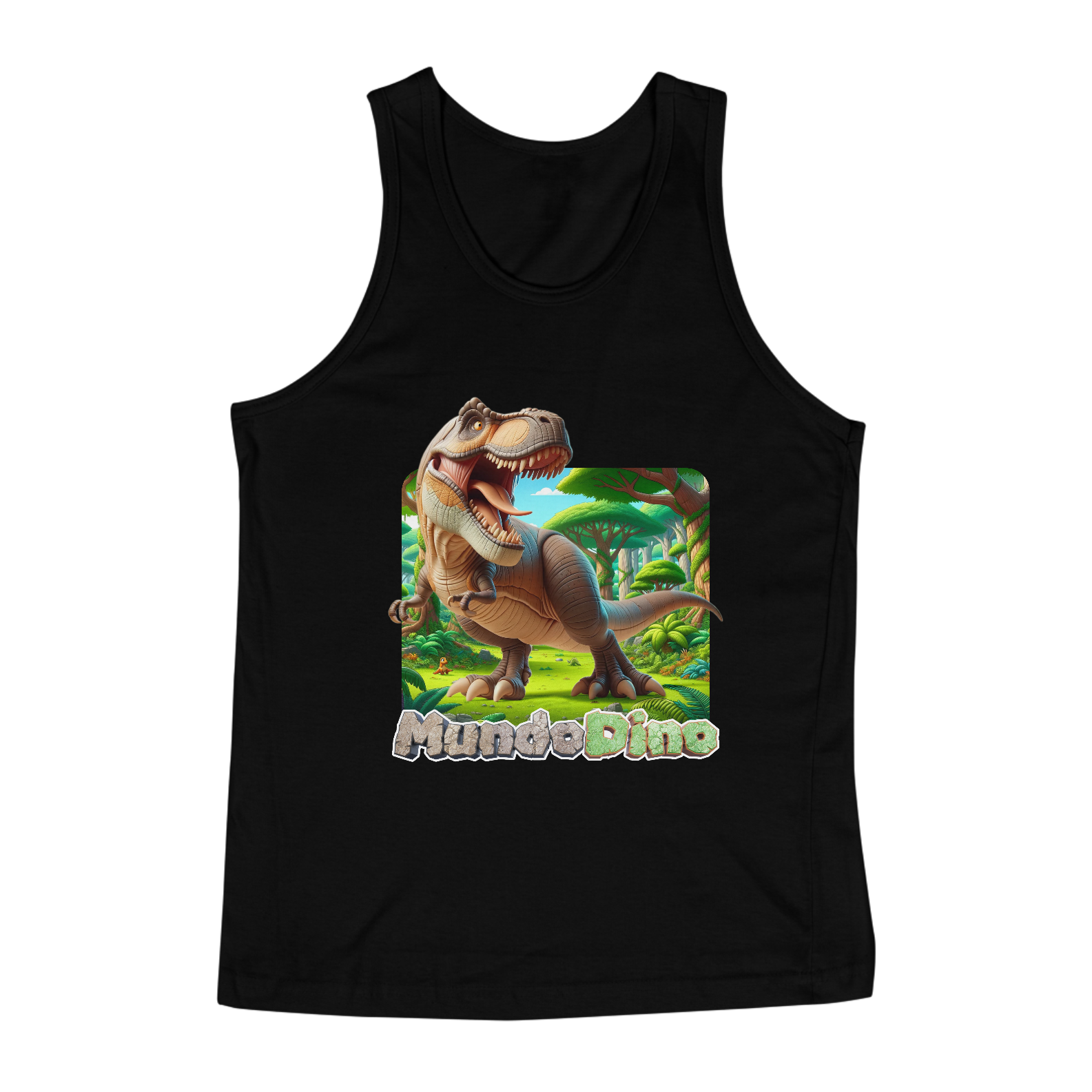 Camiseta Regata com tema de Dinossauro, sendo esse modelo o Tiranossauro Rex.