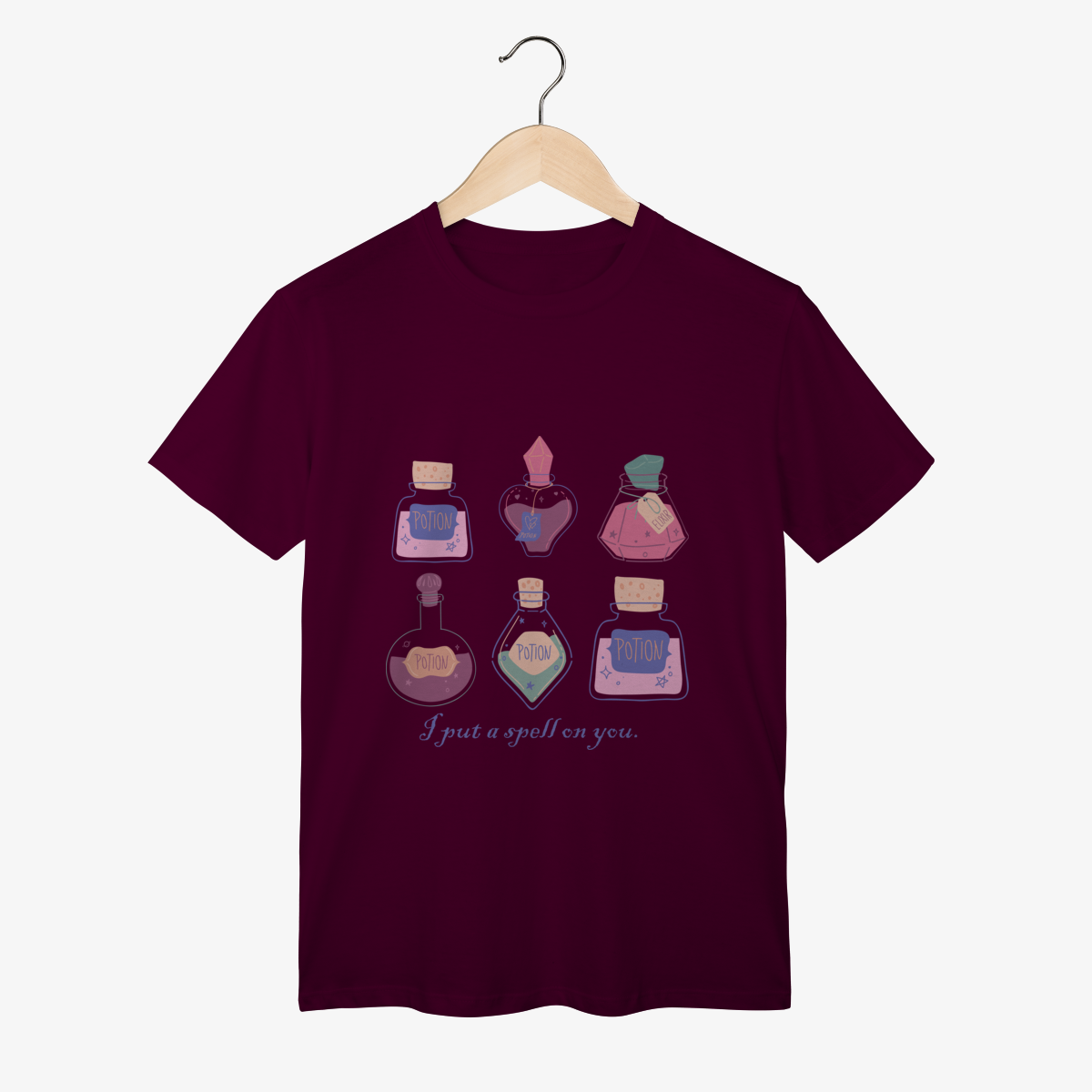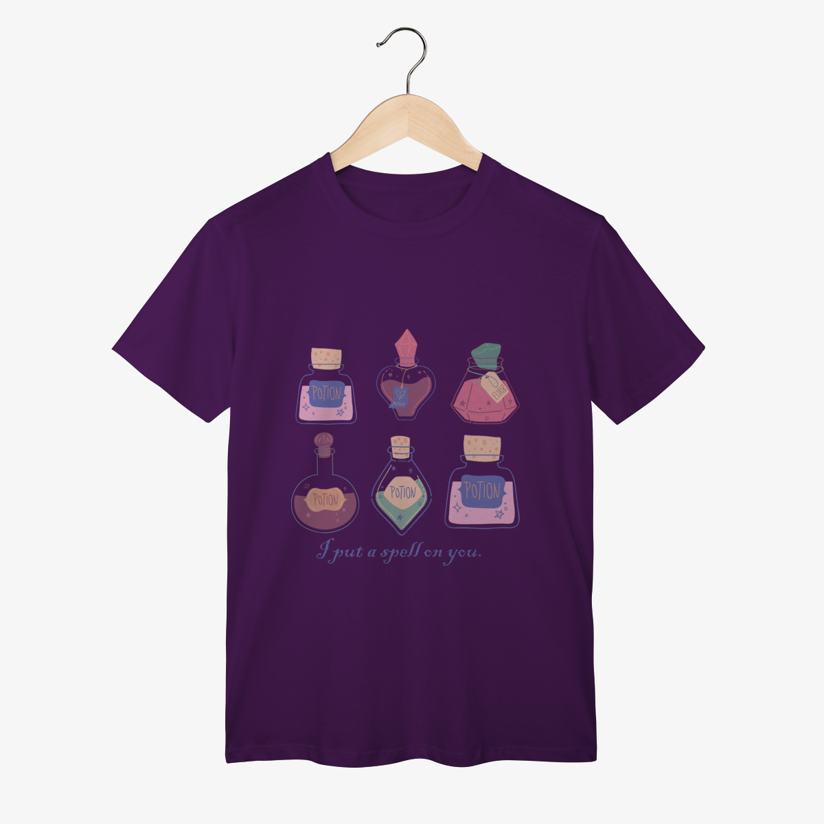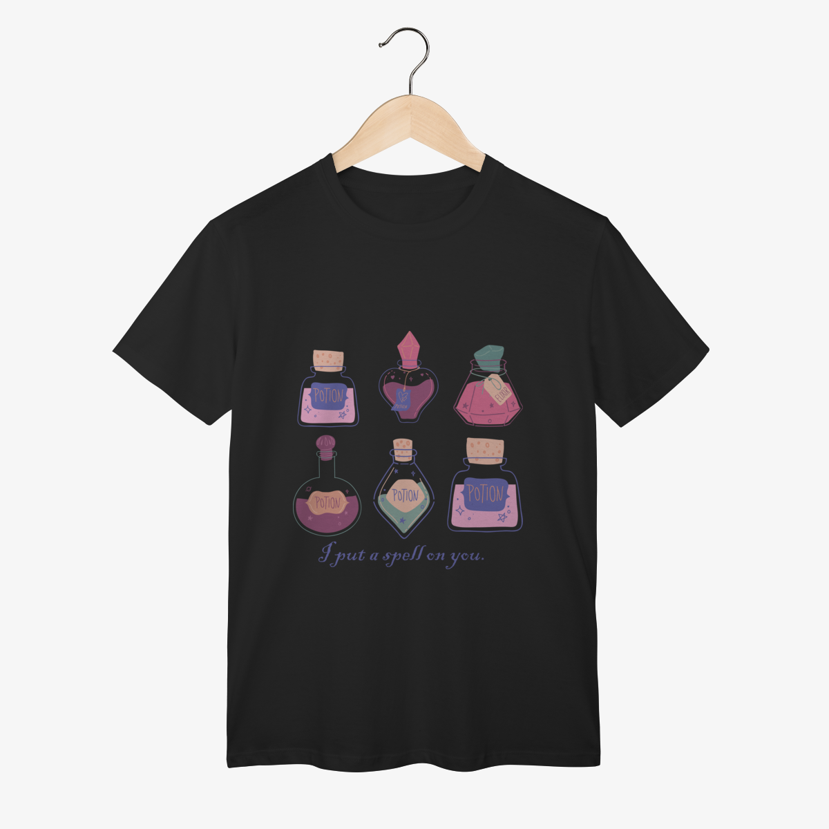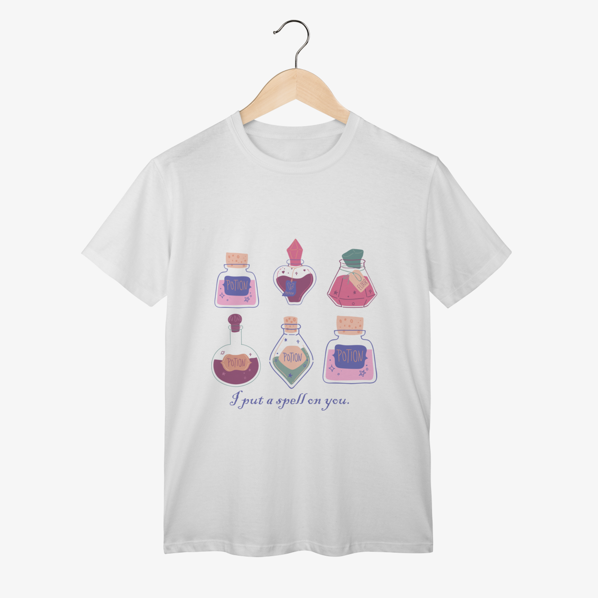 "I put a spell on you" (Eu lancei um feitiço em você) é a frase perfeita para quem acredita no poder da atração e no charme que vem de dentro. Nossa camiseta traz uma estampa lúdica e encantadora com diversas poções mágicas em tons pastéis, cada uma prometendo um toque de mistério e fascínio.