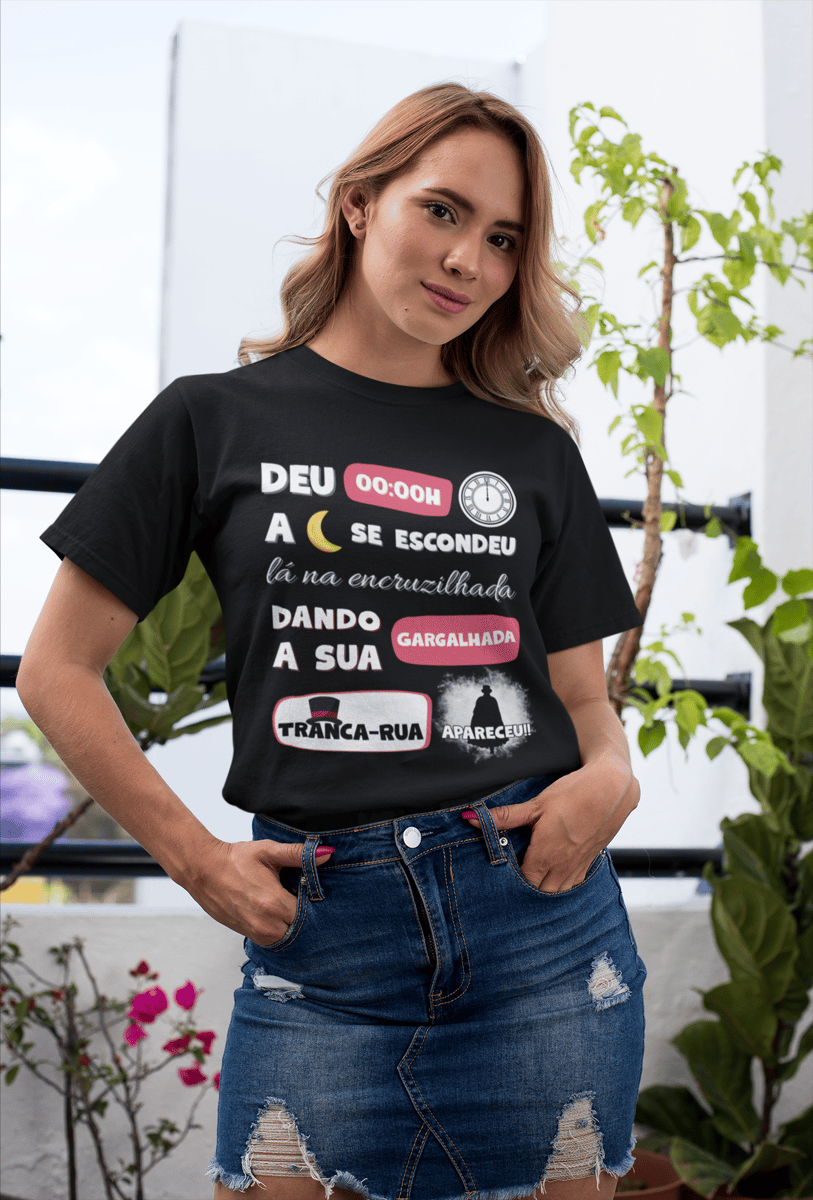 Camiseta Preta Tranca Rua Apareceu - O guardião da encruzilhada chega sem pedir licença. Onde há dúvida, ele é caminho. Onde há medo, ele governa. Quem tem fé em Tranca Rua não anda sozinho!!! Salve Seu Tranca Ruas, Laroyê!!!