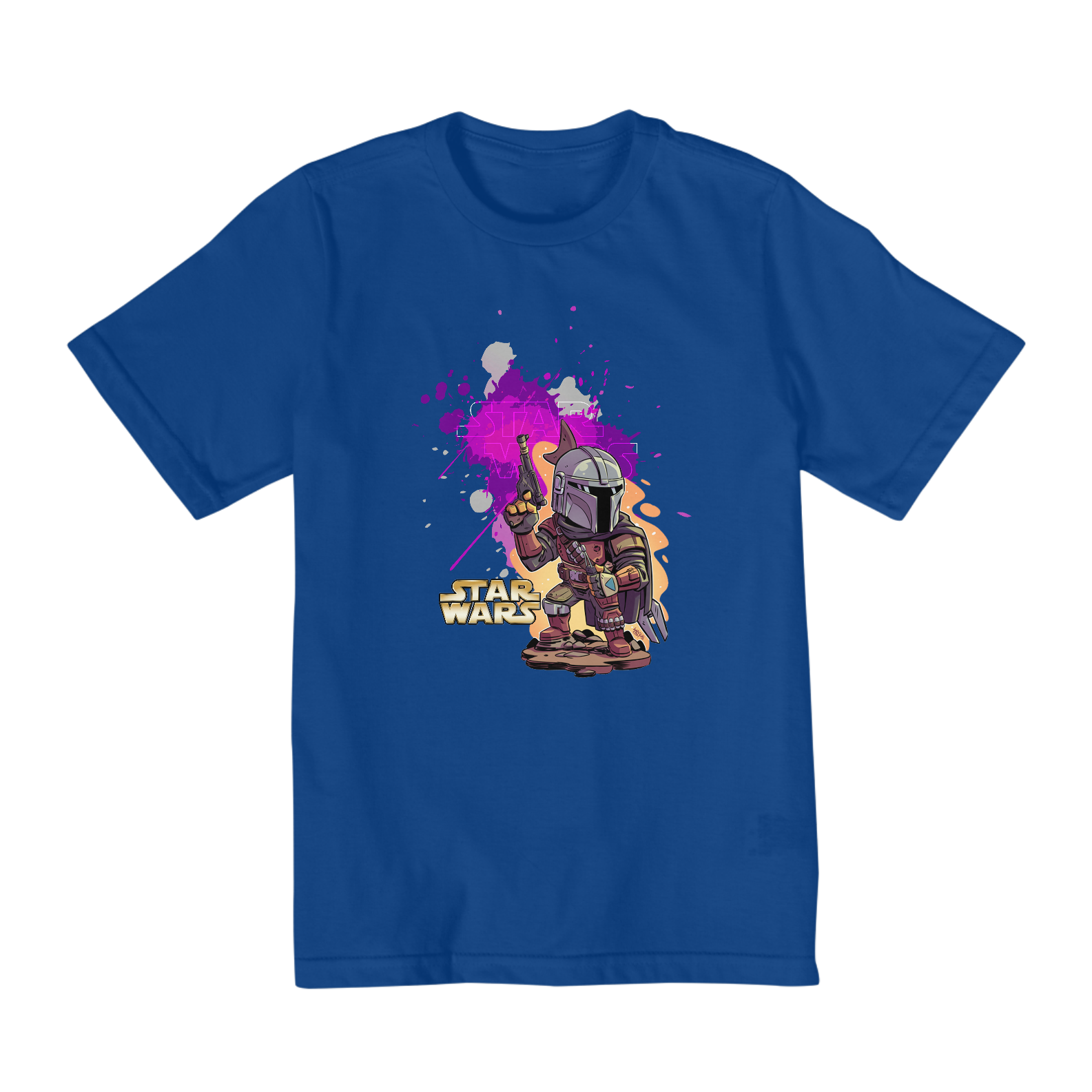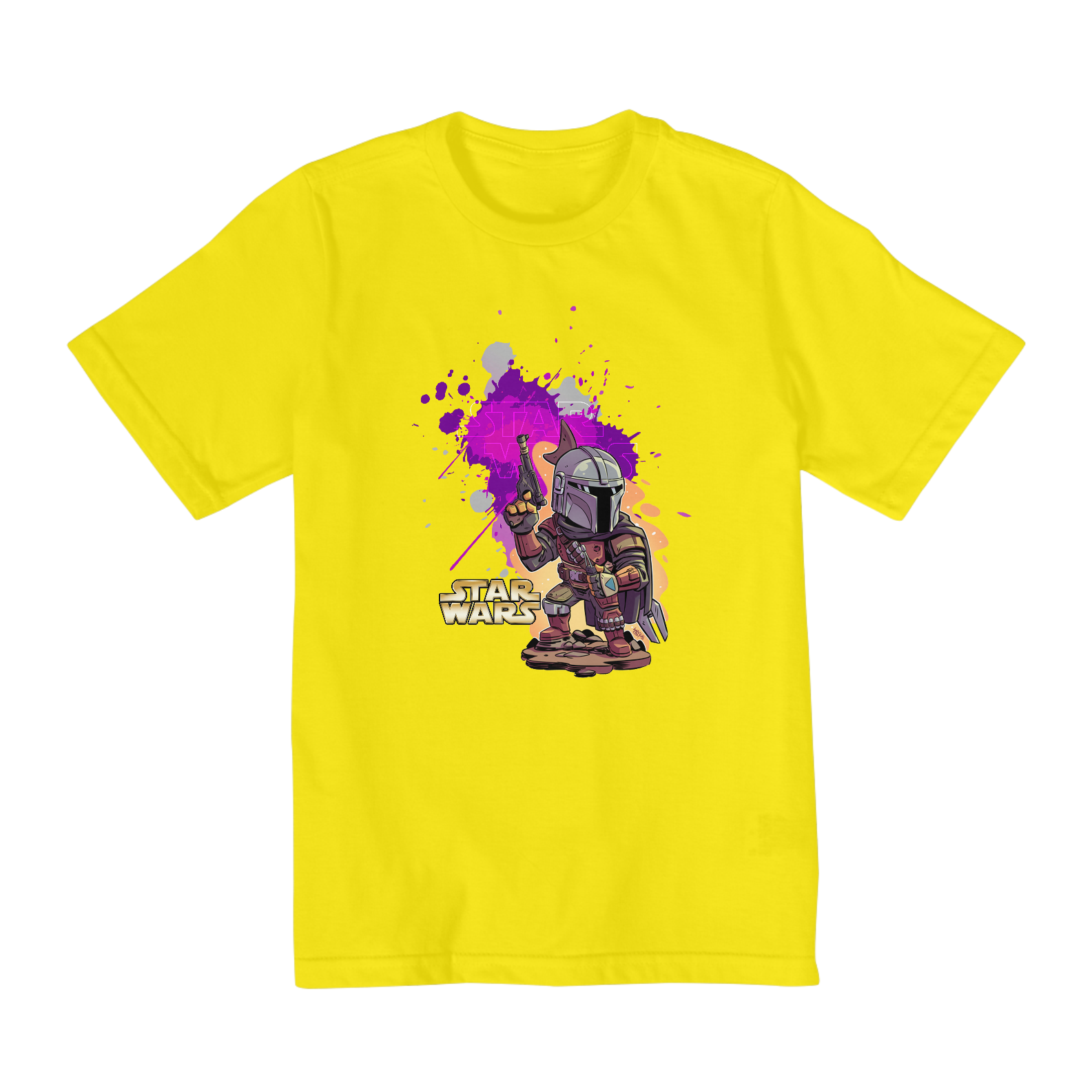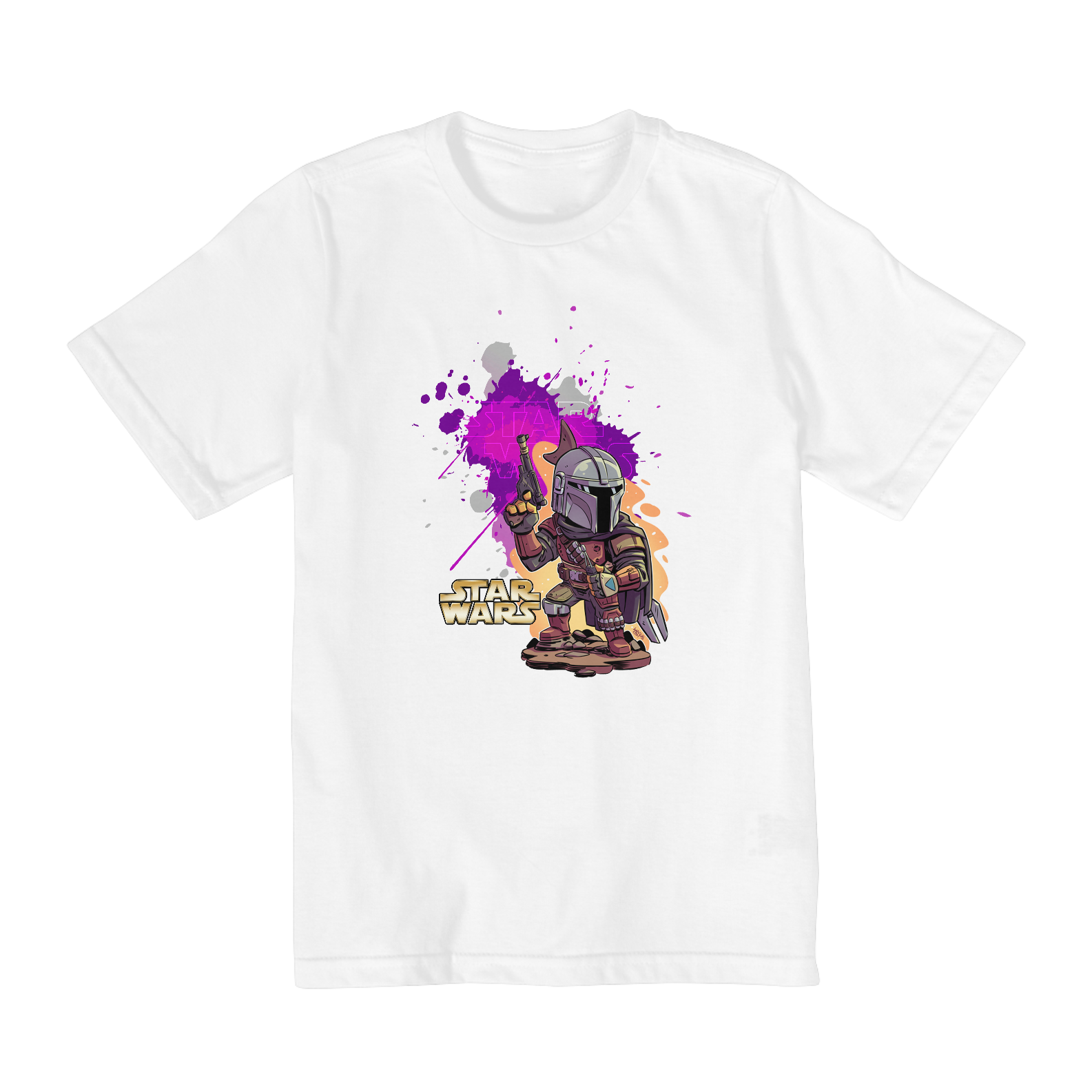 Estampa Galáctica: O Mandaloriano e seu fiel companheiro Grogu (Baby Yoda) estampados em uma arte vibrante, perfeita para os pequenos exploradores da galáxia.
