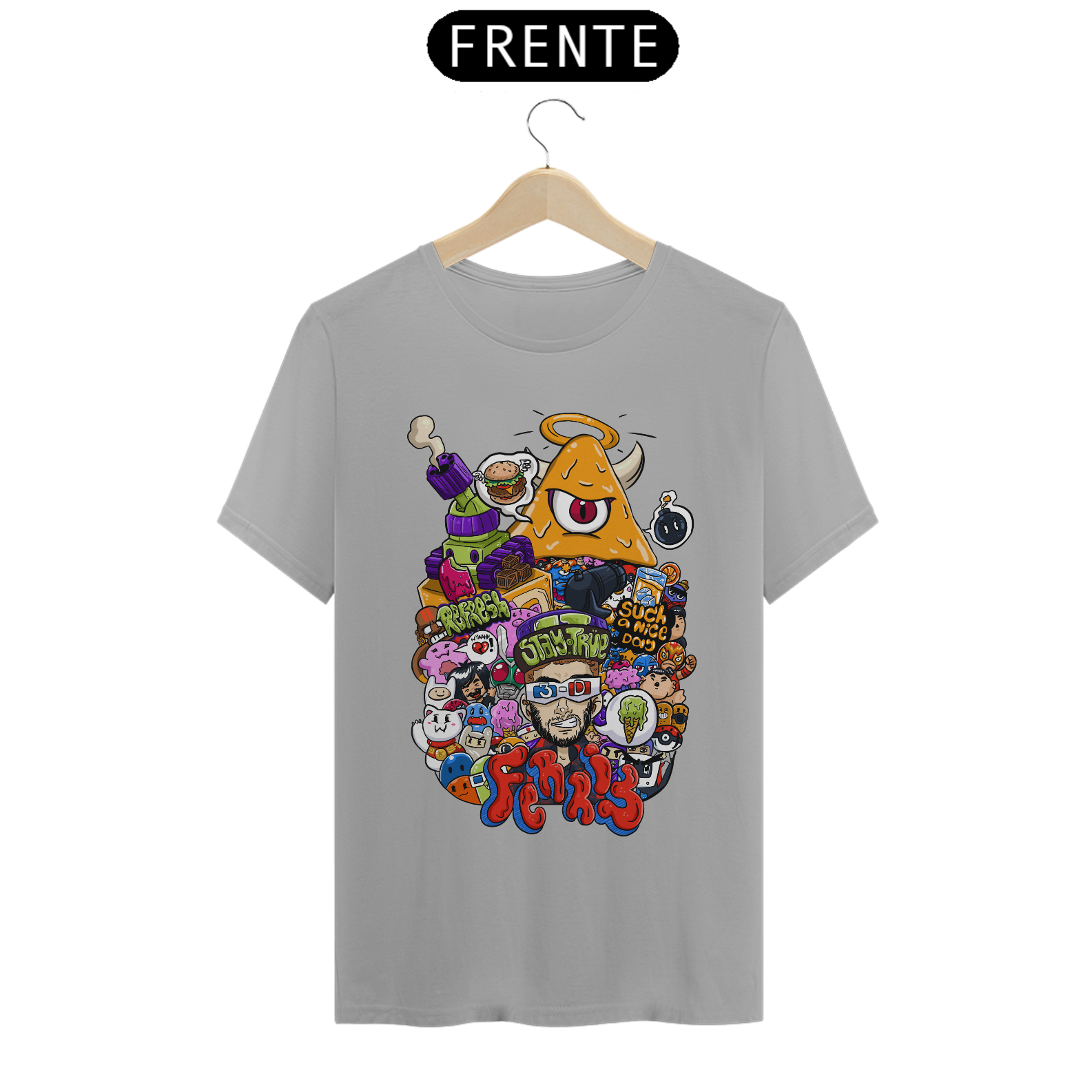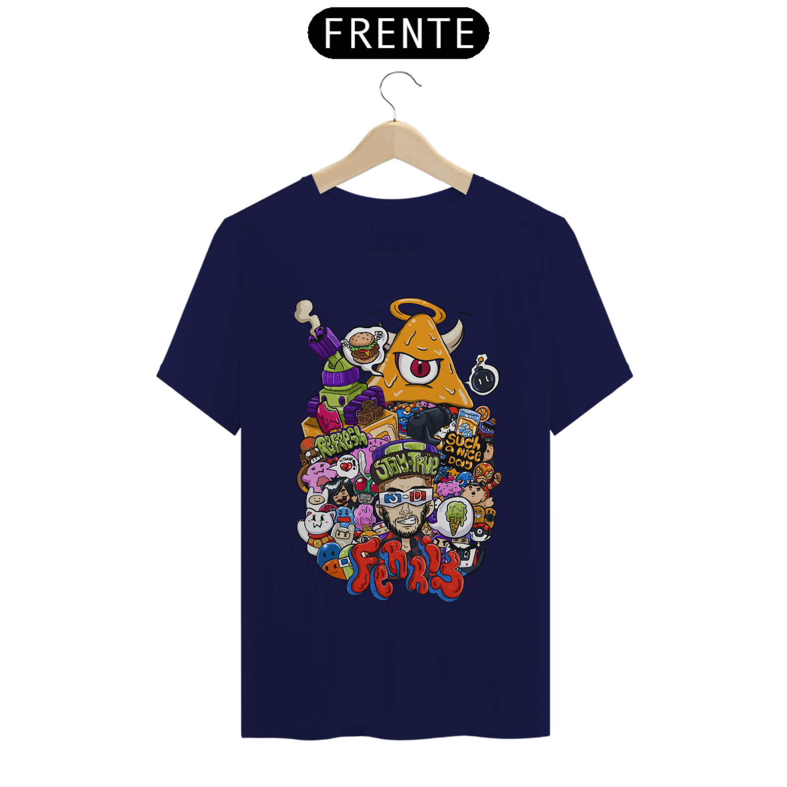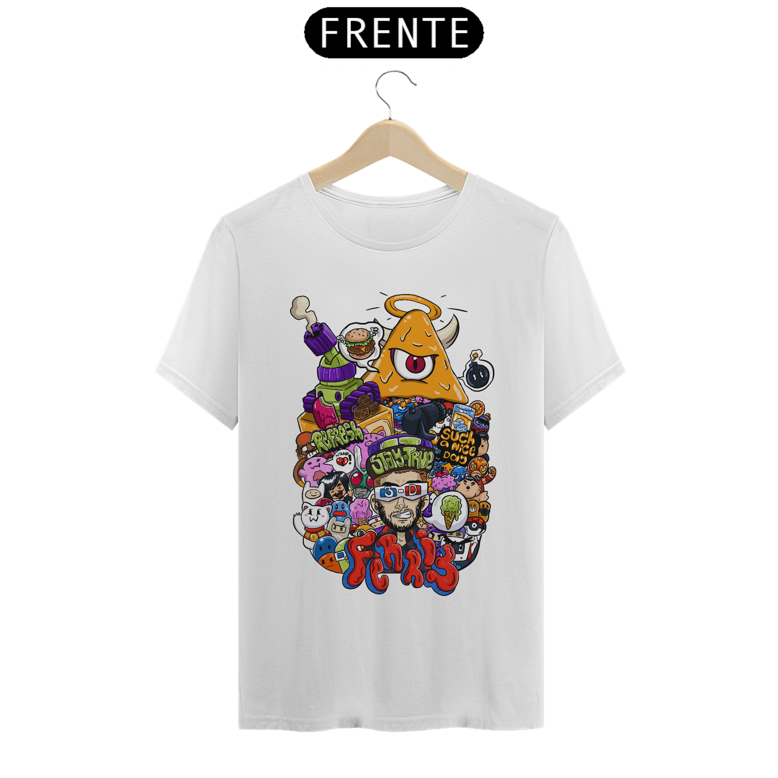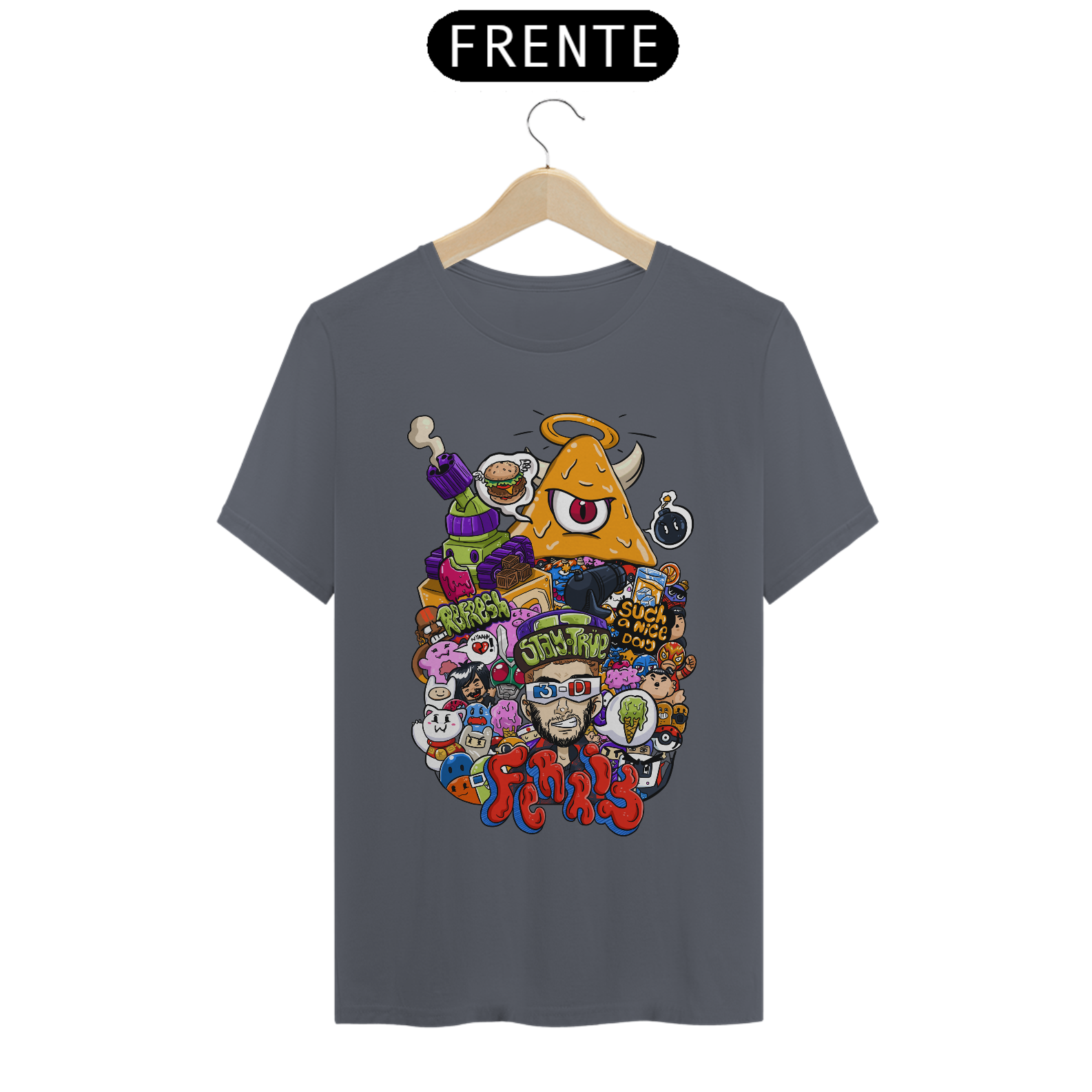 O destaque fica por conta do personagem central com óculos 3D, cercado por um universo caótico e colorido que mistura humor, estilo e originalidade. Cada detalhe da arte foi pensado para chamar atenção e transformar a peça em um verdadeiro ponto de destaque no look.