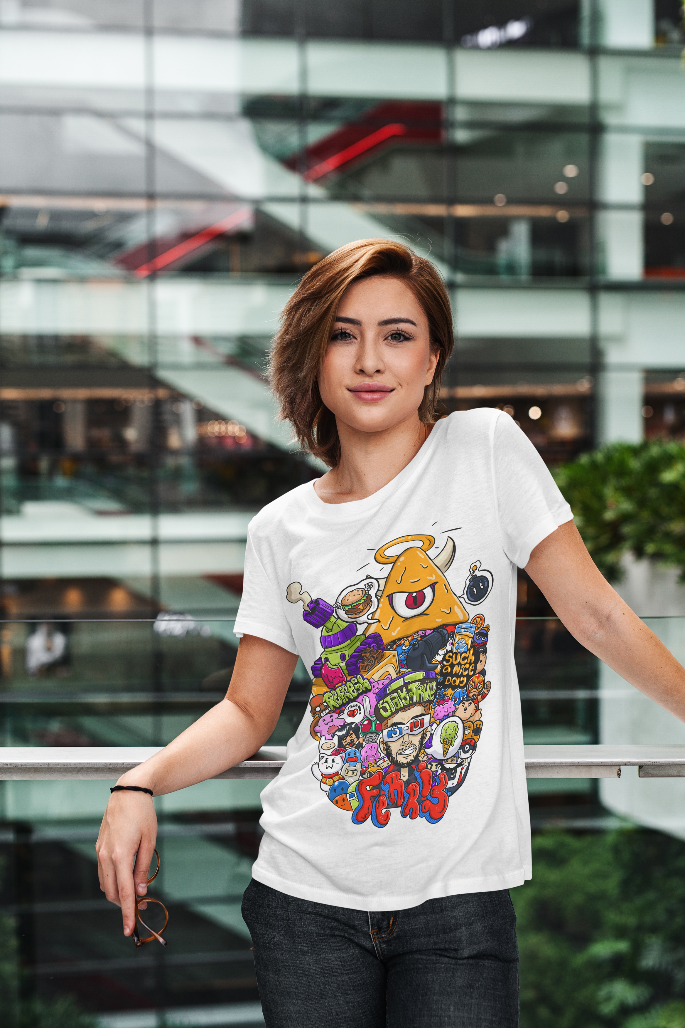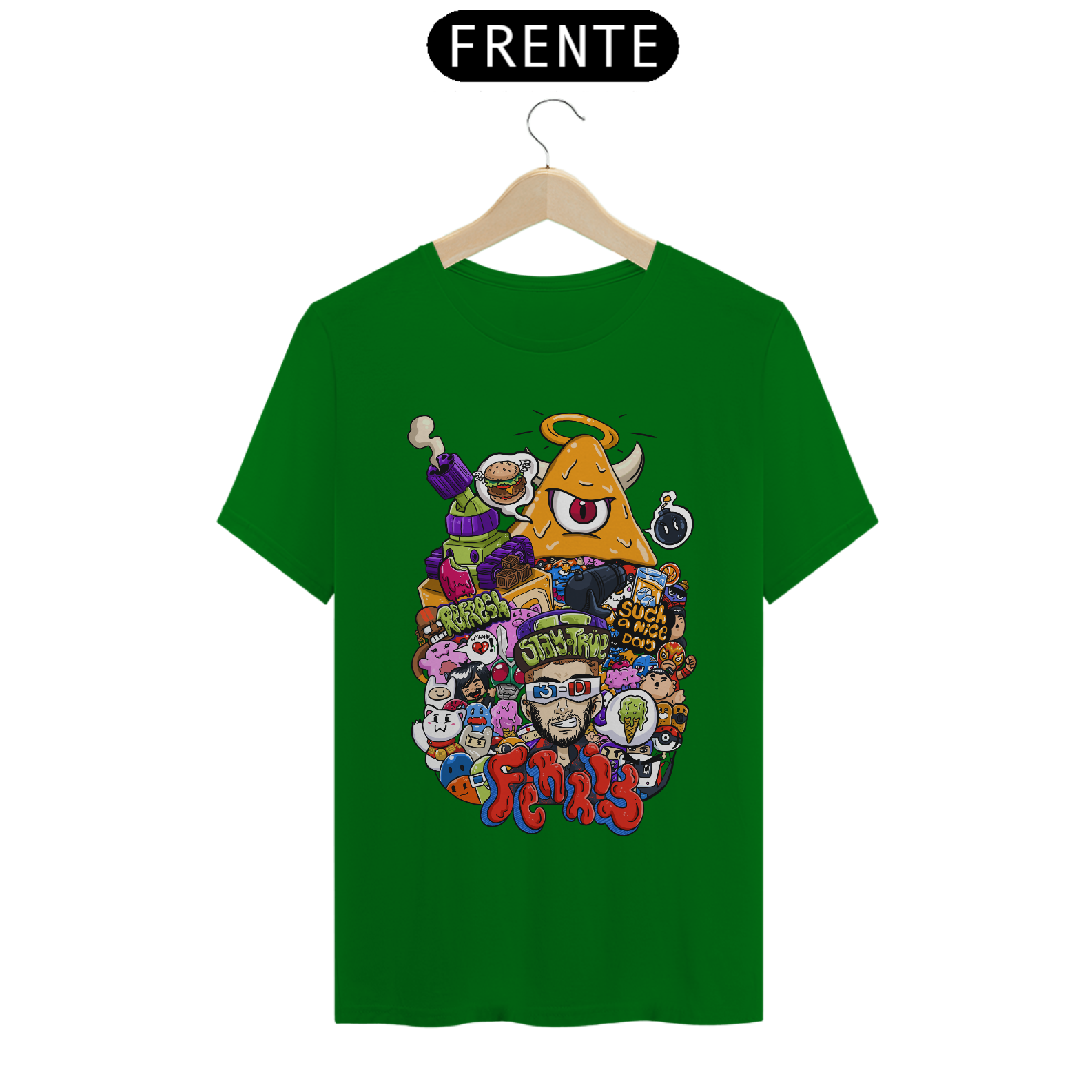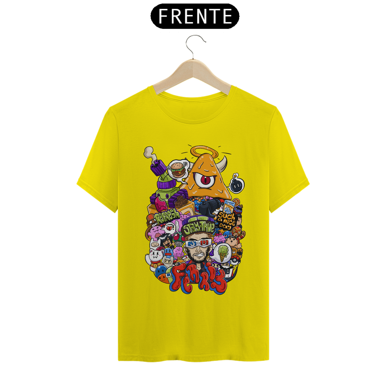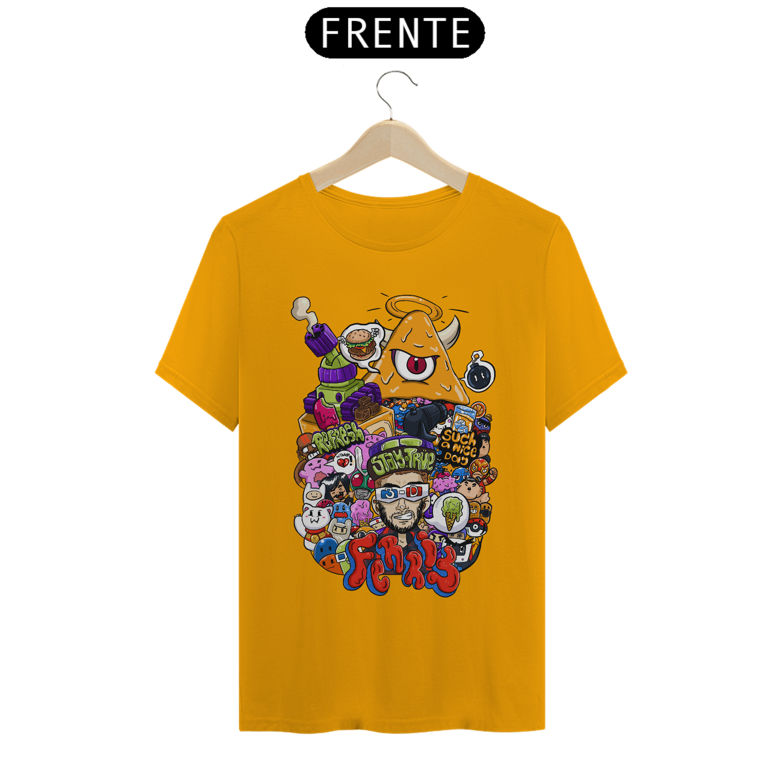 O destaque fica por conta do personagem central com óculos 3D, cercado por um universo caótico e colorido que mistura humor, estilo e originalidade. Cada detalhe da arte foi pensado para chamar atenção e transformar a peça em um verdadeiro ponto de destaque no look.