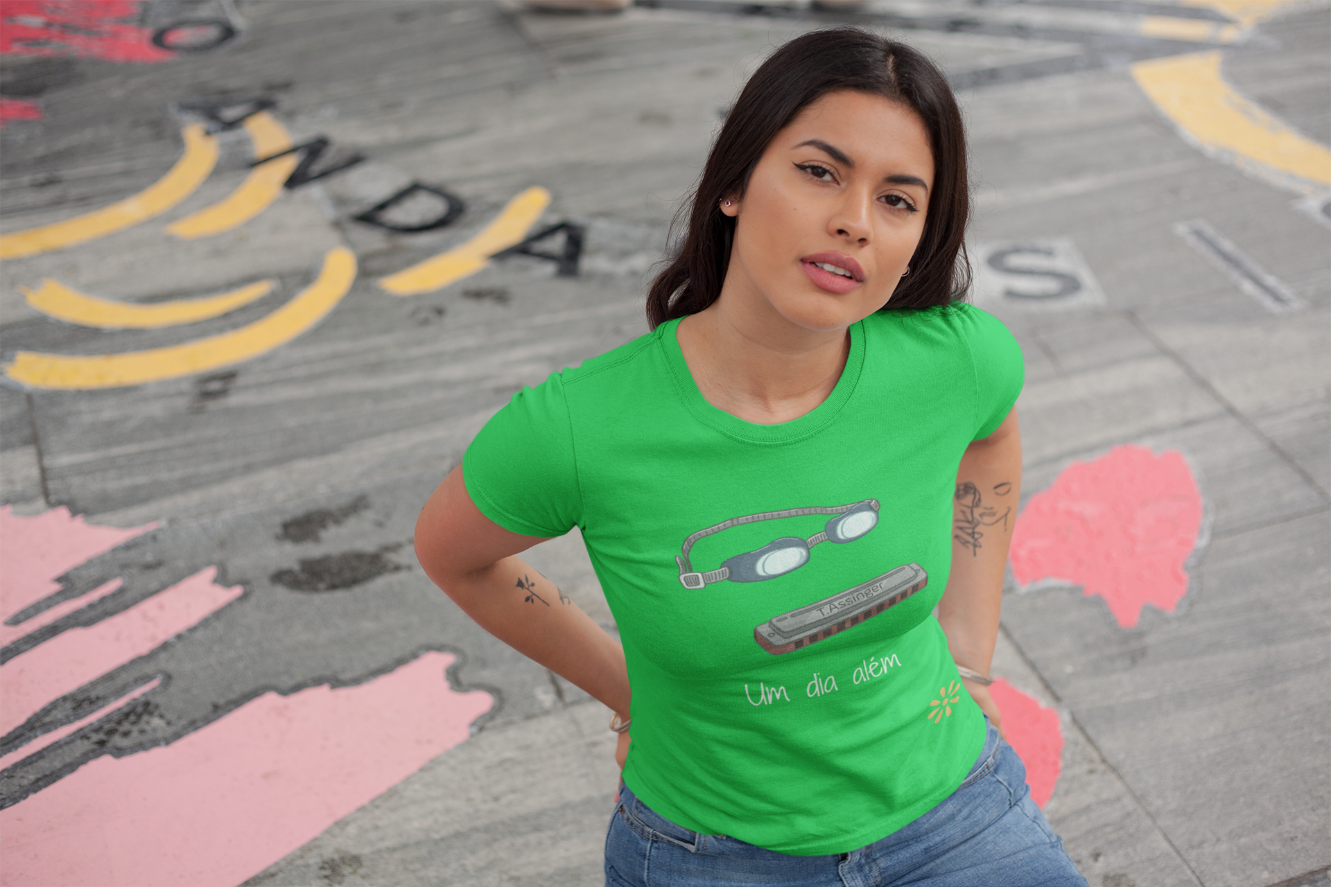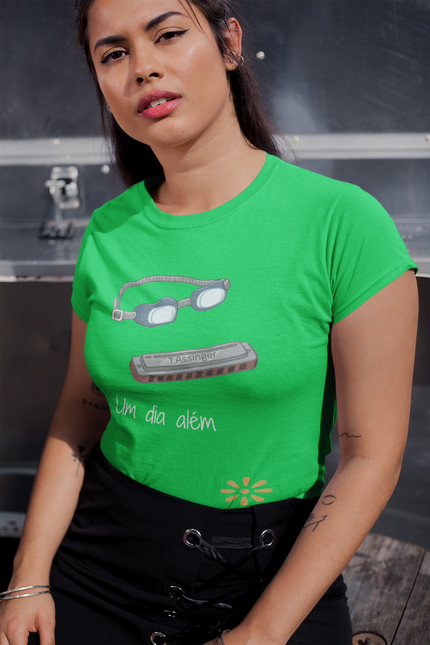 A coleção "Um dia além" traz a camiseta "gaita e óculos" com a mensagem de alinhamento de esforço pessoal, música e humildade na construção da vida pessoal. Uma inspiração para olharmos com nobreza a vida, vislumbrando sua beleza cotidiana.