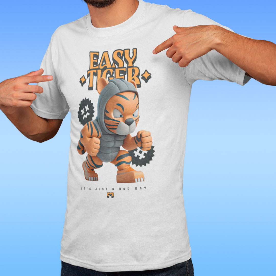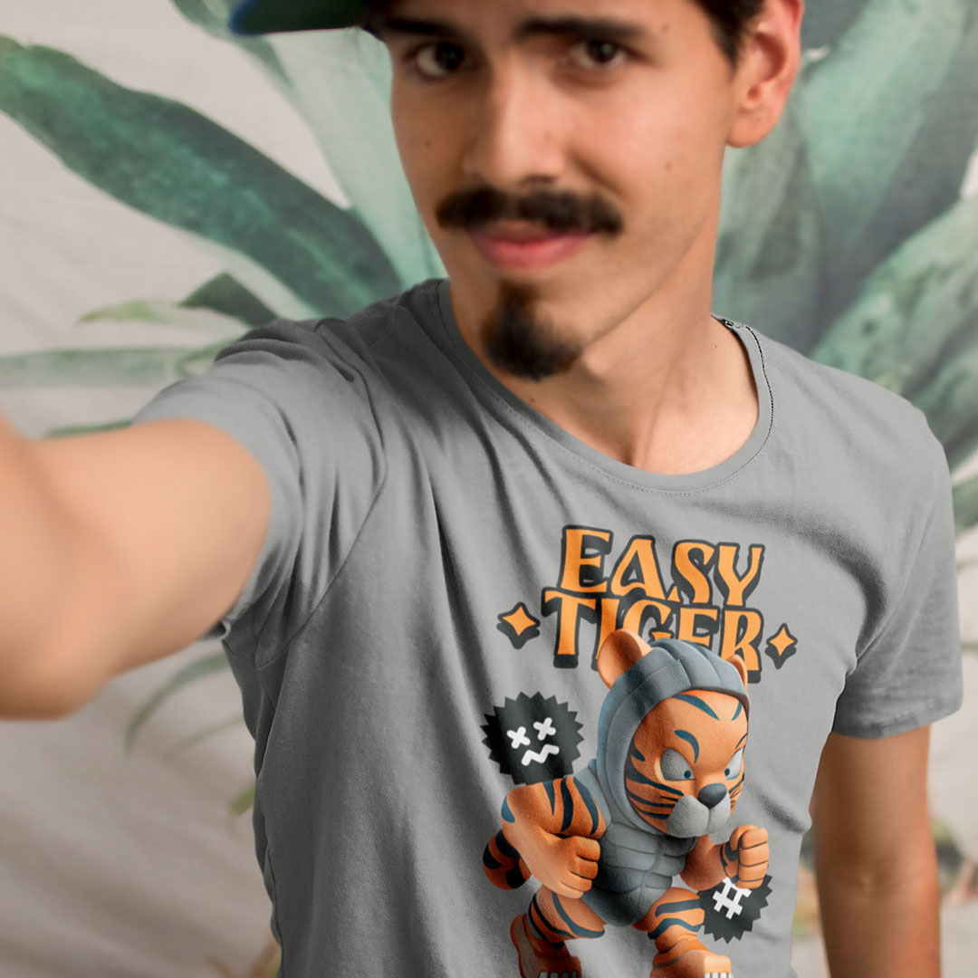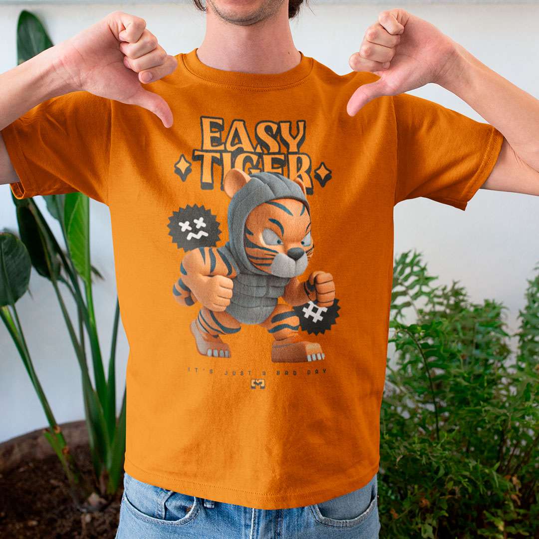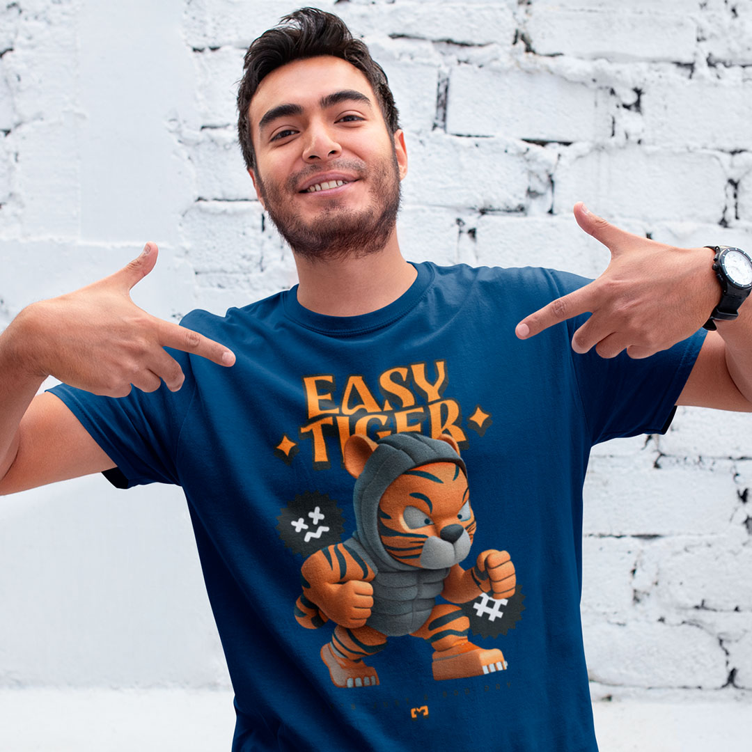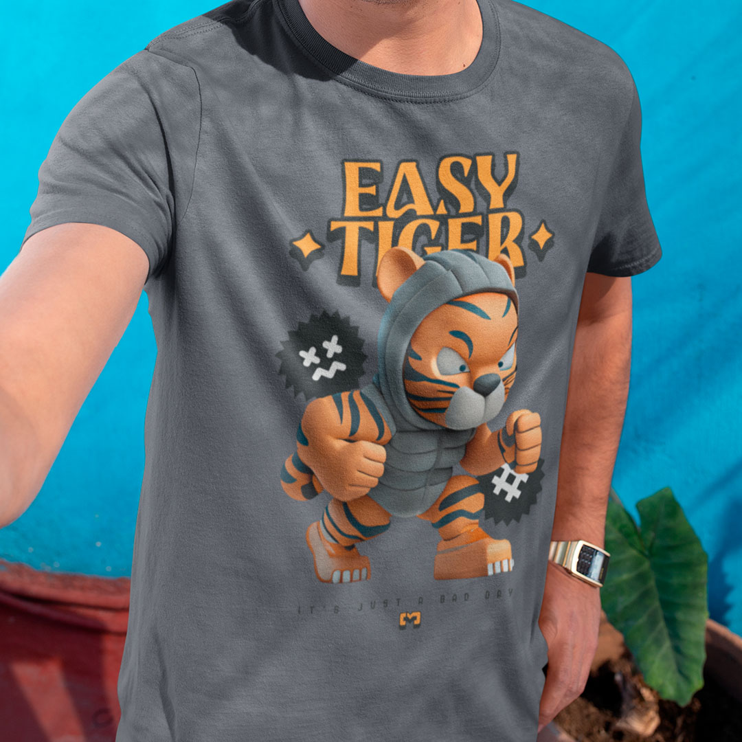 Camiseta 100% algodão com estampa "Easy Tiger" em letras ousadas e desenhos de tigre, perfeita para quem busca um visual moderno e descontraído.
