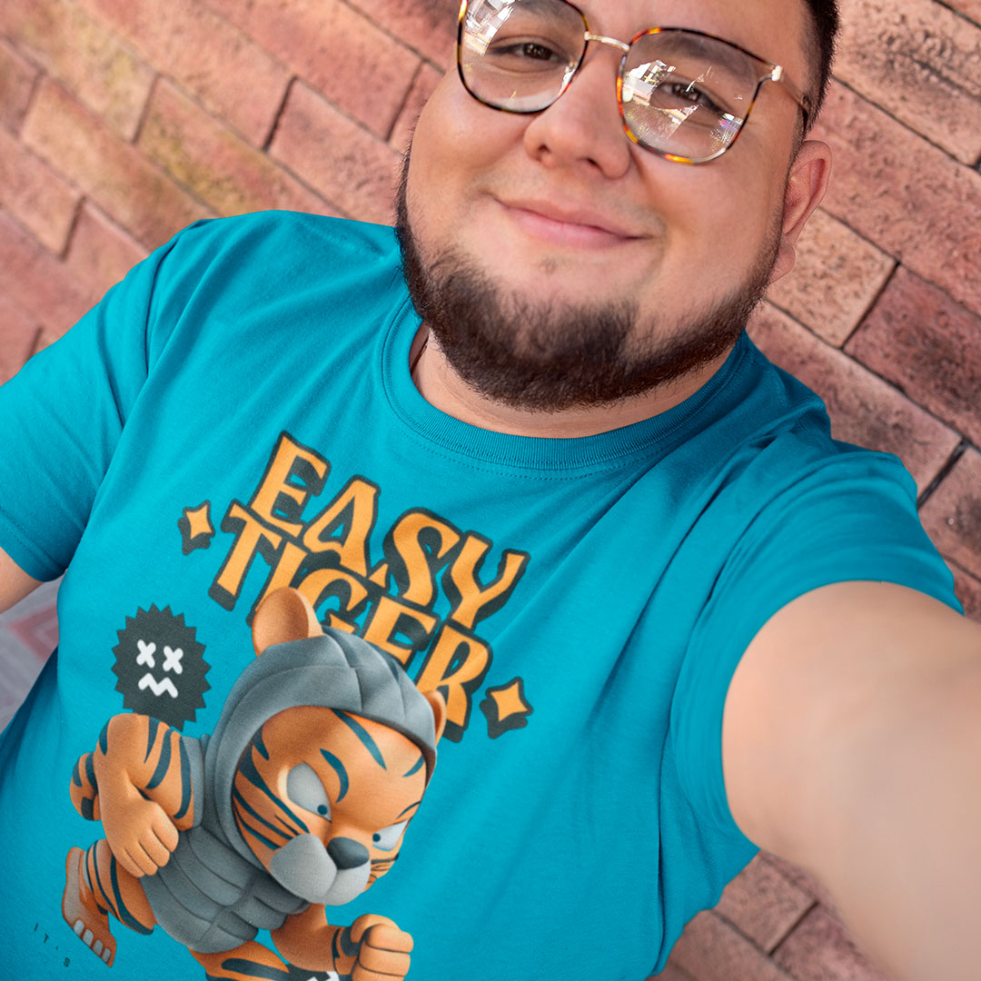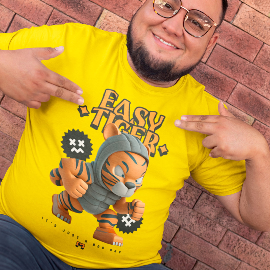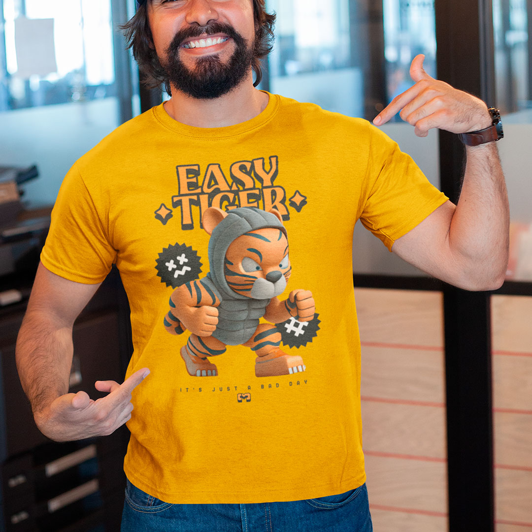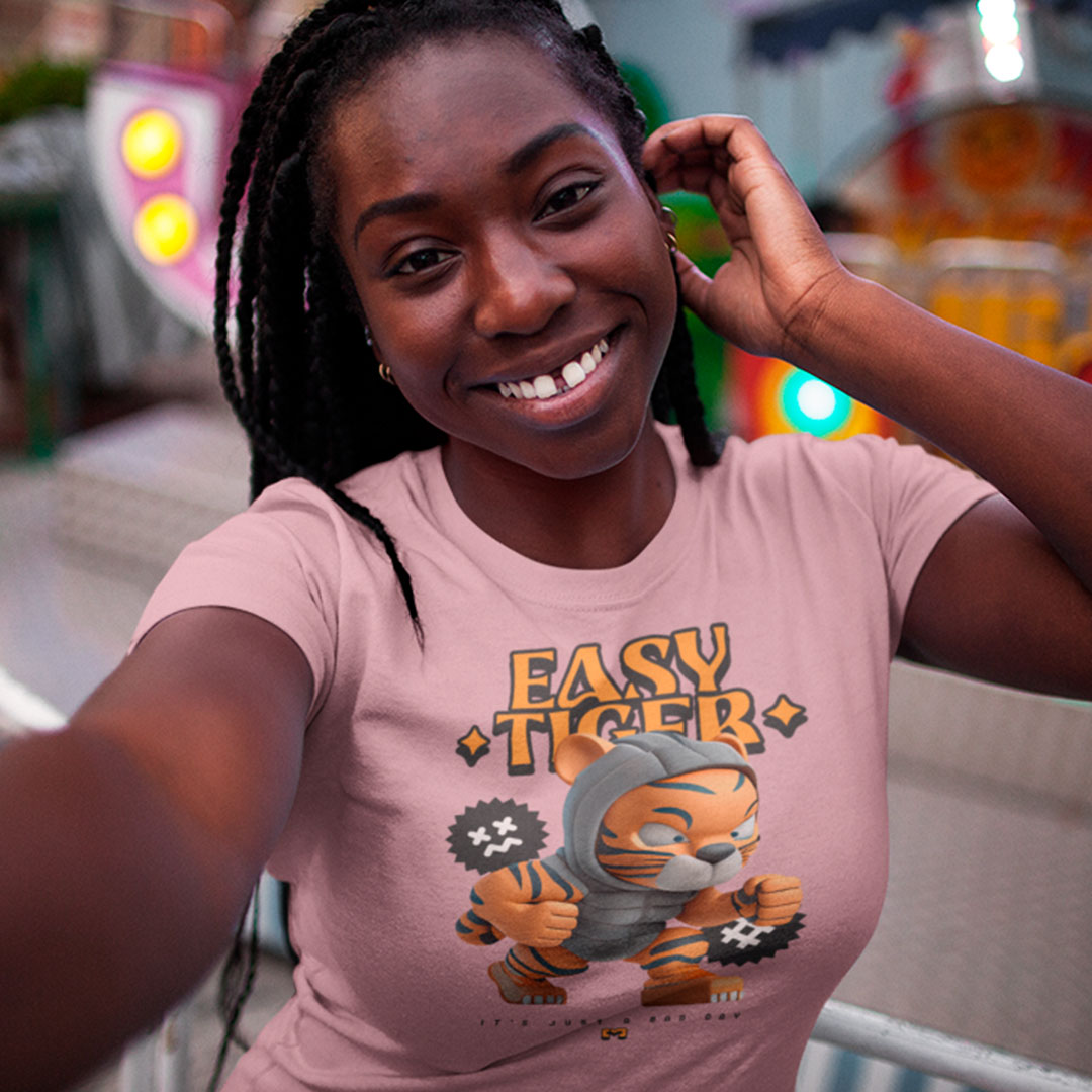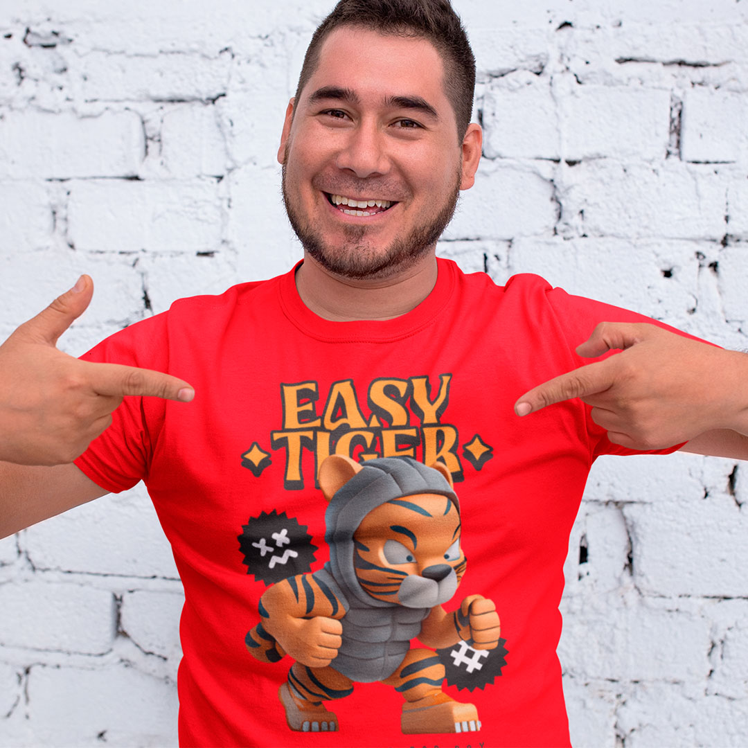 Camiseta 100% algodão com estampa "Easy Tiger" em letras ousadas e desenhos de tigre, perfeita para quem busca um visual moderno e descontraído.