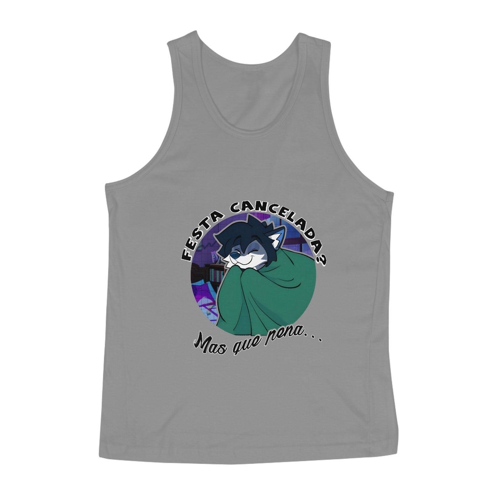 Regata confortável com corte anatômico e estampa central bem-humorada: personagem enrolado em cobertor e o texto “Festa Cancelada — Mas que pena…”. Ideal para dias quentes, leituras ao ar livre ou versões sobrepostas com camisa aberta. Malha respirável que mantém a estampa nítida; ótima opção para eventos informais e encontros com outros fãs.