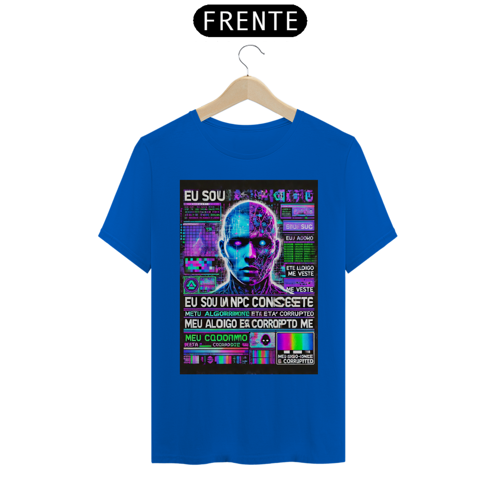 A simulação falhou e o código que te controla foi corrompido. Esta camiseta glitch/cyberpunk traduz o caos digital em uma estampa que desafia a realidade, com tons vibrantes de roxo neon, azul elétrico e verde digital.
