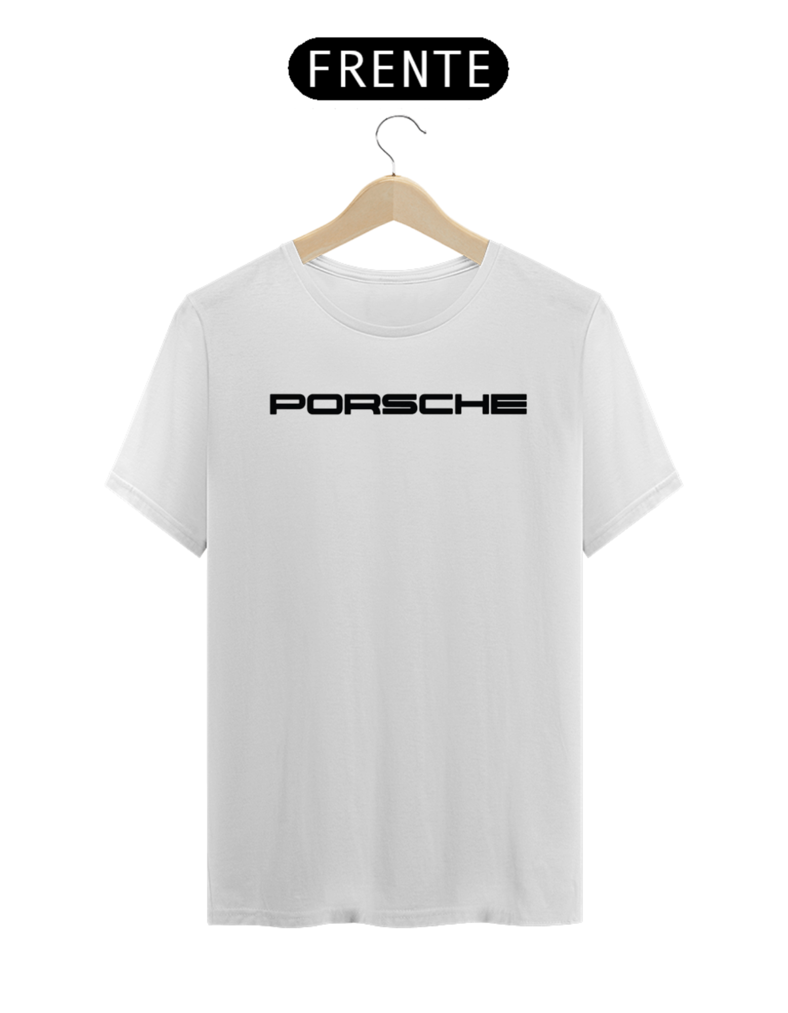 Na frente, a camiseta apresenta um design simples e elegante, com um logotipo "PORSCHE" discreto no peito, mas o destaque está na estampa traseira.
