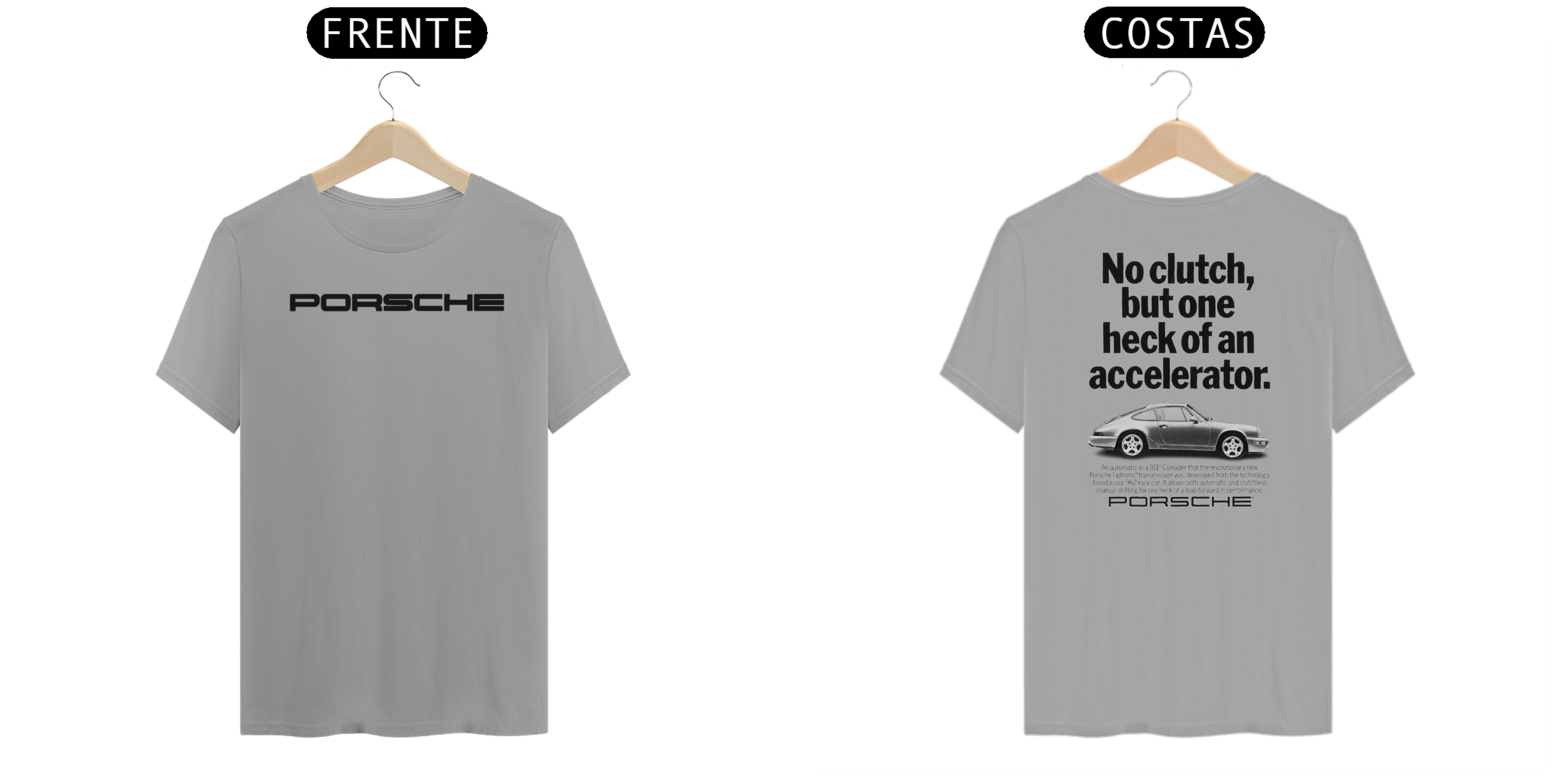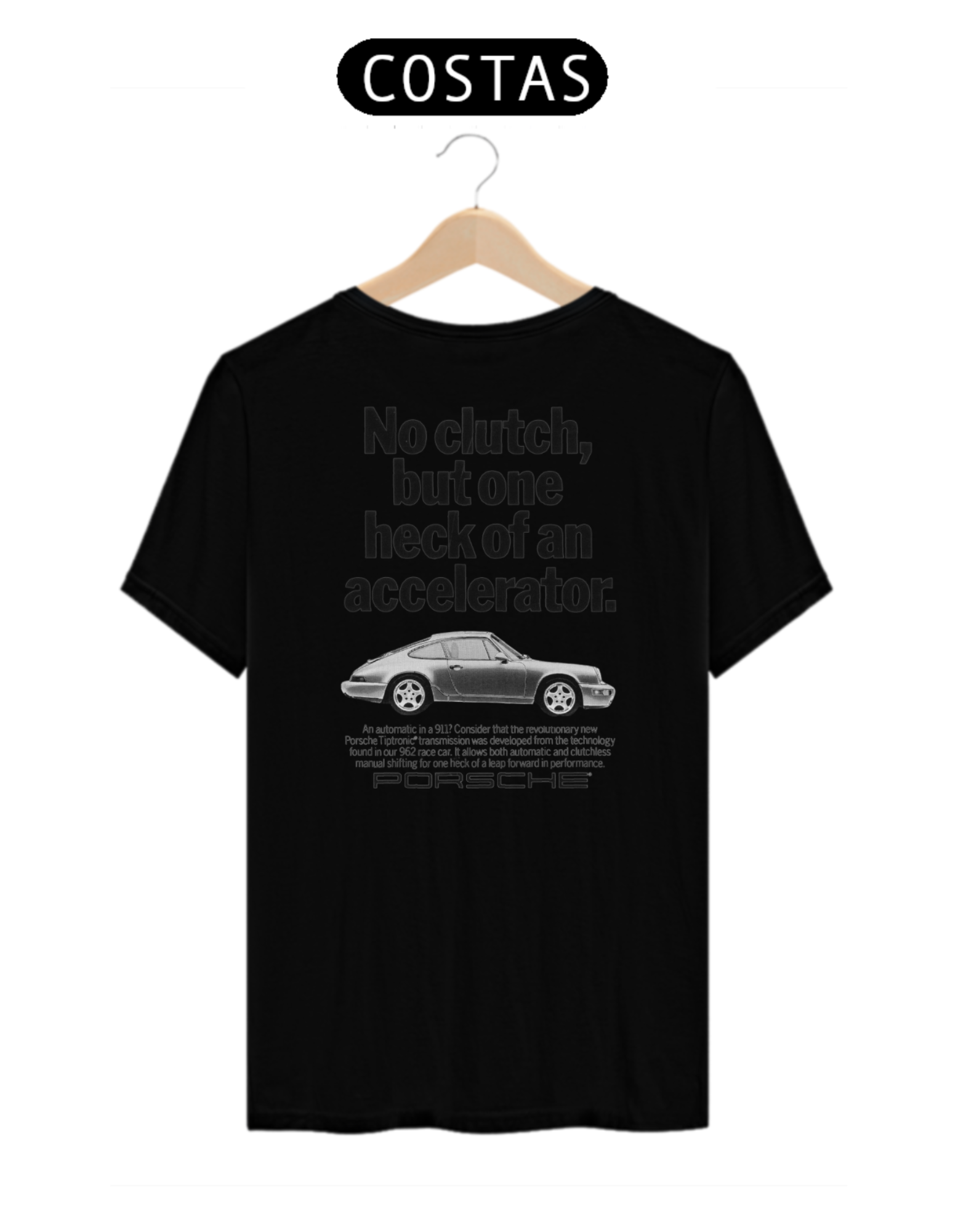 Na parte traseira, a estampa principal chama atenção: "No clutch, but one heck of an accelerator" está escrita em uma tipografia moderna e dinâmica, capturando o espírito inovador da Porsche. Abaixo da frase, uma ilustração estilizada do Porsche 911 com o câmbio Tiptronic, que foi derivado da tecnologia do carro de corrida Porsche 962, adiciona um toque visual impactante.