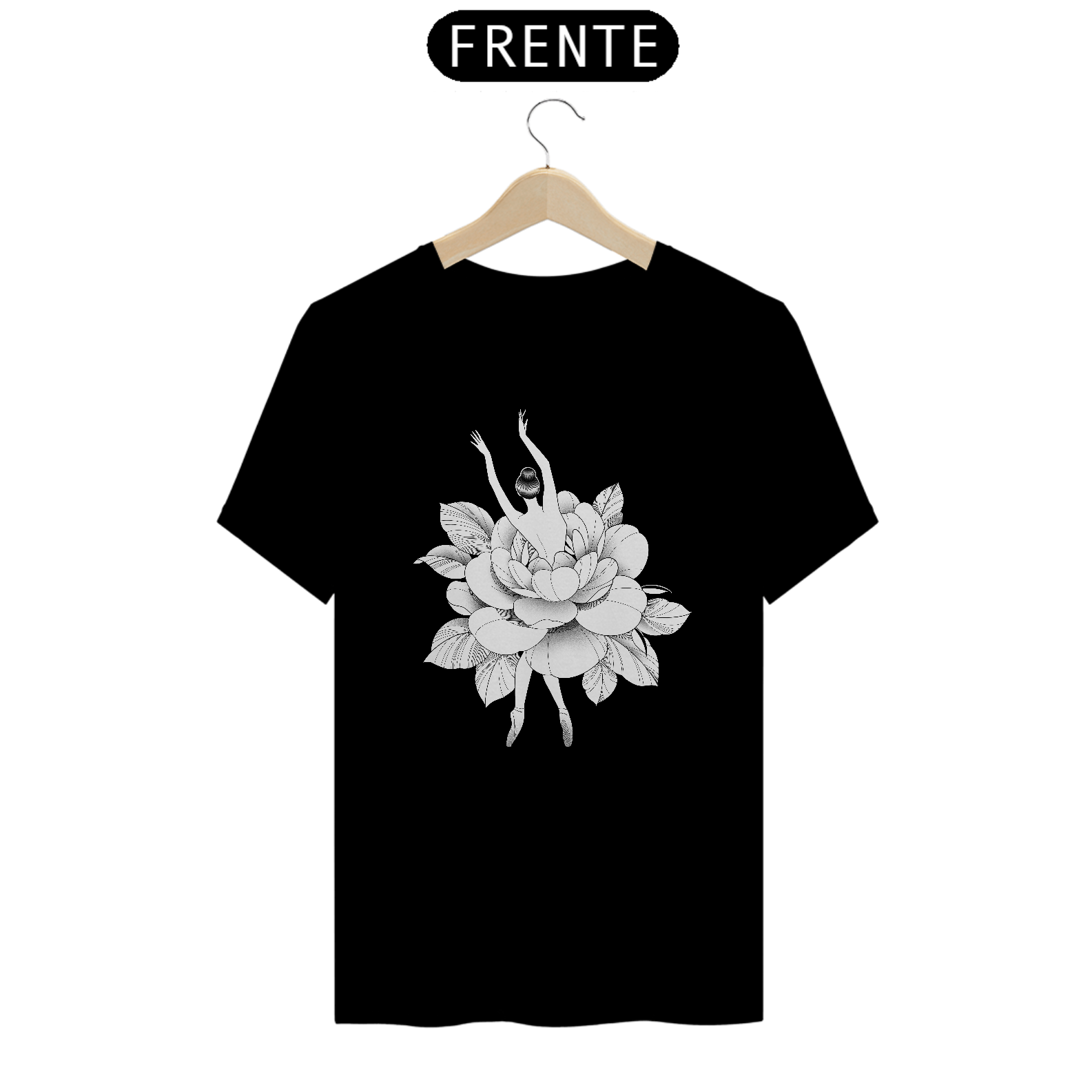 Uma delicada e sofisticada estampa em preto e branco que combina a leveza do balé com a beleza das flores. A figura de uma bailarina com vestido floral, desenhada com linhas elegantes e sombreamento artístico, transmite graciosidade, feminilidade e arte. Ideal para camisetas, moletons e produtos que celebram a dança, a natureza e a expressão artística.