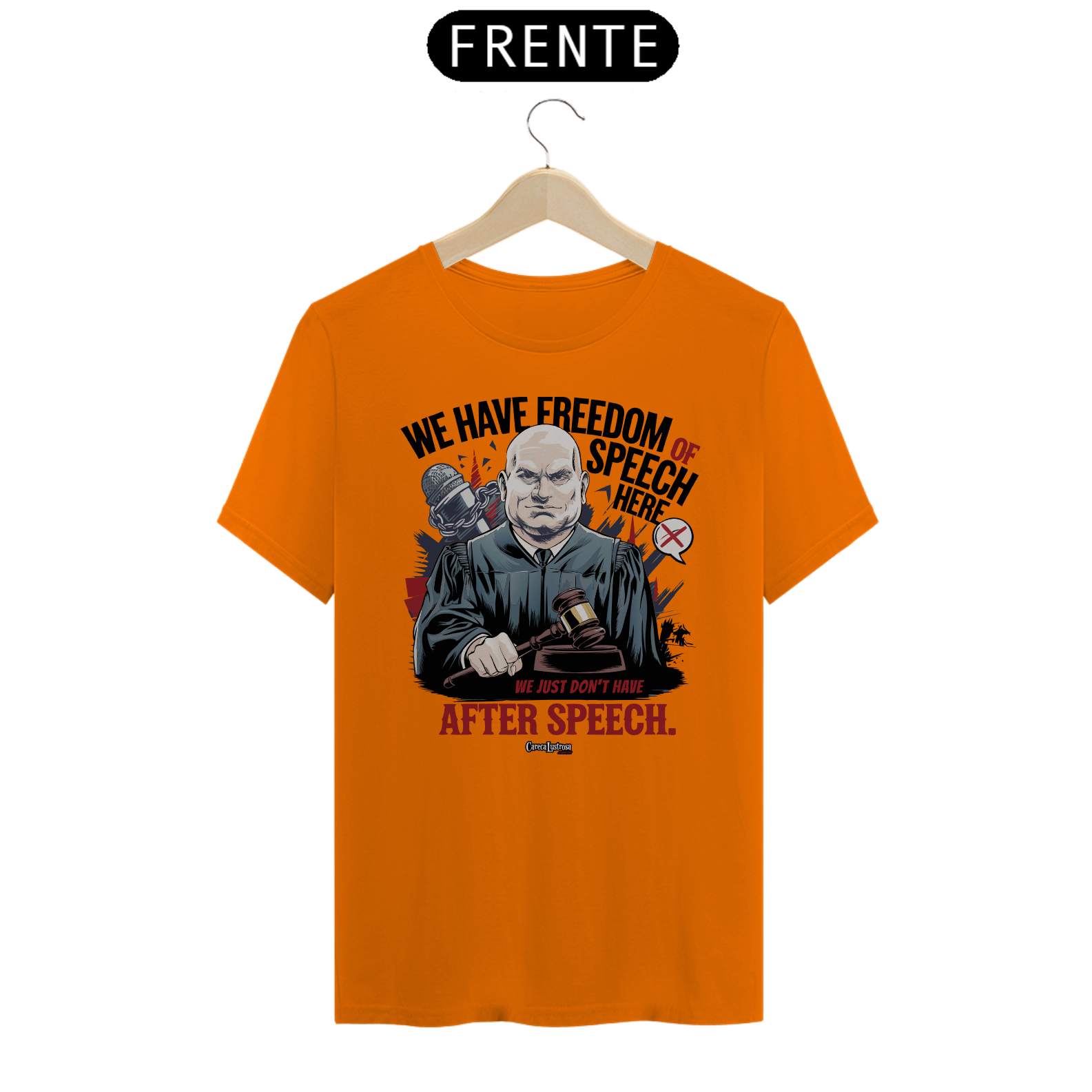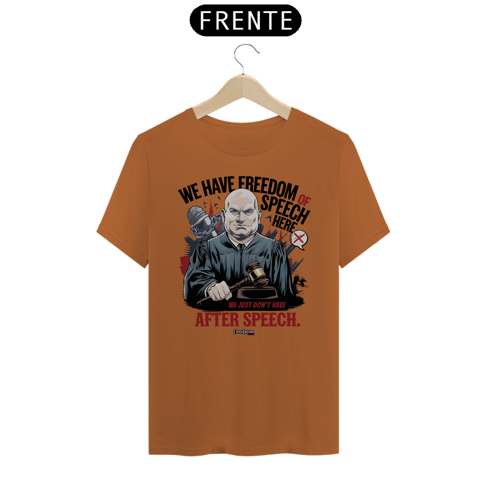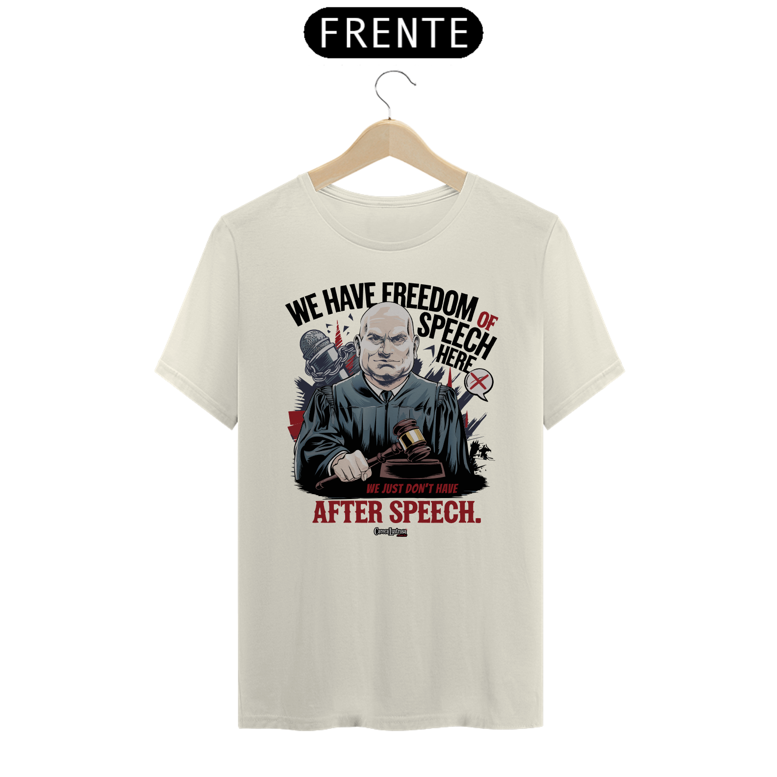 Esta camiseta traz uma crítica irônica e sagaz sobre a liberdade de expressão nos tempos atuais. Com a frase “We have freedom of speech here... we just don’t have after speech”, a estampa faz uma piada com a liberdade de falar o que quisermos, mas também ironiza a ideia de que, na prática, as consequências de expressar certas opiniões podem ser severas e imediatas.