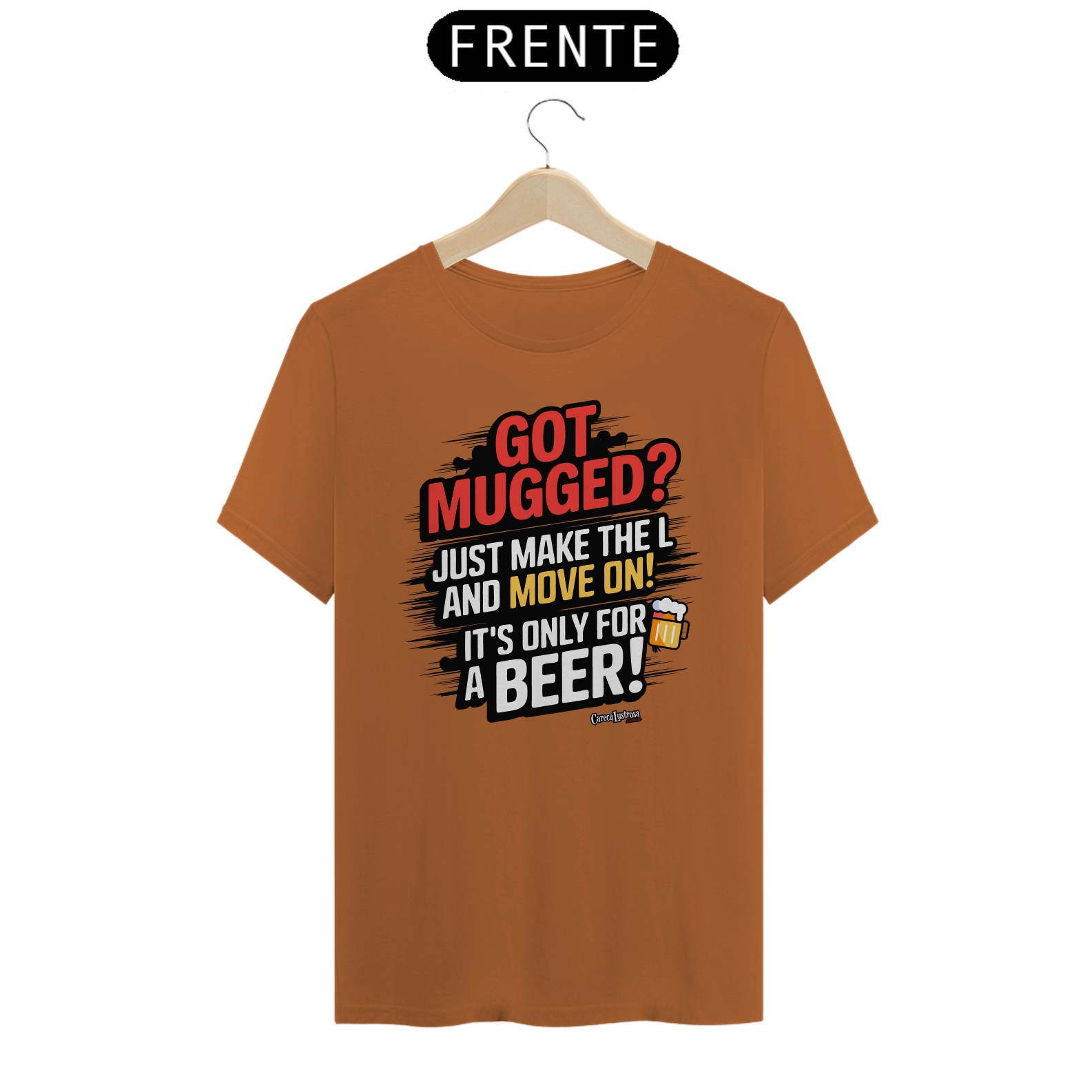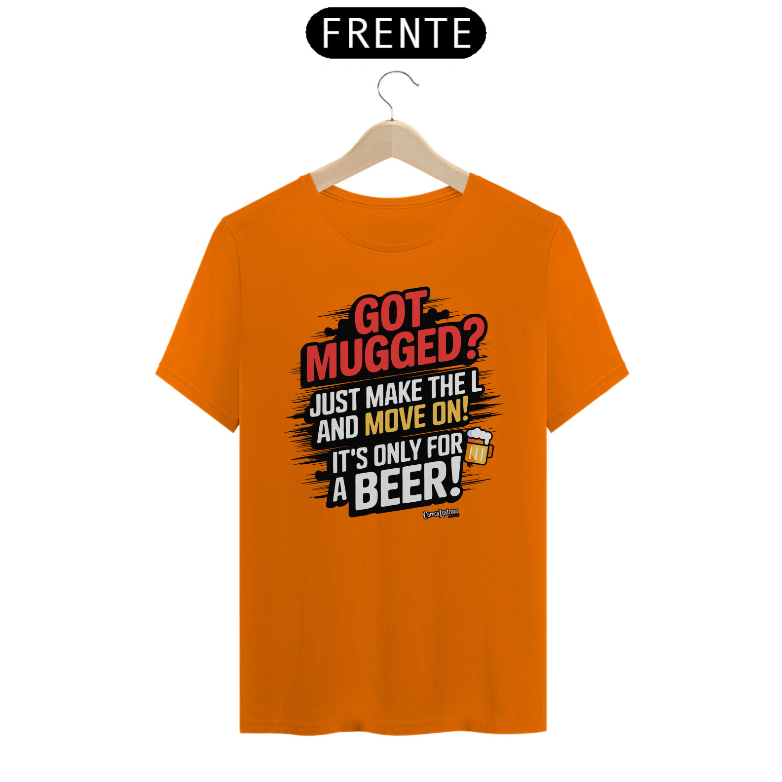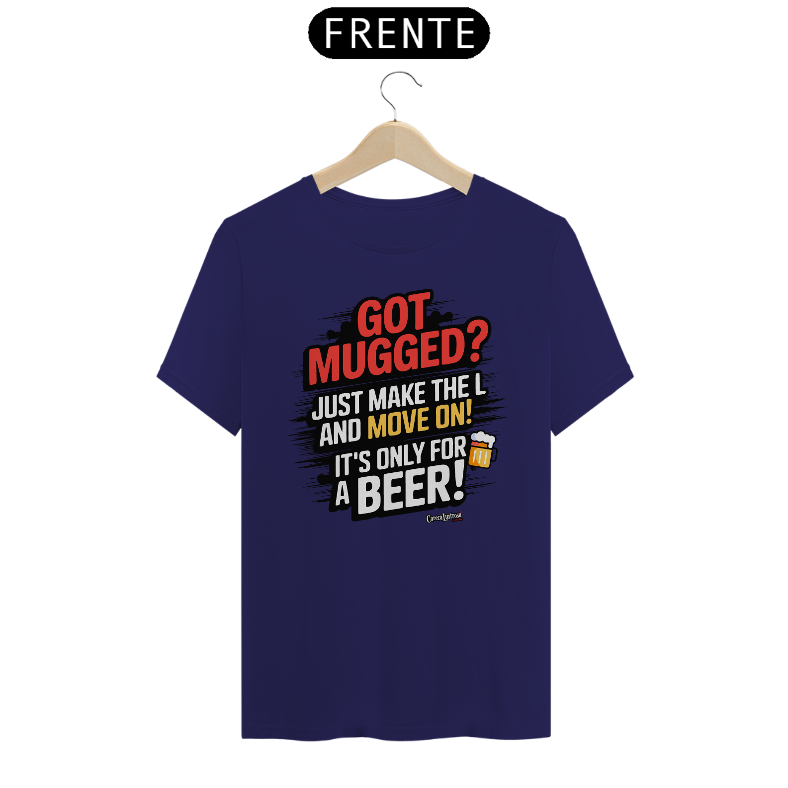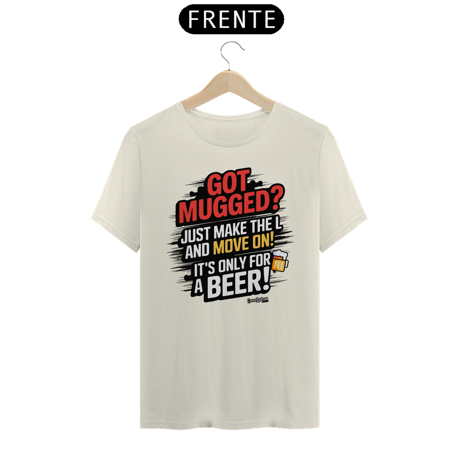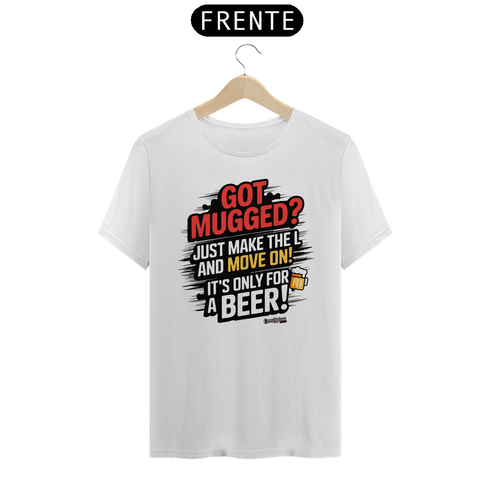 Esta camiseta traz uma crítica bem-humorada e uma sátira ao discurso político, misturando humor e reflexão. A frase estampada faz alusão à famosa declaração do presidente Lula, onde ele minimiza os efeitos do roubo dizendo que quem rouba é apenas para "tomar uma cervejinha". Aqui, a frase “Got Mugged? Just Make the L and move on, It's Only for a Beer!” se transforma em uma ironia, fazendo referência ao gesto do "L" usado pelos petistas em apoio ao nome de Lula.