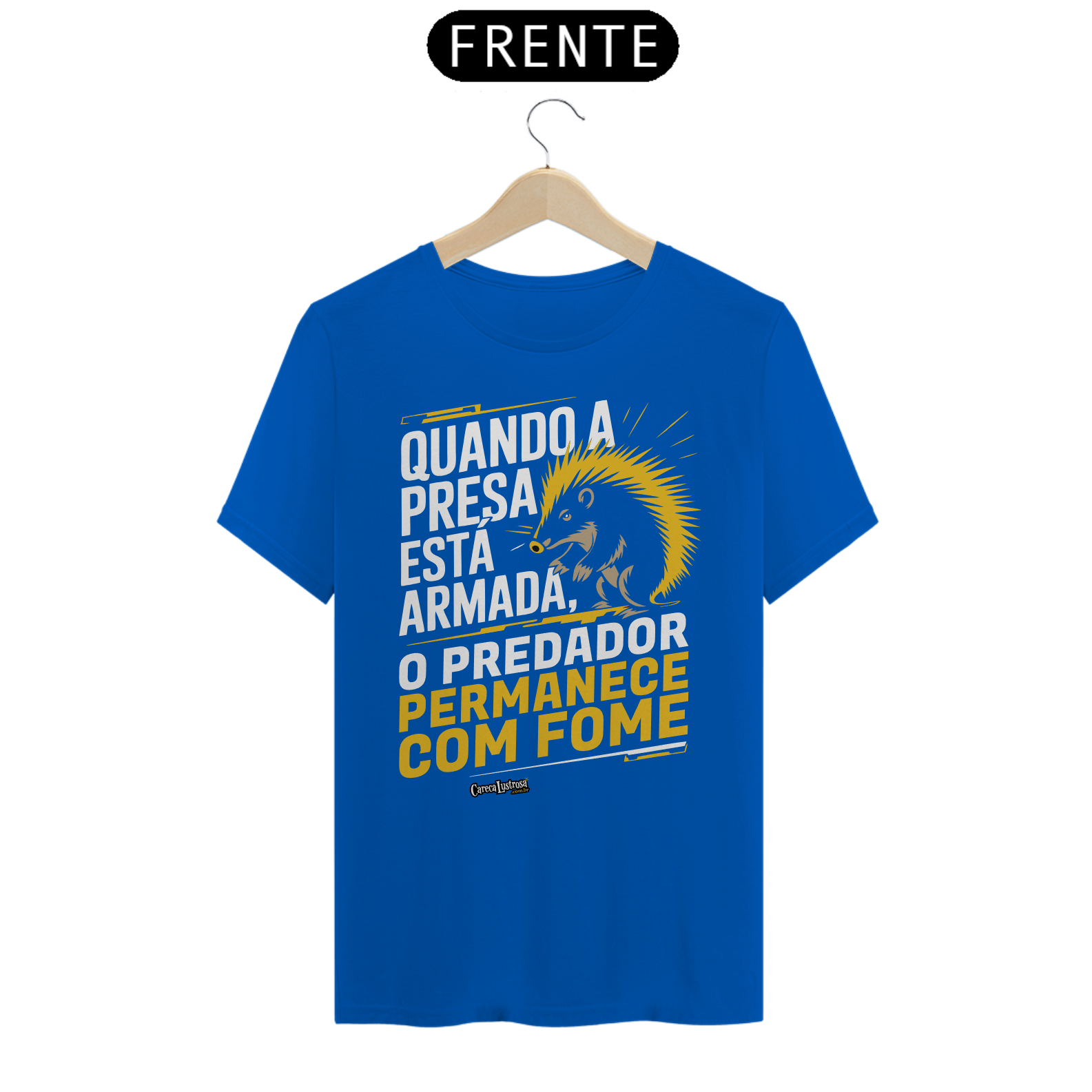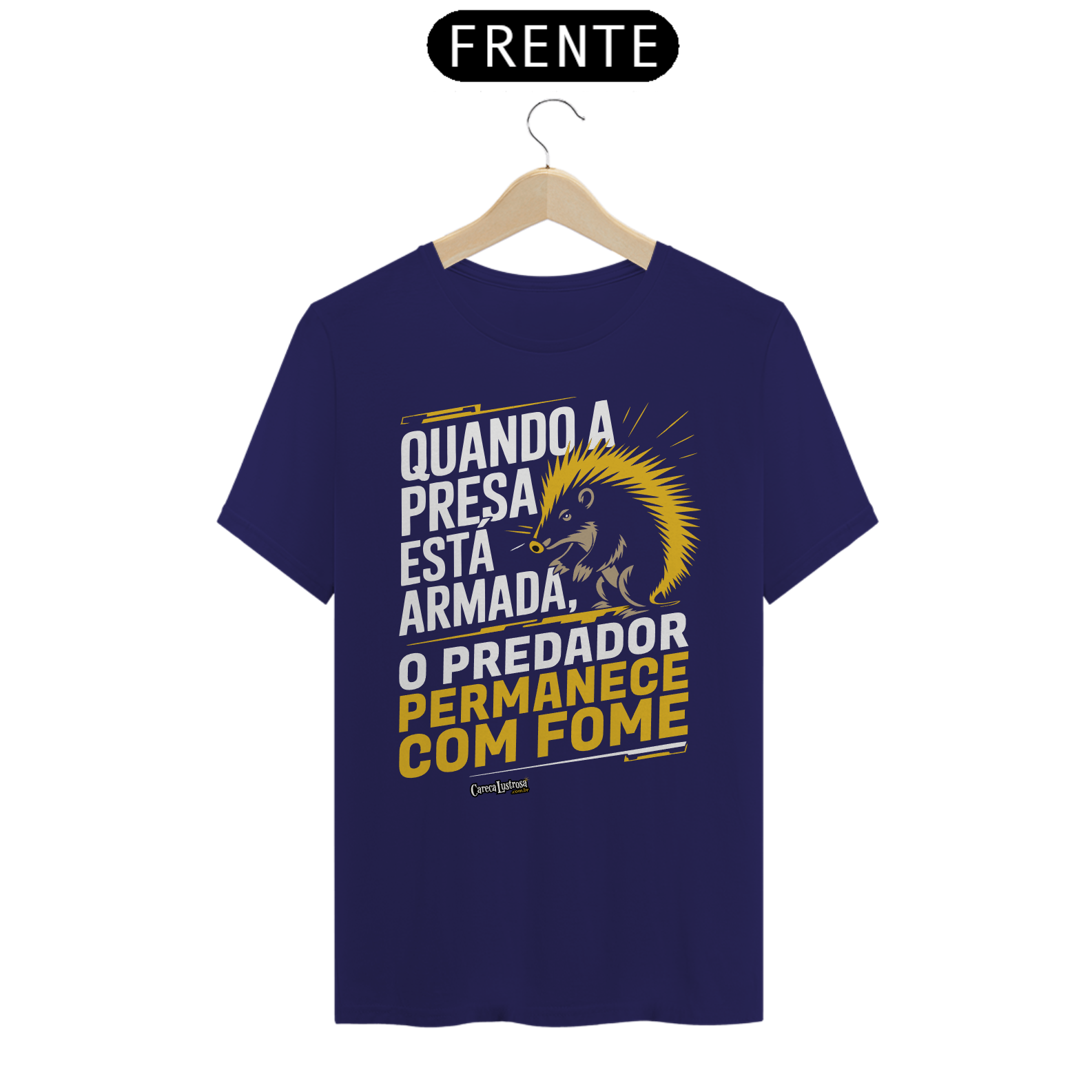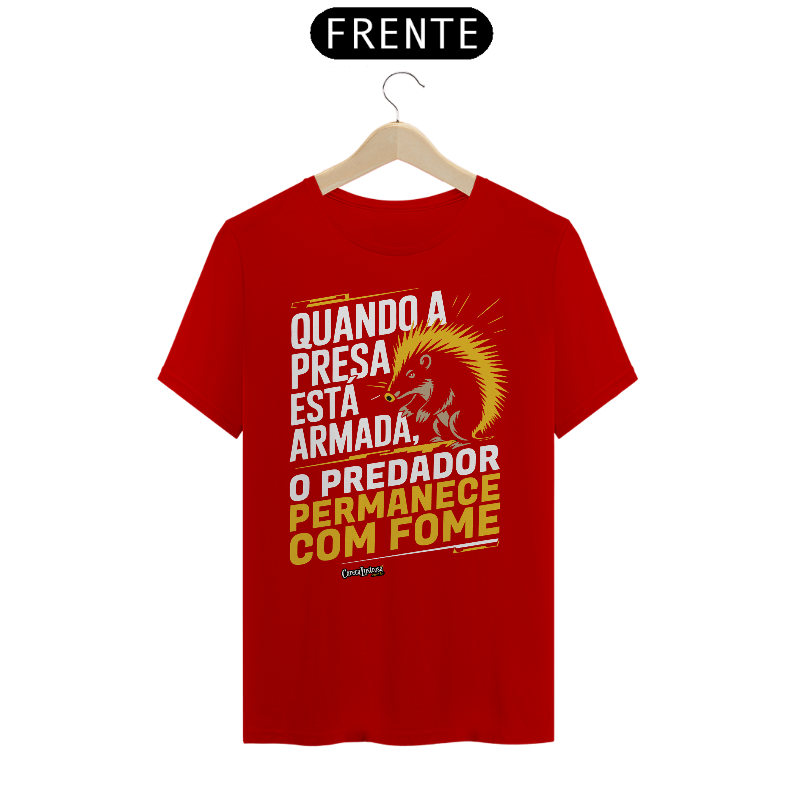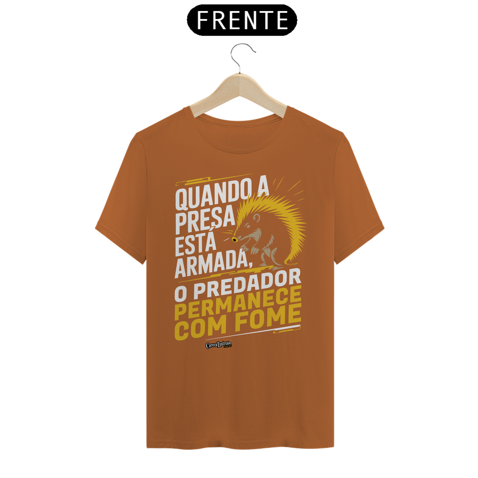Um porco-espinho parece uma presa fácil, até mostrar seu arsenal de combate, assim fazendo seu predador recuar. 'Quando a presa está armada, o predador permanece com fome.' Esta estampa traz uma reflexão poderosa sobre a relação entre o poder e a defesa pessoal, onde quem se prepara para a luta mantém o controle sobre sua própria segurança. Assim como o porco-espinho, que se protege com suas armas naturais, a ideia aqui é clara: a verdadeira liberdade vem de não ser vulnerável. Uma crítica provocativa sobre como, quando estamos prontos para nos defender, o predador — seja ele quem for — fica impotente.