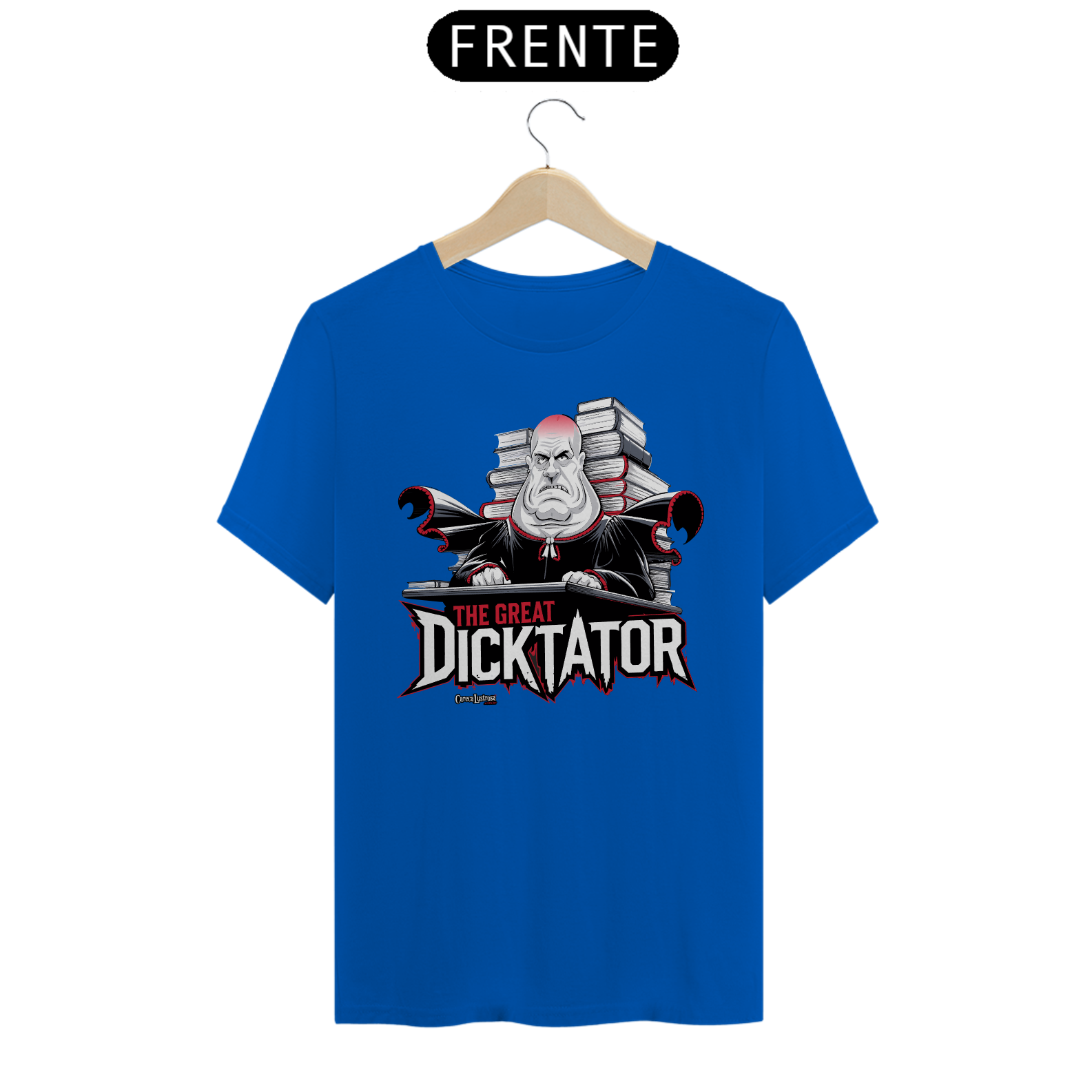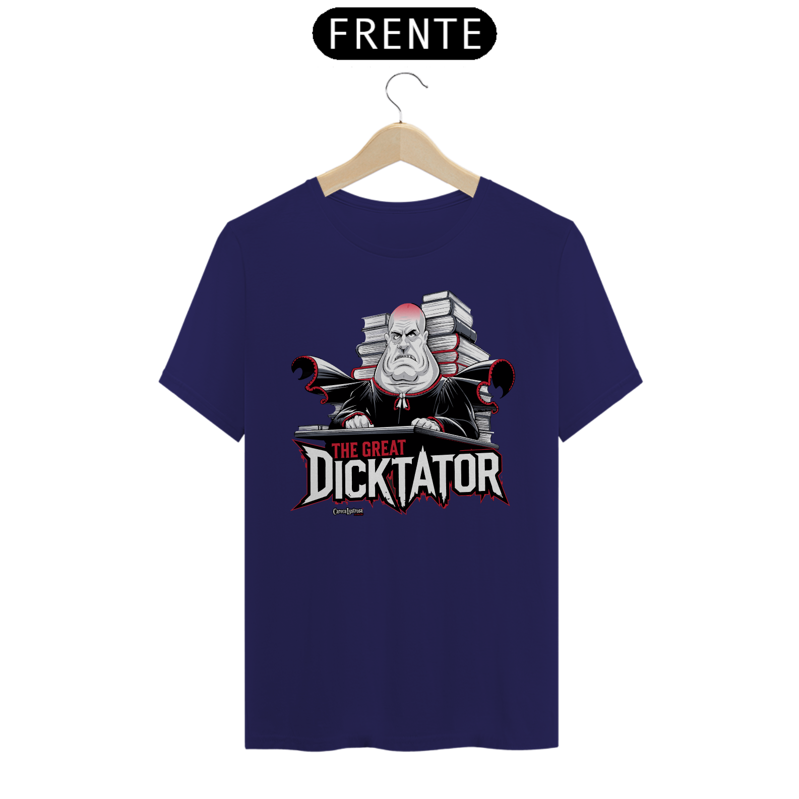 A camiseta "The Great Dicktator" é Estampada com a imagem de um juiz careca, a frase faz uma crítica irreverente à uma figura autoritária que abusa do poder, estabelecendo uma verdadeira "ditadura judicial". A estampa é perfeita para quem não tem medo de expressar sua opinião sobre esses abusos e as figuras que se posicionam acima das leis, tudo isso com uma boa dose de humor ácido. A imagem do personagem com seu semblante imponente, se junta à crítica à centralização do poder nas mãos de uma única pessoa, enquanto o trocadilho garante que a mensagem seja passada com um toque irreverente.