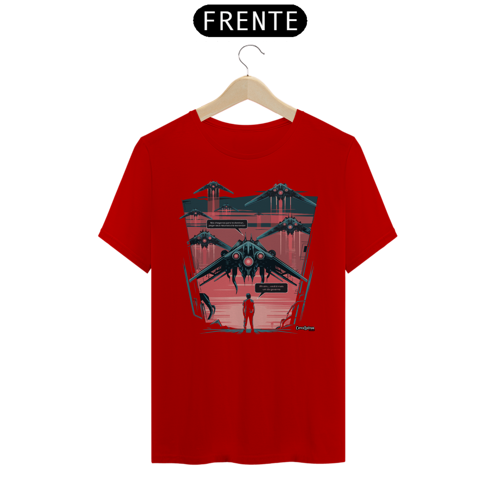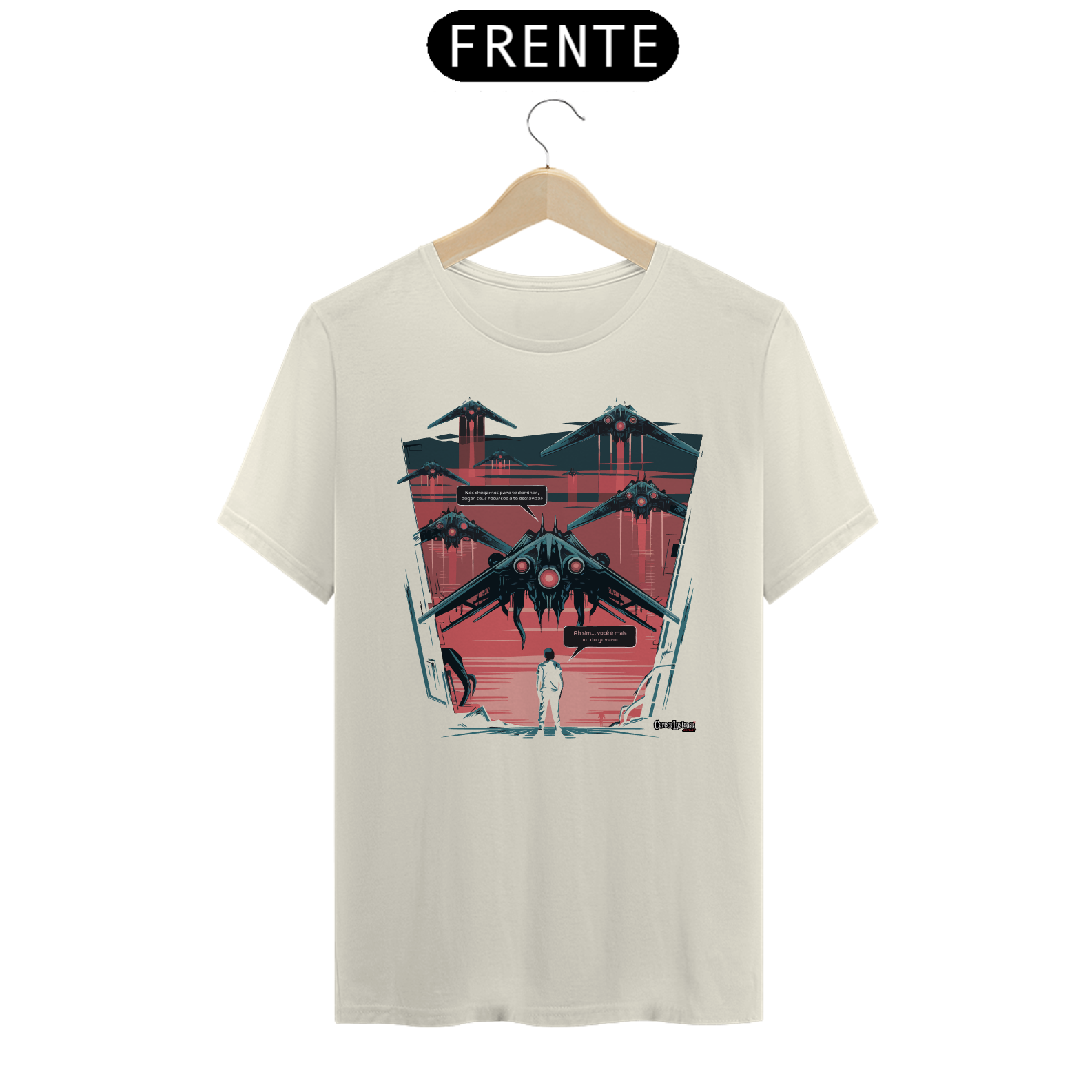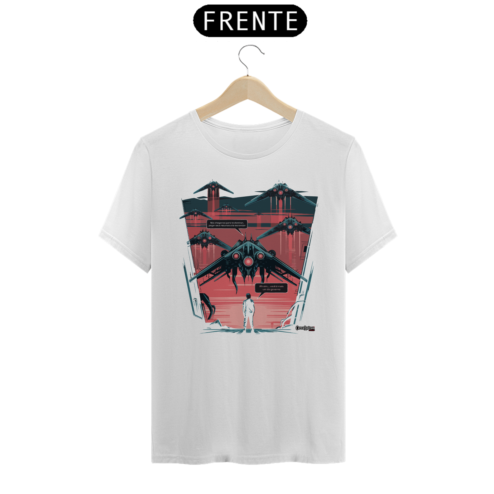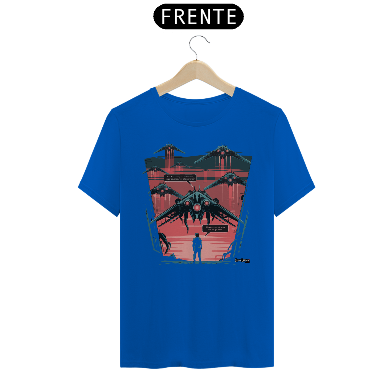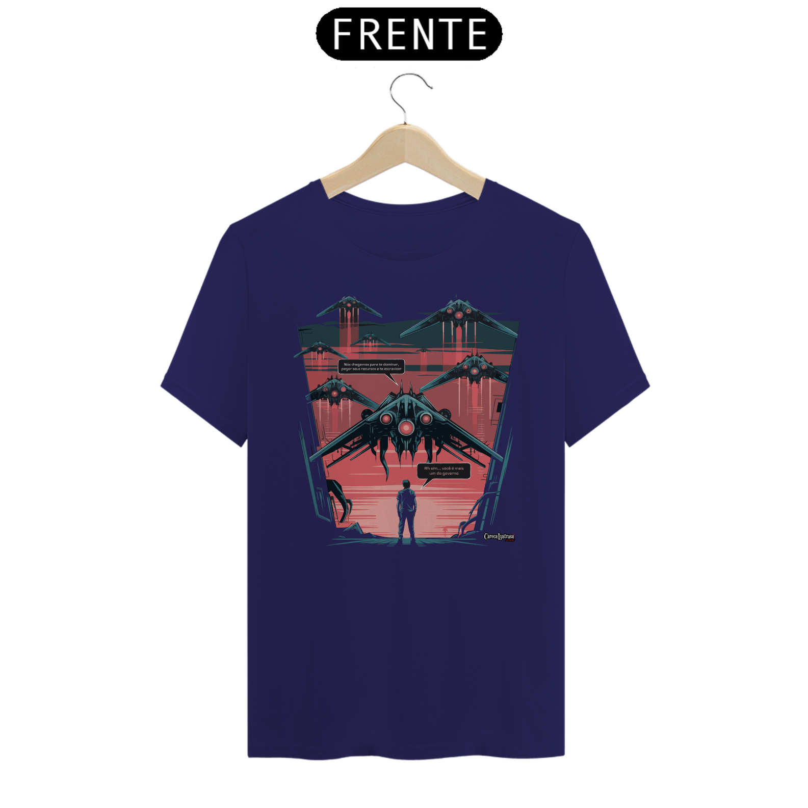 Imagine que naves espaciais estão chegando à Terra e, do alto, a mensagem ecoa: 'Nós chegamos para te dominar, pegar seus recursos e te escravizar.'  Só que, na visão de quem já conhece o jogo, a verdade é mais simples: 'Ah sim, você é mais um do governo.' Esta estampa faz uma crítica ácida e bem-humorada sobre o controle, a exploração e as estruturas de poder que dominam a sociedade, comparando-as com uma invasão alienígena. Para quem está cansado de ser tratado como parte de um sistema que se alimenta dos recursos do povo – e para aqueles que reconhecem a verdadeira natureza das autoridades que nos governam.