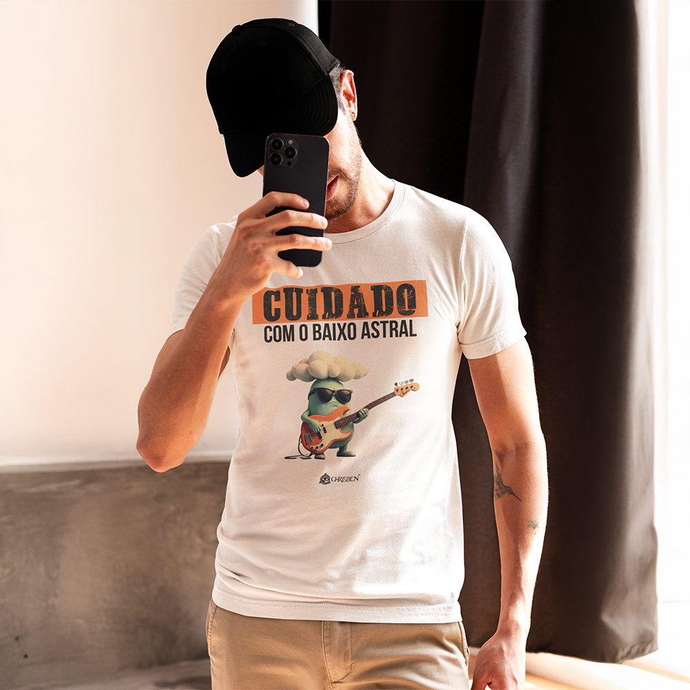 Traga atitude e estilo para o seu guarda-roupa com a camiseta "Cuidado com o Baixo Astral", uma peça única que combina design divertido e qualidade premium.