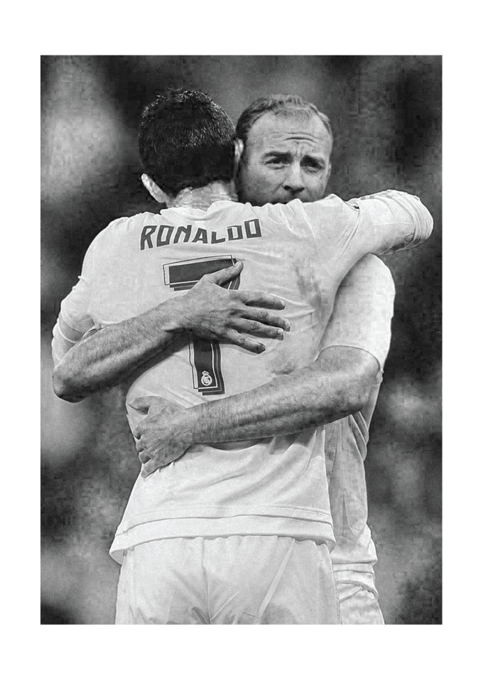 O passado e o presente do Real Madrid em uma montagem que mostra Di Stéfano abraçando Cristiano Ronaldo.