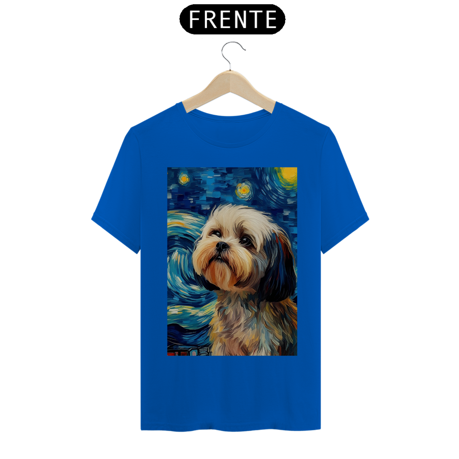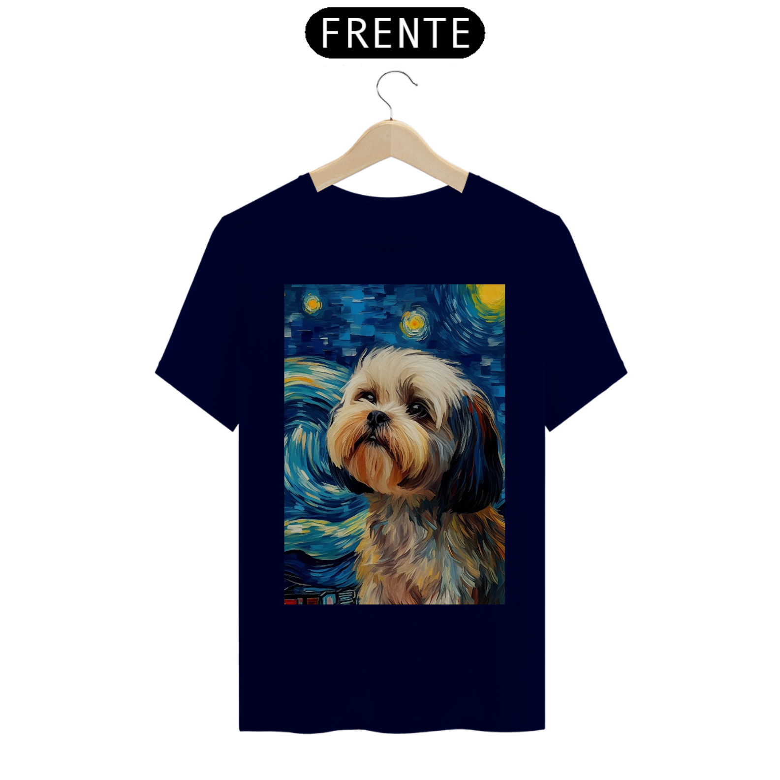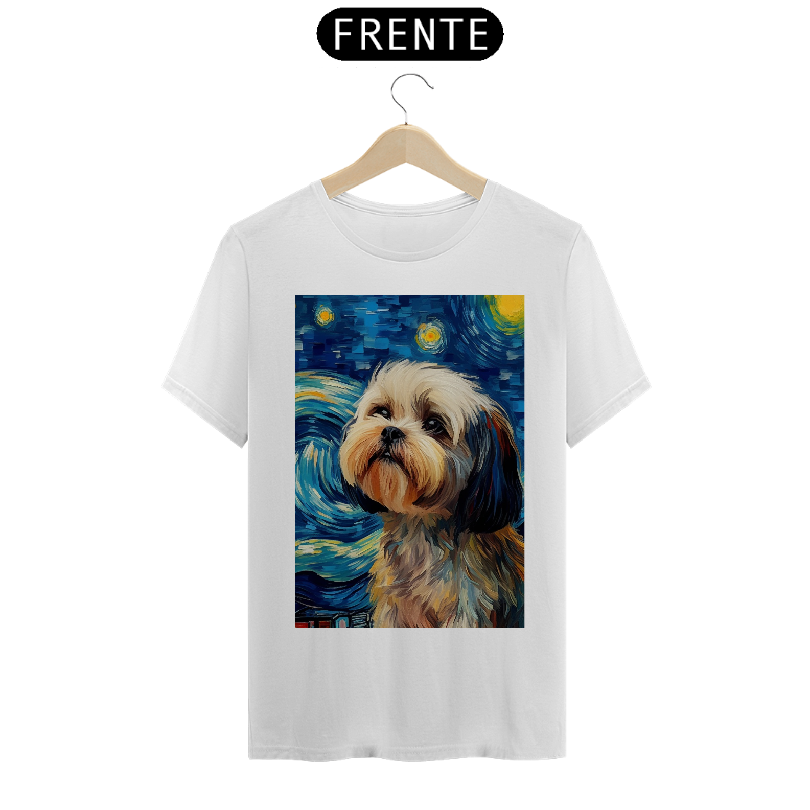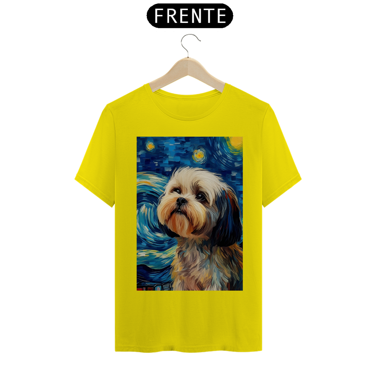 Encante-se com a doçura e a serenidade do "Shih Tzu na Noite Estrelada" com esta camiseta encantadora. Inspirada na beleza majestosa da raça Shih Tzu e na célebre obra "Noite Estrelada" de Van Gogh, esta peça de vestuário combina a graciosidade do animal com a expressividade artística. Sob um céu estrelado e redemoinhos de cor, um Shih Tzu adorável é imortalizado, criando uma visão celestial e encantadora. Vista esta camiseta para levar consigo a beleza da amizade canina e a magia artística de Van Gogh em uma fusão única de estilo e inspiração. "Shih Tzu na Noite Estrelada" é mais do que uma peça de roupa; é uma homenagem à doçura dos animais de estimação e à atemporalidade da arte.
